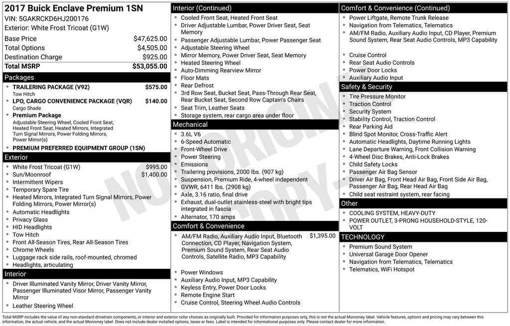 2017 Buick Enclave Premium Group White Frost Tricoat Premium Group FWD 6-Speed Automatic Electronic with Overdrive 3.6L V6 SIDI VVT FWD, 10 Speakers, 120-Volt 3-Prong Household-Style Power Outlet, 3.16 Axle Ratio, 3rd row seats: split-bench, 4-Wheel Disc Brakes, 4500lbs Trailering Package, 7-Passenger Seating, 8-Way Power Driver Seat Adjuster, 8-Way Power Passenger Seat Adjuster, ABS brakes, Air Conditioning, Alloy wheels, AM/FM radio: SiriusXM, Articulating Headlights, Auto tilt-away steering wheel, Auto-dimming door mirrors, Auto-dimming Rear-View mirror, Automatic temperature control, Bose Advanced 10-Speaker Audio System, Bose Performance-Enhanced 10-Speaker System, Bose Sound System, Brake assist, Bumpers: body-color, Cargo Convenience Package, Cargo Net, Cargo Shade Area Cover, CD player, Compass, Delay-off headlights, Driver door bin, Driver vanity mirror, Dual front impact airbags, Dual front side impact airbags, Electronic Stability Control, Emergency communication system: OnStar Guidance, Exterior Parking Camera Rear, Forward Collision Alert & Lane Departure Warning, Four wheel independent suspension, Front anti-roll bar, Front Bucket Seats, Front Center Armrest w/Storage, Front dual zone A/C, Front reading lights, Fully automatic headlights, Garage door transmitter, Heated & Cooled Driver & Front Passenger Seats, Heated door mirrors, Heated front seats, Heated Steering Wheel, Heated steering wheel, Heavy-Duty Cooling System, High intensity discharge headlights: Bi-Xenon, Illuminated entry, Leather steering wheel, Low tire pressure warning, Memory seat, Memory Settings, Navigation System, NavTraffic, Occupant sensing airbag, Outside temperature display, Overhead airbag, Panic alarm, Passenger door bin, Passenger vanity mirror, Perforated Leather-Appointed Seat Trim, Power door mirrors, Power driver seat, Power Liftgate, Power passenger seat, Power steering, Power Tilt & Telescopic Steering Column, Power Tilt-Sliding Moonroof, Power windows, Power-Folding Heated Body-Color Outside Mirrors, Preferred Equipment Group 1SN, Premium Package, Radio data system, Radio: Color Touch AM/FM/CD/DVD/Nav (DISC), Radio: Color Touch AM/FM/CD/Nav w/IntelliLink, Rear air conditioning, Rear anti-roll bar, Rear audio controls, Rear Audio System Controls, Rear Parking Sensors, Rear reading lights, Rear Seat Entertainment System, Rear window defroster, Rear window wiper, Remote keyless entry, Roof rack: rails only, Security system, Side Blind Zone Alert w/Cross Traffic Alert, Speed control, Speed-sensing steering, Spoiler, Steering wheel memory, Steering wheel mounted audio controls, Tachometer, Telescoping steering wheel, Tilt steering wheel, Traction control, Trailer Hitch, Trip computer, Turn signal indicator mirrors, Variably intermittent wipers, Ventilated front seats, Voltmeter, Wheels: 19" Chrome-Clad Cast Aluminum, FWD.