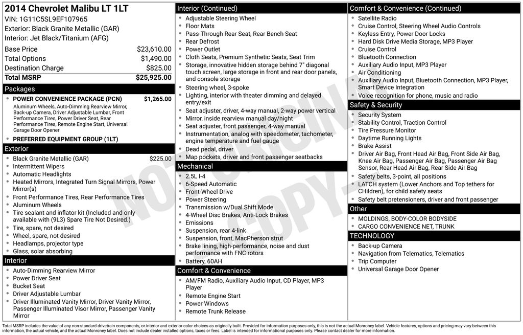 2014 Chevrolet Malibu LT 1LT Black Granite Metallic LT 1LT FWD 6-Speed Automatic Electronic with Overdrive ECOTEC 2.5L I4 DGI DOHC VVT Jet Black/Titanium Cloth, 16" Aluminum Wheels, 17" 5-Spoke Aluminum Wheels, 4-Way Manual Front Passenger Seat Adjuster, 4-Wheel Disc Brakes, 6 Speakers, ABS brakes, Air Conditioning, Alloy wheels, AM/FM radio: SiriusXM, AM/FM Stereo w/CD Player & MP3 Playback, Audio System Feature, Body-Color Bodyside Moldings, Brake assist, Bumpers: body-color, CD player, Chevrolet MyLink, Compass, Delay-off headlights, Driver 8-Way Power Seat Adjuster, Driver door bin, Driver Power Lumbar Seat Adjuster, Driver vanity mirror, Dual front impact airbags, Dual front side impact airbags, Electronic Stability Control, Emergency communication system: OnStar Directions & Connections, Four wheel independent suspension, Front anti-roll bar, Front Bucket Seats, Front Center Armrest w/Storage, Front reading lights, Fully automatic headlights, Heated door mirrors, Illuminated entry, Inside Rear-View Auto-Dimming Mirror, Knee airbag, Low tire pressure warning, Occupant sensing airbag, Outside temperature display, Overhead airbag, Overhead console, Panic alarm, Passenger door bin, Passenger vanity mirror, Power Convenience Package, Power door mirrors, Power driver seat, Power steering, Power windows, Preferred Equipment Group 1LT, Premium Cloth/Leatherette Seat Trim, Radio data system, Rear anti-roll bar, Rear seat center armrest, Rear side impact airbag, Rear Vision Camera, Rear window defroster, Remote keyless entry, Remote Vehicle Starter System, Security system, SIRIUSXM Satellite Radio, Speed control, Split folding rear seat, Steering wheel mounted audio controls, Tachometer, Telescoping steering wheel, Tilt steering wheel, Traction control, Trip computer, Trunk Cargo Convenience Net, Turn signal indicator mirrors, Universal Home Remote, Variably intermittent wipers, Jet Black/Titanium Cloth.