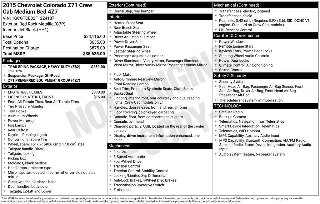 2015 Chevrolet Colorado Z71 Red Rock Metallic Z71 4WD 6-Speed Automatic 3.6L V6 DGI DOHC VVT 4WD, 3.42 Rear Axle Ratio, 4-Way Power Front Passenger Seat Adjuster, 4-Wheel Disc Brakes, 6 Speakers, 6-Speaker Audio System Feature, ABS brakes, Air Conditioning, Alloy wheels, AM/FM radio: SiriusXM, Auto-dimming Rear-View mirror, Automatic temperature control, Bumpers: body-color, Cloth/Leatherette Seat Trim, Compass, Delay-off headlights, Driver 4-Way Power Seat Adjuster, Driver door bin, Driver vanity mirror, Dual front impact airbags, Dual front side impact airbags, Electronic Stability Control, Emergency communication system: OnStar Directions & Connections, Exterior Parking Camera Rear, Front anti-roll bar, Front Bucket Seats, Front Center Armrest, Front fog lights, Front License Plate Kit, Front reading lights, Front wheel independent suspension, Fully automatic headlights, Heated Driver & Front Passenger Seats, Heated front seats, Heavy-Duty Trailering Package, Illuminated entry, Low tire pressure warning, Occupant sensing airbag, Outside temperature display, Overhead airbag, Overhead console, Panic alarm, Passenger door bin, Passenger vanity mirror, Power door mirrors, Power Driver Lumbar Control Seat Adjuster, Power driver seat, Power Passenger Lumbar Control Seat Adjuster, Power passenger seat, Power steering, Power windows, Preferred Equipment Group 4Z7, Premium audio system: Chevrolet MyLink, Radio data system, Radio: AM/FM/SiriusXM w/Chevrolet MyLink, Rear reading lights, Rear seat center armrest, Rear step bumper, Rear window defroster, Remote keyless entry, Security system, SiriusXM Satellite Radio, Speed control, Speed-sensing steering, Steering wheel mounted audio controls, Tachometer, Telescoping steering wheel, Tilt steering wheel, Tow/Haul Mode, Traction control, Transfer Case Shield, Trip computer, Variably intermittent wipers, Wheel Flares, Wheels: 17" x 8" Dark Argent Metallic Cast Alloy, 4WD.