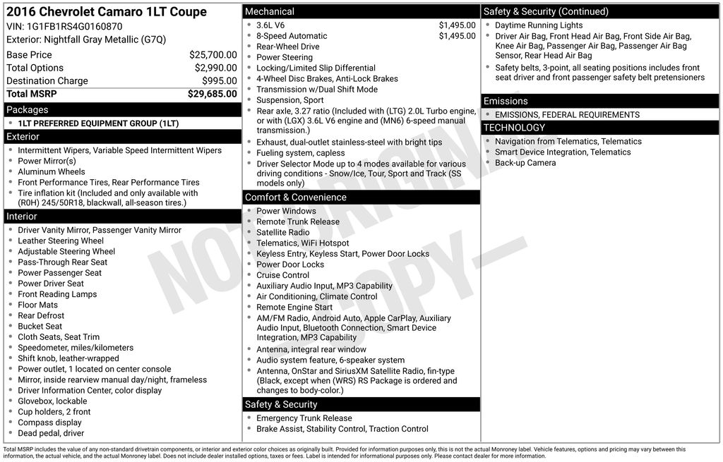 This 2016 Camaro 1LT is being sold As-Is Wholesale to the Public. It has some front-end body damage and is priced accordingly for a buyer looking for a project car or budget-friendly sports coupe.