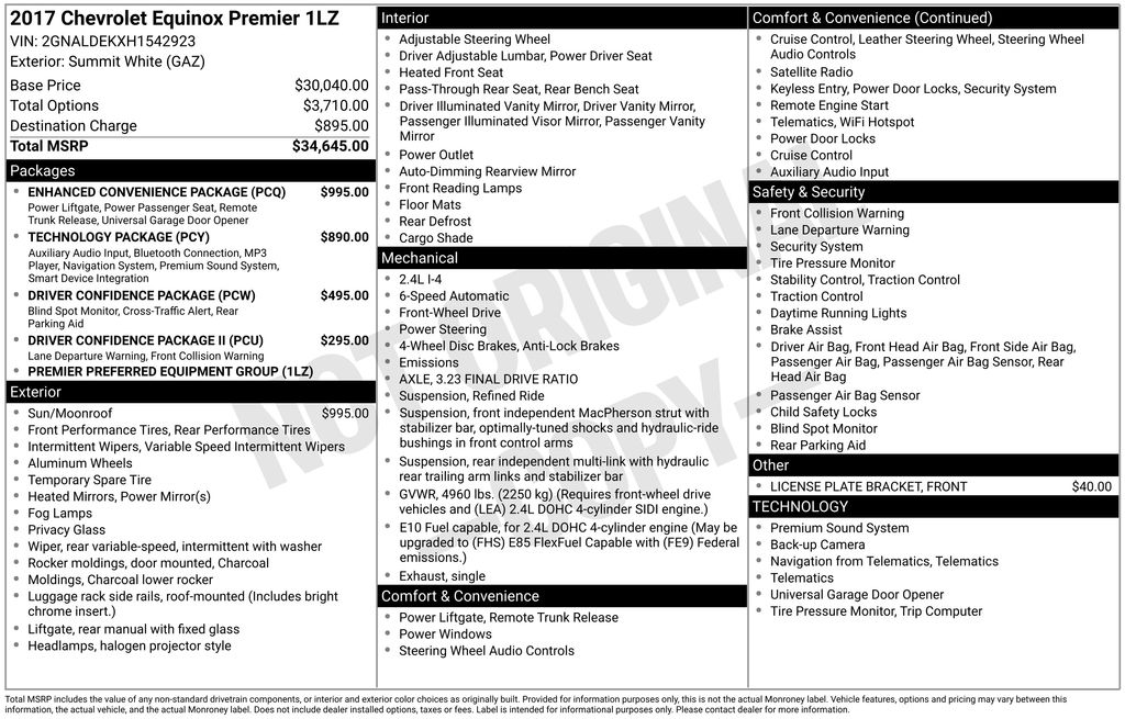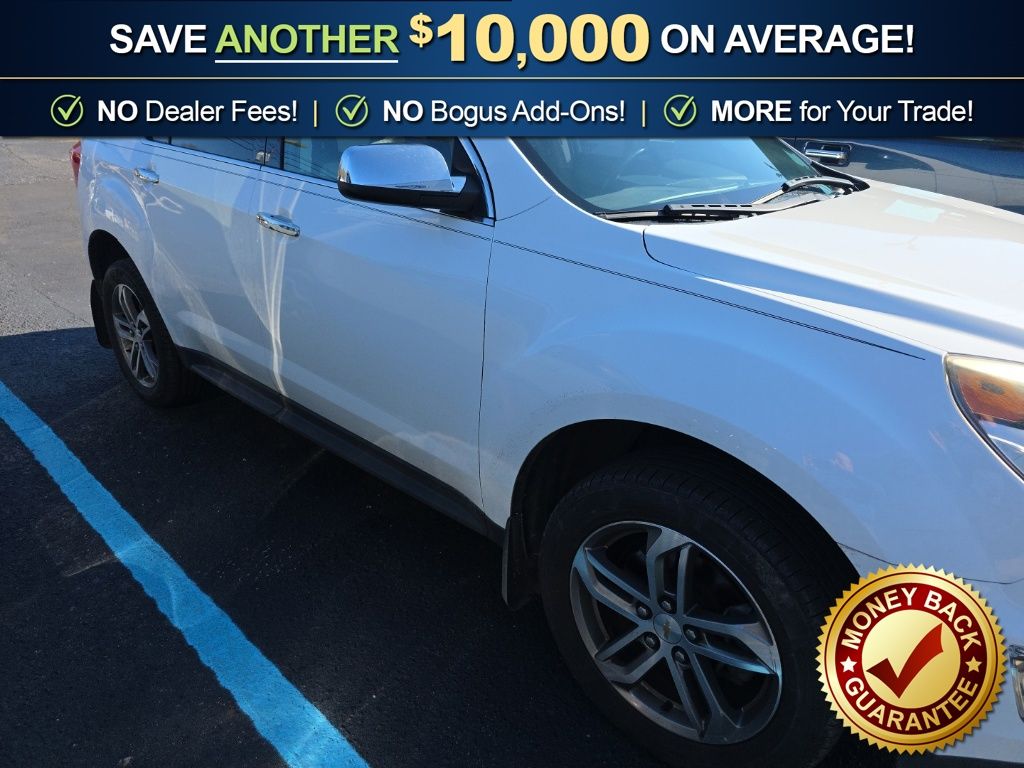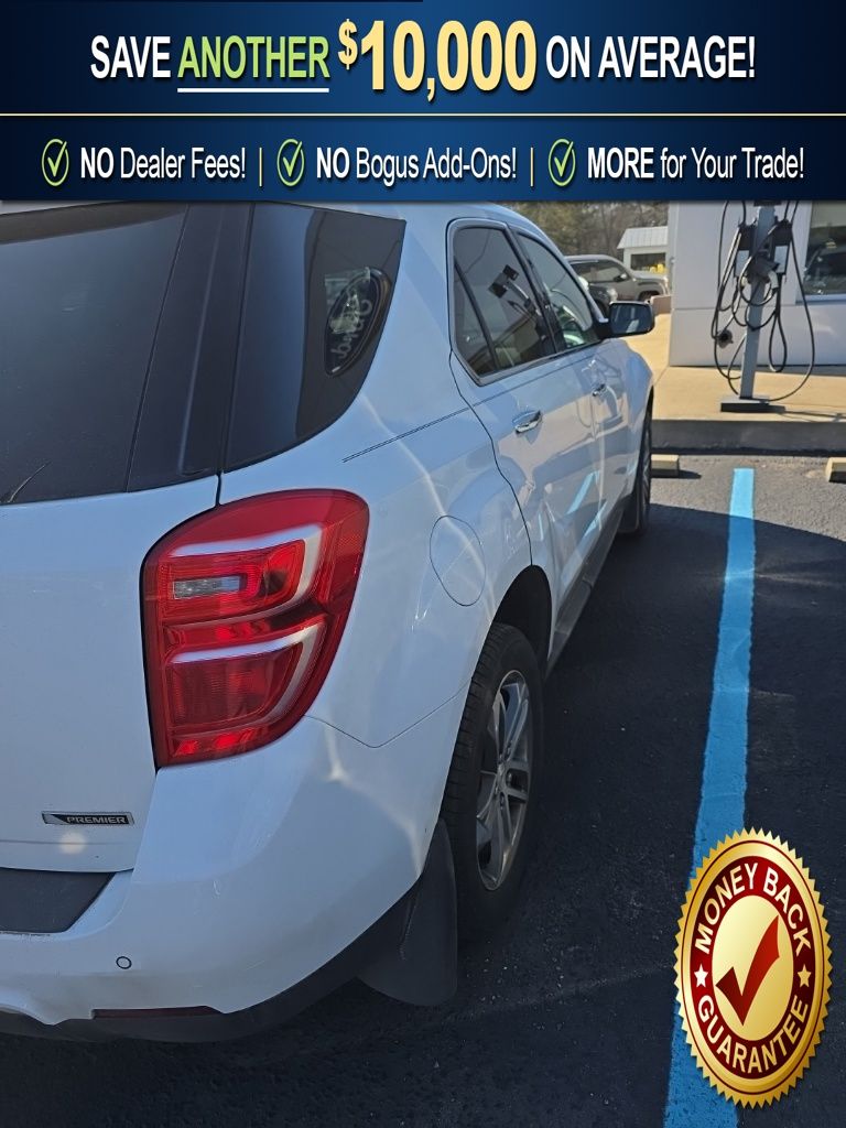 18" Aluminum Wheels, 3.23 Axle Ratio, 4-Wheel Disc Brakes, 6 Speaker Audio System Feature, 6 Speakers, 8-Way Power Driver Seat Adjuster, 8-Way Power Front Passenger Seat Adjuster, ABS brakes, Air Conditioning, Alloy wheels, AM/FM radio: SiriusXM, Auto-dimming Rear-View mirror, Automatic temperature control, Bluetooth® For Phone, Brake assist, Bumpers: body-color, Compass, Delay-off headlights, Deluxe Front Bucket Seats, Driver Confidence Package, Driver Confidence Package II, Driver door bin, Driver vanity mirror, Dual front impact airbags, Dual front side impact airbags, E10 Fuel Capable, Electronic Stability Control, Emergency communication system: OnStar Guidance, Enhanced Convenience Package, Exterior Parking Camera Rear, Forward Collision Alert, Four wheel independent suspension, Front anti-roll bar, Front Bucket Seats, Front Center Armrest, Front fog lights, Front License Plate Bracket, Front reading lights, Fully automatic headlights, Heated door mirrors, Heated Driver & Front Passenger Seats, Heated front seats, Illuminated entry, Lane Departure Warning System, Low tire pressure warning, Memory seat, Occupant sensing airbag, Outside temperature display, Overhead airbag, Panic alarm, Passenger door bin, Passenger vanity mirror, Perforated Leather-Appointed Seat Trim, Pioneer Premium Audio System Feature, Power door mirrors, Power driver seat, Power Programmable Rear Liftgate, Power steering, Power Tilt-Sliding Sunroof w/Express-Open, Power windows, Preferred Equipment Group 1LZ, Premium audio system: Chevrolet MyLink, Radio data system, Radio: Chevrolet MyLink Audio System, Radio: Chevrolet MyLink Audio System w/Navigation, Rear anti-roll bar, Rear Cross-Traffic Alert, Rear Park Assist, Rear seat center armrest, Rear window defroster, Rear window wiper, Remote keyless entry, Roof rack: rails only, Security system, Side Blind Zone Alert, SiriusXM Satellite Radio, Speed control, Speed-sensing steering, Split folding rear seat, Spoiler, Steering wheel mounted audio controls, Tachometer, Technology Package, Telescoping steering wheel, Tilt steering wheel, Traction control, Trip computer, Universal Home Remote, Variably intermittent wipers. 2017 Chevrolet Equinox Premier