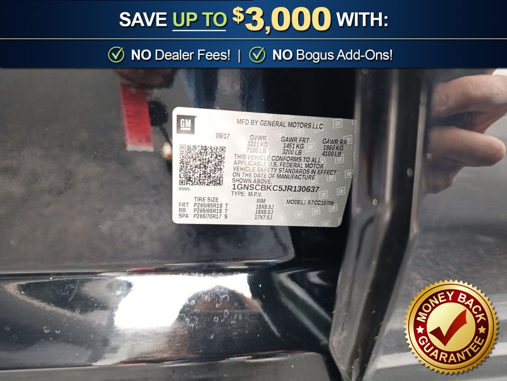 Recent Arrival! Jet Black/Dark Ash Leather, 18" x 8.5" Aluminum Wheels, 1st & 2nd Row Color-Keyed Carpeted Floor Mats, 2nd Row 60/40 Split-Folding Manual Bench, 3.08 Rear Axle Ratio, 3rd Row Manual 60/40 Split-Folding Fold Flat Bench, 3rd row seats: split-bench, 4-Wheel Antilock Disc Brakes w/Brake Assist, 4-Wheel Disc Brakes, 5 12-Volt Auxiliary Power Outlets, 9 Speakers, ABS brakes, Adjustable pedals, Air Conditioning, Alloy wheels, AM/FM radio: SiriusXM, Apple CarPlay/Android Auto, Auto High-beam Headlights, Auto-Dimming Inside Rear-View Mirror, Auto-dimming Rear-View mirror, Automatic temperature control, Black Assist Steps, Bluetooth® For Phone, Bose Premium 9-Speaker System, Brake assist, Bumpers: body-color, Cargo Net, CD player, Color-Keyed Carpeting Floor Covering, Compass, Delay-off headlights, Driver door bin, Driver Inboard & Front Passenger Airbags, Driver vanity mirror, Dual front impact airbags, Dual front side impact airbags, Electronic Cruise Control w/Set & Resume Speed, Electronic Stability Control, Emergency communication system: OnStar Guidance, Enhanced Driver Alert Package (Y86), Extended-Range Remote Keyless Entry, Exterior Parking Camera Rear, Floor Console, Forward Collision Alert, Front anti-roll bar, Front Bucket Seats, Front Center Armrest, Front dual zone A/C, Front Heated Reclining Bucket Seats, Front Passenger 6-Way Power Seat Adjuster, Front reading lights, Front wheel independent suspension, Fully automatic headlights, Garage door transmitter, HD Radio, Heated door mirrors, Heated front seats, Illuminated entry, IntelliBeam Headlamps, Lane Keep Assist w/Lane Departure Warning, Leather-Appointed Seat Trim, Leather-Wrapped Steering Wheel, Low Speed Forward Automatic Braking, Low tire pressure warning, Memory seat, Memory Settings, Occupant sensing airbag, OnStar Basic Plan For 5 Years, Outside temperature display, Overhead airbag, Overhead console, Panic alarm, Passenger door bin, Passenger vanity mirror, Pedal memory, Power door mirrors, Power driver seat, Power Liftgate, Power passenger seat, Power steering, Power windows, Power-Adjustable Accelerator & Brake Pedals, Preferred Equipment Group 1LT, Premium audio system: Chevrolet MyLink, Premium Smooth Ride Suspension Package, Radio: Chevrolet MyLink AM/FM Stereo, Radio: Chevrolet MyLink w/Nav/AM/FM Stereo, Rain sensing wipers, Rear air conditioning, Rear anti-roll bar, Rear Park Assist w/Audible Warning, Rear reading lights, Rear seat center armrest, Rear window defroster, Rear window wiper, Remote keyless entry, Remote Vehicle Start, Roof rack: rails only, Roof-Mounted Luggage Rack Side Rails, Security system, Single-Slot CD/MP3 Player, SiriusXM NavTraffic, SiriusXM Satellite Radio, Speed control, Speed-sensing steering, Split folding rear seat, Spoiler, Steering wheel mounted audio controls, Tachometer, Telescoping steering wheel, Tilt steering wheel, Traction control, Trip computer, Universal Home Remote, Variably intermittent wipers, Voltmeter, Jet Black/Dark Ash Leather.