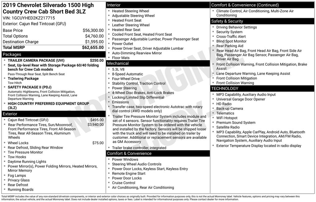 Recent Arrival! 8-Speed Automatic, 4WD, Jet Black Leather, 10-Way Power Driver Seat w/Lumbar, 10-Way Power Passenger Seat Adjuster w/Lumbar, 12-Volt Rear Auxiliary Power Outlet, 120-Volt Bed Mounted Power Outlet, 120-Volt Instrument Panel Power Outlet, 170 Amp Alternator, 2nd Row Heated Outboard Seats, 3.23 Rear Axle Ratio, 4-Wheel Disc Brakes, 7 Speakers, 8" Driver Information Center, ABS brakes, Advanced Trailering System, Air Conditioning, All-Weather Floor Liner (LPO), Alloy wheels, AM/FM radio: SiriusXM, Apple CarPlay/Android Auto, Auto-dimming door mirrors, Auto-Dimming Inside Rear-View Mirror, Auto-dimming Rear-View mirror, Automatic temperature control, Auxiliary External Transmission Oil Cooler, Bluetooth® For Phone, Brake assist, Bumpers: body-color, Chevrolet Connected Access, Chevrolet w/4G LTE, Chevytec Spray-On Black Bedliner, Chrome Assist Steps, Chrome Grille, Chrome Recovery Hooks, Color-Keyed Carpeting Floor Covering, Compass, Deep-Tinted Glass, Delay-off headlights, Driver door bin, Driver Memory, Driver vanity mirror, Dual Exhaust w/Polished Outlets, Dual front impact airbags, Dual front side impact airbags, Electric Rear-Window Defogger, Electrical Lock Control Steering Column, Electronic Cruise Control, Electronic Stability Control, Floor Mounted Console, Following Distance Indicator, Forward Collision Alert, Front anti-roll bar, Front Bucket Seats, Front Carpeted Floor Mats, Front Center Armrest w/Storage, Front dual zone A/C, Front fog lights, Front LED Fog Lamps, Front License Plate Kit, Front Pedestrian Braking, Front reading lights, Front wheel independent suspension, Fully automatic headlights, Garage door transmitter, HD Radio, HD Rear Vision Camera, Heated door mirrors, Heated Driver & Front Passenger Seats, Heated front seats, Heated rear seats, Heated Steering Wheel, Heated steering wheel, Heavy Duty Suspension, Heavy-Duty Rear Locking Differential, High Country Deluxe, Hitch Guidance, Hitch Guidance w/Hitch View, Illuminated entry, Integrated Trailer Brake Controller, IntelliBeam Automatic High Beam On/Off, Keyless Open & Start, Lane Change Alert w/Side Blind Zone Alert, Lane Keep Assist w/Lane Departure Warning, Leather Wrapped Steering Wheel, LED Cargo Area Lighting, Left & Right Side Mirror Cameras, Low Speed Forward Automatic Braking, Low tire pressure warning, Manual Tilt/Telescoping Steering Column, Memory seat, Navigation System, Occupant sensing airbag, OnStar & Chevrolet Connected Services Capable, Outside Heated Power-Adjustable Mirrors, Outside temperature display, Overhead airbag, Overhead console, Painted Mirror Caps, Panic alarm, Passenger door bin, Passenger vanity mirror, Perforated Leather Appointed Seat Trim, Power Door Locks, Power door mirrors, Power driver seat, Power Front Passenger Windows w/Express Up/Down, Power Front Windows w/Driver Express Up/Down, Power passenger seat, Power Rear Windows w/Express Down, Power Sliding Rear Window w/Rear Defogger, Power steering, Power Sunroof, Power windows, Preferred Equipment Group 3LZ, Premium audio system: Chevrolet Infotainment System 3, Radio data system, Radio: Chevrolet Infotainment 3 Premium System, Rear Carpeted Floor Mats, Rear Cross Traffic Alert, Rear Dual USB Charging-Only Ports, Rear reading lights, Rear seat center armrest, Rear step bumper, Rear Wheelhouse Liners, Rear window defroster, Remote keyless entry, Remote Vehicle Starter System, Safety Alert Seat, Safety Package II, Security system, SiriusXM Radio, Speed control, Speed-sensing steering, Split folding rear seat, Steering Wheel Audio Controls, Steering wheel mounted audio controls, Tachometer, Telescoping steering wheel, Theft Deterrent System (Unauthorized Entry), Tilt steering wheel, Traction control, Trailer Camera Package, Trailer Tire Pressure Monitor System, Trailering Package, Trip computer, Ultrasonic Front & Rear Park Assist, Universal Home Remote, Up-Level Rear Seat w/Storage Package, Variably intermittent wipers, Ventilated Driver & Front Passenge