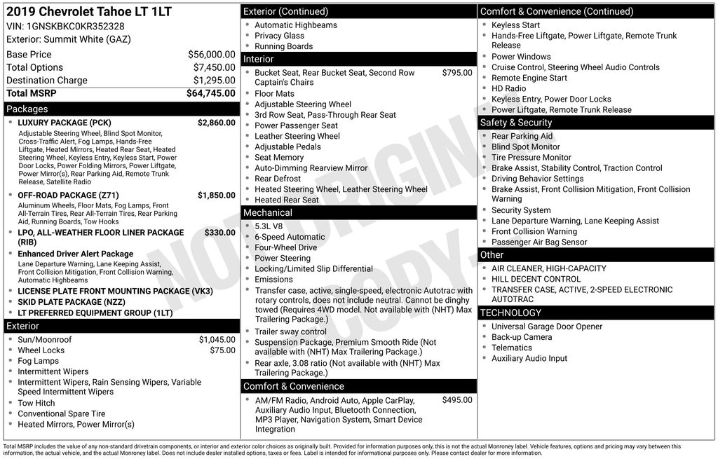 2019 Chevrolet Tahoe LT 4WD 6-Speed Automatic Electronic with Overdrive EcoTec3 5.3L V8 Summit White