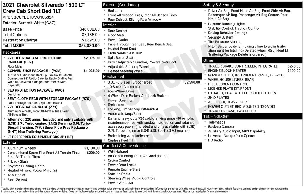 2021 Chevrolet Silverado 1500 LT LT1 Summit White LT LT1 4WD 10-Speed Automatic 3.0L I6 10-Speed Automatic, 4WD, Black Cloth, 10-Way Power Driver Seat w/Lumbar, 12-Volt Rear Auxiliary Power Outlet, 120-Volt Bed Mounted Power Outlet, 120-Volt Instrument Panel Power Outlet, 2 USB Ports, 2 USB Ports (First Row), 220 Amp Alternator, 3.23 Rear Axle Ratio, 4-Wheel Disc Brakes, 4.2" Diagonal Color Display Driver Info Center, 40/20/40 Front Split-Bench Seat, 4G LTE Wi-Fi Hot Spot Capable, 6 Speakers, ABS brakes, Air Conditioning, All-Star Edition, All-Weather Floor Liner (LPO) (AAK), Alloy wheels, AM/FM radio: SiriusXM, Apple CarPlay/Android Auto, Auto-Locking Rear Differential, Automatic temperature control, Bed Protection Package, Bluetooth® For Phone, Brake assist, Bumpers: chrome, Chevrolet Connected Access Capable, Chevytec Spray-On Black Bedliner, Chrome Grille, Chrome Mirror Caps, Cloth Rear Seat w/Storage Package, Cloth Seat Trim, Color-Keyed Carpeting Floor Covering, Compass, Convenience Package, Convenience Package II, Deep-Tinted Glass, Delay-off headlights, Driver door bin, Driver vanity mirror, Dual Exhaust w/Polished Outlets, Dual front impact airbags, Dual front side impact airbags, Dual-Zone Automatic Climate Control, Electric Rear-Window Defogger, Electrical Lock Control Steering Column, Electronic Cruise Control, Electronic Stability Control, Engine Block Heater, EZ Lift Power Lock & Release Tailgate, Front anti-roll bar, Front Center Armrest w/Storage, Front dual zone A/C, Front Frame-Mounted Black Recovery Hooks, Front License Plate Kit, Front reading lights, Front Rubberized Vinyl Floor Mats, Front wheel independent suspension, Fully automatic headlights, HD Radio, HD Rear Vision Camera, Heated door mirrors, Heated Driver & Front Outboard Passenger Seats, Heated front seats, Heated Steering Wheel, Heated steering wheel, Heavy Duty Suspension, Heavy-Duty Air Filter, Hill Descent Control, Hitch Guidance, Illuminated entry, Integrated Trailer Brake Controller, Keyless Open & Start, Leather Wrapped Steering Wheel, LED Cargo Area Lighting, Low tire pressure warning, Manual Tilt/Telescoping Steering Column, Occupant sensing airbag, Off-Road Suspension, OnStar & Chevrolet Connected Services Capable, Outside temperature display, Overhead airbag, Overhead console, Panic alarm, Passenger door bin, Passenger vanity mirror, Power Door Locks, Power door mirrors, Power driver seat, Power Front Windows w/Driver Express Up/Down, Power Front Windows w/Passenger Express Down, Power Rear Windows w/Express Down, Power Sliding Rear Window w/Rear Defogger, Power steering, Power windows, Preferred Equipment Group 1LT, Premium audio system: Chevrolet Infotainment 3, Radio data system, Radio: Chevrolet Infotainment 3 Plus System, Radio: Chevrolet Infotainment 3 System, Rear 60/40 Folding Bench Seat (Folds Up), Rear Dual USB Charging-Only Ports, Rear reading lights, Rear Rubberized-Vinyl Floor Mats, Rear step bumper, Rear Vision Camera, Rear Wheelhouse Liners, Rear window defroster, Remote keyless entry, Remote Vehicle Starter System, Security system, SiriusXM Radio, SiriusXM w/360L, Speed control, Speed-sensing steering, Split folding rear seat, Standard Tailgate, Steering Wheel Audio Controls, Steering wheel mounted audio controls, Tachometer, Telescoping steering wheel, Theft Deterrent System (Unauthorized Entry), Tilt steering wheel, Traction control, Trailering Package, Trip computer, Universal Home Remote, Variably intermittent wipers, Voltmeter, Wheels: 17" x 8" Bright Silver Painted Aluminum, Wheels: 18" x 8.5" Bright Silver Painted Aluminum, Wheels: 20" x 9" Painted Aluminum, Wireless Phone Projection, Z71 Off-Road & Protection Package, Z71 Off-Road Package, 10-Speed Automatic, 4WD, Black Cloth.