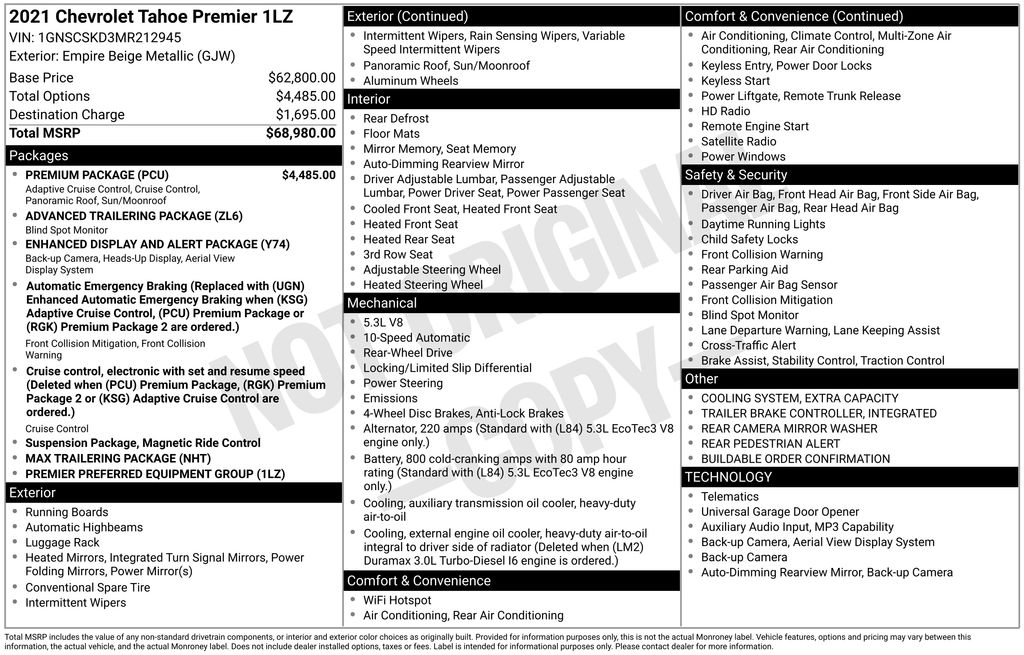 2021 Chevrolet Tahoe Premier Empire Beige Metallic Premier RWD 10-Speed Automatic with Overdrive EcoTec3 5.3L V8 Jet Black/Maple Sugar Leather, 10 Speakers, 12-Way Power Driver & Passenger Seat Adjusters, 15" Diagonal Multi-Color Head-Up Display, 1st & 2nd Row Color-Keyed Carpeted Floor Mats, 2 USB Data Ports, 20" x 9" Polished Aluminum Wheels, 3.23 Rear Axle Ratio, 3rd Row 60/40 Power-Folding Split-Bench Seat, 3rd row seats: split-bench, 4-Wheel Disc Brakes, ABS brakes, Adaptive Cruise Control, Adaptive suspension, Advanced Trailering Package, Advanced Trailering System, Air Conditioning, Alloy wheels, AM/FM radio: SiriusXM with 360L, Apple CarPlay/Android Auto, Auto High-beam Headlights, Auto-dimming door mirrors, Auto-Dimming Inside Rear-View Mirror, Auto-dimming Rear-View mirror, Auto-leveling suspension, Automatic Heated Steering Wheel, Automatic temperature control, Bose 10-Speaker Centerpoint Surround Audio Sys Ft, Brake assist, Bright Front & Rear Door Sill Plates, Bumpers: body-color, Chrome Door Handles w/Body-Color Strip, Chrome Mirror Caps, Color-Keyed Carpeting Floor Covering, Compass, Delay-off headlights, Driver & Front Outboard Passenger Airbags, Driver door bin, Driver vanity mirror, Dual Exhaust System, Dual front impact airbags, Dual front side impact airbags, Dual-Pane Power Panoramic Sunroof, Electronic Stability Control, Emergency communication system: OnStar and Chevrolet connected services capable, Enhanced Automatic Emergency Braking, Enhanced Display & Alert Package, Enhanced Driver Information Center, Extra Capacity Cooling System, Floor Console w/Storage Area, Four wheel independent suspension, Front & Rear Park Assist, Front anti-roll bar, Front Bucket Seats, Front Center Armrest, Front dual zone A/C, Front High-Back Reclining Bucket Seats, Front reading lights, Fully automatic headlights, Garage door transmitter, Hands-Free Rear Power Programmable Liftgate, HD Radio, HD Surround Vision, Heated & Ventilated Driver & Front Passenger Seats, Heated 2nd Row Outboard Seats, Heated door mirrors, Heated Driver & Front Passenger Seats, Heated front seats, Heated rear seats, Heated steering wheel, Hitch Guidance w/Hitch View, Illuminated entry, Infotainment Display, Inside Rearview Auto-Dimming Rear Camera Mirror, Integrated Trailer Brake Controller, Lane Change Alert w/Side Blind Zone Alert, Lane Keep Assist w/Lane Departure Warning, Leather steering wheel, Leather-Wrapped Steering Wheel, LED Daytime Running Lamps, Low tire pressure warning, Magnetic Ride Control Suspension, Max Trailering Package, Memory seat, Memory Settings, Navigation System, Occupant sensing airbag, Outside Heated Power-Adjustable Mirrors, Outside temperature display, Overhead airbag, Overhead console, Panic alarm, Passenger door bin, Passenger vanity mirror, Perforated Leather Seat Trim, Power door mirrors, Power driver seat, Power Liftgate, Power passenger seat, Power Release 2nd Row Bucket Seats, Power steering, Power Tilt & Telescopic Steering Column, Power windows, Preferred Equipment Group 1LZ, Premium audio system: Chevrolet Infotainment 3, Premium Package, Radio: Chevrolet Infotainment 3 Premium System, Rain sensing wipers, Rear air conditioning, Rear anti-roll bar, Rear Camera Mirror Washer, Rear Cross Traffic Alert, Rear Pedestrian Alert, Rear reading lights, Rear window defroster, Rear window wiper, Remote keyless entry, Remote Start, Roof rack: rails only, Safety Alert Seat, Security system, SiriusXM NavTraffic, SiriusXM Radio w/360L, Speed control, Speed-sensing steering, Split folding rear seat, Spoiler, Steering wheel memory, Steering wheel mounted audio controls, Tachometer, Telescoping steering wheel, Tilt steering wheel, Traction control, Trailer Side Blind Zone Alert, Trip computer, Turn signal indicator mirrors, Universal Home Remote, Variably intermittent wipers, Ventilated front seats, Voltmeter, Jet Black/Maple Sugar Leather.