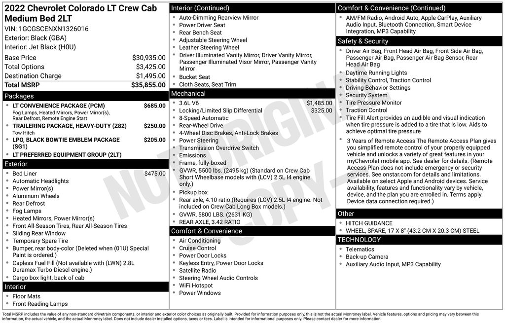 Recent Arrival! 4-Wheel Disc Brakes, 6 Speakers, 6-Speaker Audio System Feature, ABS brakes, Air Conditioning, Alloy wheels, AM/FM radio: SiriusXM, Apple CarPlay/Android Auto, Auto-dimming Rear-View mirror, Automatic Locking Rear Differential, Black Bowtie Emblem Package (LPO), Black Spray-On Bedliner w/Chevrolet Logo, Bumpers: body-color, Cloth Seat Trim, Compass, Delay-off headlights, Driver 6-Way Power Seat Adjuster, Driver door bin, Driver vanity mirror, Dual front impact airbags, Dual front side impact airbags, Electronic Stability Control, Enhanced Driver Instrument Information Display, Exterior Parking Camera Rear, Front anti-roll bar, Front Bucket Seats, Front Center Armrest, Front Fog Lamps, Front reading lights, Front wheel independent suspension, Fully automatic headlights, Heavy-Duty Trailering Package, Hitch Guidance, Illuminated entry, Low tire pressure warning, LT Convenience Package, Manual Rear-Sliding Window, Occupant sensing airbag, Outside Heated Power-Adjustable Body-Color Mirrors, Outside temperature display, Overhead airbag, Overhead console, Panic alarm, Passenger door bin, Passenger vanity mirror, Power door mirrors, Power driver seat, Power steering, Power windows, Preferred Equipment Group 2LT, Premium audio system: Chevrolet Infotainment 3, Radio data system, Radio: Chevrolet Infotainment 3 System, Rear reading lights, Rear seat center armrest, Rear step bumper, Rear Vision Camera, Rear-Window Electric Defogger, Remote keyless entry, Remote Vehicle Starter System, Security system, SiriusXM Radio, Speed control, Speed-sensing steering, Steering wheel mounted audio controls, Tachometer, Telescoping steering wheel, Tilt steering wheel, Tow/Haul Mode, Traction control, Trip computer, Variably intermittent wipers, Wheels: 17" x 8" Blade Silver Metallic Cast Alloy.