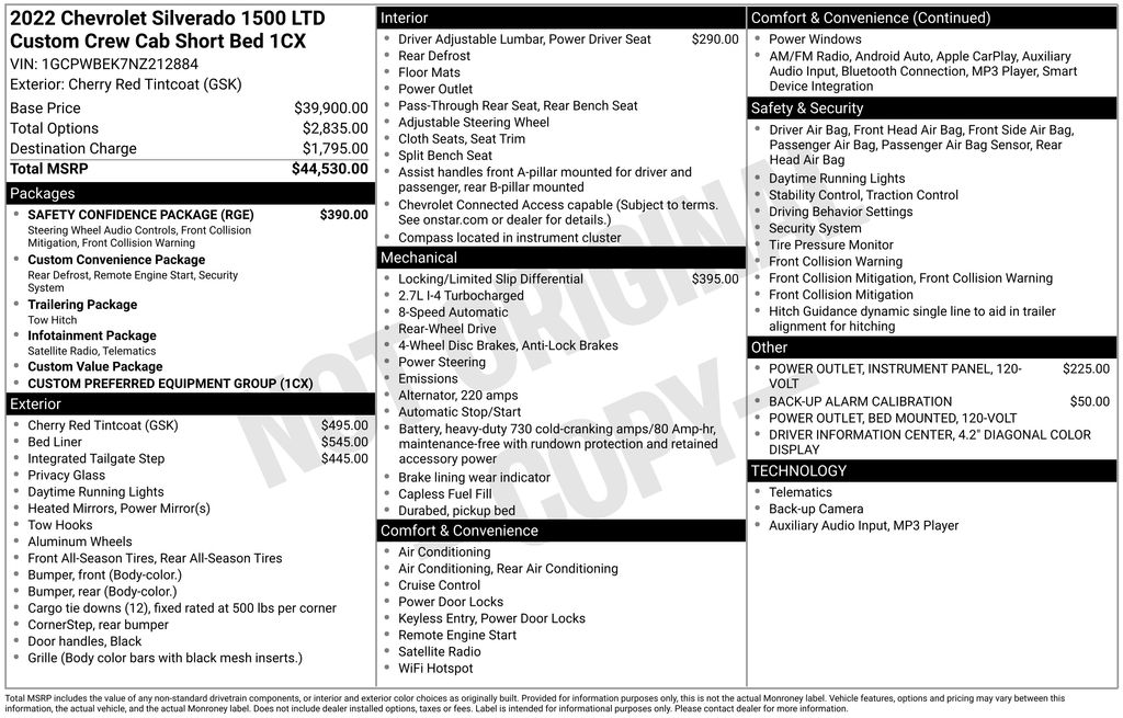 2022 Chevrolet Silverado 1500 LTD Custom Cherry Red Tintcoat Custom RWD 8-Speed Automatic 2.7L Turbo 10-Way Power Driver Seat w/Lumbar, 120-Volt Bed Mounted Power Outlet, 120-Volt Instrument Panel Power Outlet, 3.42 Rear Axle Ratio, 3.5" Monochromatic Display Driver Info Center, 4-Wheel Disc Brakes, 4.2" Diagonal Color Display Driver Info Center, 40/20/40 Front Split Bench Seat, 6 Speakers, 6-Speaker Audio System, ABS brakes, Air Conditioning, Alloy wheels, AM/FM radio: SiriusXM, Apple CarPlay/Android Auto, Auto-Locking Rear Differential, Automatic Emergency Braking, Bluetooth® For Phone, Body Color Grille, Brake assist, Bumpers: body-color, Chevrolet Connected Access Capable, Chevytec Spray-On Black Bedliner, Cloth Seat Trim, Color-Keyed Carpeting Floor Covering, Compass, Custom Convenience Package, Custom Value Package, Deep-Tinted Glass, Delay-off headlights, Driver door bin, Driver vanity mirror, Dual front impact airbags, Dual front side impact airbags, Electric Rear-Window Defogger, Electronic Cruise Control, Electronic Stability Control, EZ Lift Power Lock & Release Tailgate, Forward Collision Alert, Front anti-roll bar, Front Center Armrest w/Storage, Front Pedestrian Braking, Front reading lights, Front Rubberized Vinyl Floor Mats, Front wheel independent suspension, Fully automatic headlights, Heated door mirrors, Heavy Duty Suspension, Hitch Guidance, Illuminated entry, Infotainment Package, LED Cargo Area Lighting, Low tire pressure warning, Manual Tilt Wheel Steering Column, Multi-Flex Tailgate, Occupant sensing airbag, OnStar & Chevrolet Connected Services Capable, Outside temperature display, Overhead airbag, Overhead console, Panic alarm, Passenger door bin, Passenger vanity mirror, Power Door Locks, Power door mirrors, Power Front Windows w/Driver Express Up/Down, Power Front Windows w/Passenger Express Down, Power Rear Windows w/Express Down, Power steering, Power windows, Preferred Equipment Group 1CX, Premium audio system: Chevrolet Infotainment 3, Radio data system, Radio: Chevrolet Infotainment 3 System, Rear 60/40 Folding Bench Seat (Folds Up), Rear reading lights, Rear Rubberized-Vinyl Floor Mats, Rear step bumper, Rear window defroster, Remote Keyless Entry, Remote keyless entry, Remote Vehicle Starter System, Safety Confidence Package, Security system, SiriusXM Radio, Speed control, Speed-sensing steering, Split folding rear seat, Standard Tailgate, Steering Wheel Audio Controls, Tachometer, Theft Deterrent System (Unauthorized Entry), Tilt steering wheel, Traction control, Trailering Package, Trip computer, Variably intermittent wipers, Voltmeter, Wheels: 20" x 9" Bright Silver Painted Aluminum, Wi-Fi Hot Spot Capable.