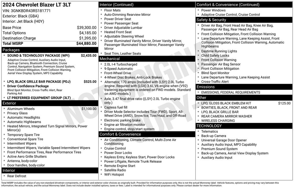 This is one impressive car. I purchased the Chevrolet Blazer with 6 cylinder engine. It has everything I want. Great acceleration, Great styling, Quiet engine, Well equiped, I really like the turn signals in the mirrors, push button start, blind spot monitoring, cross traffic monitoring, Continental Tires, and easy pairing of cell phone. I did not get AWD or GPS. There is nothing, I would change and for the price, a great deal to boot. You won't be disappointed. - 5.0