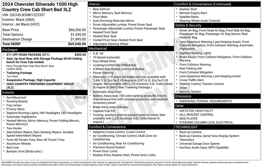 Priced below KBB Fair Purchase Price! 10-Speed Automatic, 4WD, Jet Black Leather, 10-Way Power Driver Seat w/Lumbar, 10-Way Power Passenger Seat Adjuster w/Lumbar, 12.3" Multicolor Reconfigurable Digital Display, 120-Volt Bed Mounted Power Outlet, 120-Volt Interior Power Outlet, 170 Amp Alternator, 2 USB Data Ports, 2nd Row Heated Outboard Seats, 3.23 Rear Axle Ratio, 4-Wheel Disc Brakes, 7 Speakers, ABS brakes, Adaptive Cruise Control, Air Conditioning, Alloy wheels, AM/FM radio: SiriusXM with 360L, Auto High-beam Headlights, Auto-dimming door mirrors, Auto-Dimming Inside Rear-View Mirror, Auto-dimming Rear-View mirror, Auto-Locking Rear Differential, Automatic temperature control, Bed View Camera, Bluetooth® For Phone, Body-Color Painted Mirror Caps, Bodyside moldings, Brake assist, Bumpers: body-color, Chevrolet Connected Access Capable, Chevytec Spray-On Black Bedliner, Chrome Assist Steps, Chrome Recovery Hooks, Color-Keyed Carpeting Floor Covering, Compass, Deep-Tinted Glass, Delay-off headlights, Driver door bin, Driver Memory, Driver vanity mirror, Dual Exhaust w/Polished Outlets, Dual front impact airbags, Dual front side impact airbags, Dual Rear USB Ports (Charge Only), Electric Rear-Window Defogger, Electrical Steering Column Lock, Electronic Stability Control, Electronic Transmission Range Selector Shifter, Enhanced Automatic Emergency Braking, Floor Mounted Center Console, Following Distance Indicator, Forward Collision Alert, Front anti-roll bar, Front Bucket Seats, Front Carpeted Floor Mats, Front Center Armrest, Front dual zone A/C, Front fog lights, Front LED Fog Lamps, Front Pedestrian Braking, Front Rain-Sensing Wipers, Front reading lights, Front wheel independent suspension, Fully automatic headlights, Garage door transmitter, Genuine wood console insert, Genuine wood dashboard insert, Genuine wood door panel insert, HD Surround Vision, Heated door mirrors, Heated Driver & Front Outboard Passenger Seats, Heated front seats, Heated rear seats, Heated Steering Wheel, Heated steering wheel, Heavy-Duty Air Filter, High Capacity Suspension Package, Hill Descent Control, Hitch Guidance, Hitch Guidance w/Hitch View, Illuminated entry, In-Vehicle Trailering System App, Integrated Trailer Brake Controller, IntelliBeam Automatic High Beam On/Off, Keyless Open & Start, Lane Keep Assist w/Lane Departure Warning, LED Cargo Area Lighting, Low tire pressure warning, Memory seat, Occupant sensing airbag, Off-Road Suspension, OnStar & Chevrolet Connected Services Capable, Outside Heated Power-Adjustable Mirrors, Outside temperature display, Overhead airbag, Overhead console, Panic alarm, Passenger door bin, Passenger vanity mirror, Perforated Leather Seat Trim, Perimeter Lighting, Power door mirrors, Power driver seat, Power Front Passenger Windows w/Express Up/Down, Power Front Windows w/Driver Express Up/Down, Power passenger seat, Power Rear Windows w/Express Down, Power Sliding Rear Window w/Rear Defogger, Power steering, Power Sunroof, Power Tailgate, Power Tilt & Telescoping Steering Column, Power windows, Preferred Equipment Group 3LZ, Premium audio system: Chevrolet Infotainment 3 Premium, Premium Bose 7-Speaker Sound System, Radio data system, Radio: Chevrolet Infotainment 3 Premium System, Rain sensing wipers, Rear Carpeted Floor Mats, Rear Cross Traffic Braking, Rear Pedestrian Alert, Rear reading lights, Rear seat center armrest, Rear step bumper, Rear Wheelhouse Liners, Rear window defroster, Remote keyless entry, Remote Vehicle Starter System, Safety Alert Seat, Security system, SiriusXM w/360L, Speed control, Speed-sensing steering, Split folding rear seat, Standard Tailgate, Steering Wheel Audio Controls, Steering wheel mounted audio controls, Tachometer, Telescoping steering wheel, Theft Deterrent System (Unauthorized Entry), Tilt steering wheel, Traction control, Trailer Camera Provisions, Trailer Side Blind Zone Alert, Trailering Package, Trip computer, Ultrasonic Front & Rear Park Assist, Universal Ho