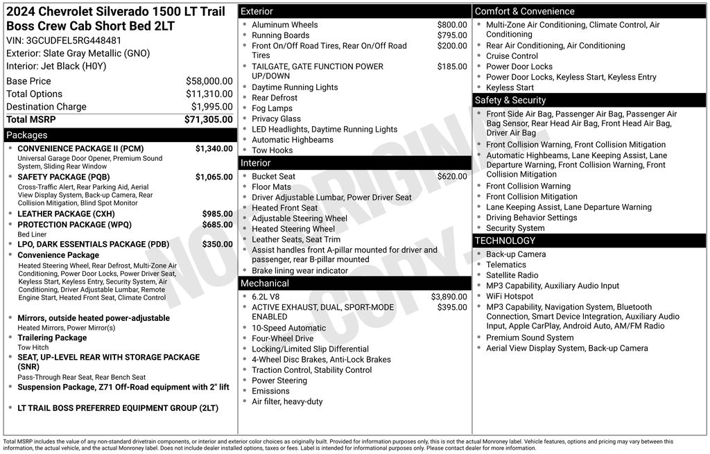 2024 Chevrolet Silverado 1500 LT Trail Boss Slate Gray Metallic LT Trail Boss 4WD 10-Speed Automatic EcoTec3 6.2L V8 10-Speed Automatic, 4WD, Black Leather, 10-Way Power Driver Seat w/Lumbar, 12.3" Multicolor Reconfigurable Digital Display, 120-Volt Bed Mounted Power Outlet, 120-Volt Interior Power Outlet, 170 Amp Alternator, 2 USB Data Ports, 220 Amp Alternator, 4-Wheel Disc Brakes, 4" Black Round Assist Steps (LPO), 40/20/40 Front Split-Bench Seat, 6 Speakers, 6-Speaker Audio System, ABS brakes, Air Conditioning, All-Weather Floor Liner (LPO) (AAK), Alloy wheels, AM/FM radio: SiriusXM with 360L, Auto High-beam Headlights, Auto-Locking Rear Differential, Automatic Emergency Braking, Automatic temperature control, Auxiliary External Transmission Oil Cooler, Black Name Plates (LPO), Black Tailgate CHEVROLET Lettering (LPO), Bluetooth® For Phone, Brake assist, Chevrolet Connected Access Capable, Chevytec Spray-On Black Bedliner, Cloth Seat Trim, Color-Keyed Carpeting Floor Covering, Compass, Convenience Package, Convenience Package II, Dark Essentials Package (LPO), Deep-Tinted Glass, Delay-off headlights, Driver door bin, Driver vanity mirror, Dual Active Exhaust, Dual front impact airbags, Dual front side impact airbags, Dual Rear USB Ports (Charge Only), Dual-Zone Automatic Climate Control, Electric Rear-Window Defogger, Electrical Steering Column Lock, Electronic Cruise Control, Electronic Stability Control, Electronic Transmission Range Selector Shifter, External Engine Oil Cooler, EZ Lift Power Lock & Release Tailgate, Floor Mounted Center Console, Following Distance Indicator, Forward Collision Alert, Front anti-roll bar, Front Bucket Seats, Front Center Armrest w/Storage, Front dual zone A/C, Front fog lights, Front LED Fog Lamps, Front License Plate Kit, Front Pedestrian Braking, Front reading lights, Front wheel independent suspension, Fully automatic headlights, HD Rear Vision Camera, HD Surround Vision, Heated door mirrors, Heated Driver & Front Outboard Passenger Seats, Heated front seats, Heated Power-Adjustable Outside Mirrors, Heated Steering Wheel, Heated steering wheel, Heavy-Duty Air Filter, High Gloss Black Mirror Caps, Hill Descent Control, Hitch Guidance, Hitch Guidance w/Hitch View, Illuminated entry, In-Vehicle Trailering System App, Inside Rear-View Mirror w/Tilt, Integrated Trailer Brake Controller, IntelliBeam Automatic High Beam On/Off, Keyless Open & Start, Lane Keep Assist w/Lane Departure Warning, Leather Package, Leather-Appointed Front Seat Trim, LED Cargo Area Lighting, Low tire pressure warning, Occupant sensing airbag, OnStar & Chevrolet Connected Services Capable, Outside temperature display, Overhead airbag, Overhead console, Panic alarm, Passenger door bin, Passenger vanity mirror, Performance Red Recovery Hooks, Perimeter Lighting, Power door mirrors, Power driver seat, Power Front Windows w/Driver Express Up/Down, Power Front Windows w/Passenger Express Down, Power Rear Windows w/Express Down, Power Sliding Rear Window w/Rear Defogger, Power steering, Power Tailgate, Power windows, Preferred Equipment Group 2LT, Premium audio system: Chevrolet Infotainment 3 Premium, Premium Bose 7-Speaker Sound System, Protection Package, Radio data system, Radio: Chevrolet Infotainment 3 Premium System, Rear 60/40 Folding Bench Seat (Folds Up), Rear Cross Traffic Braking, Rear Pedestrian Alert, Rear reading lights, Rear step bumper, Rear Wheelhouse Liners, Rear window defroster, Remote keyless entry, Remote Vehicle Starter System, Safety Package, Security system, Single Outlet Exhaust, SiriusXM w/360L, Speed control, Speed-sensing steering, Split folding rear seat, Standard Tailgate, Steering Wheel Audio Controls, Steering wheel mounted audio controls, Suspension Package, Tachometer, Telescoping steering wheel, Theft Deterrent System (Unauthorized Entry), Tilt steering wheel, Traction control, Trailer Camera Provisions, Trailer Side Blind Zone Alert, Trailering Package, Trip computer, Ultrasonic Front
