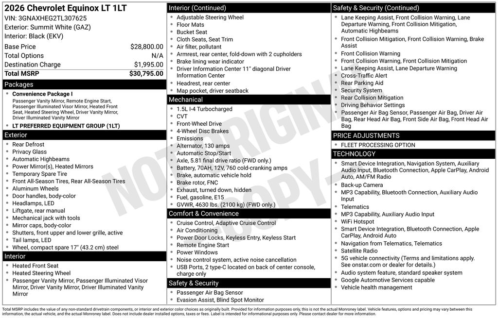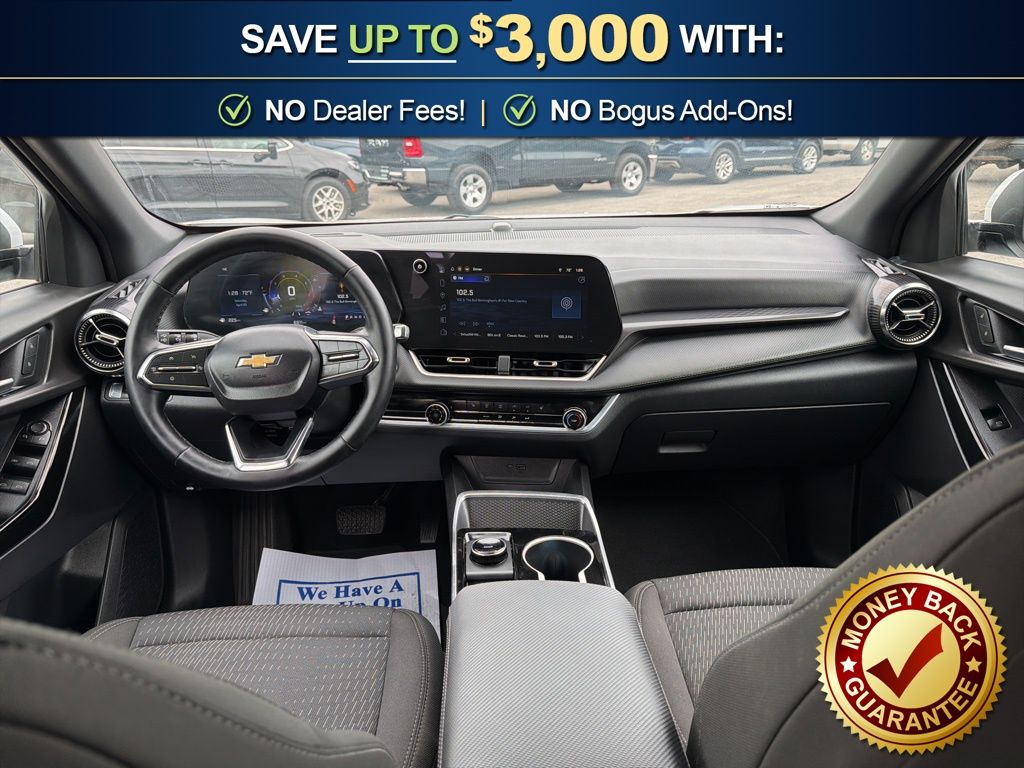 4-Wheel Disc Brakes, 5.81 Final Drive Axle Ratio, 6 Speakers, ABS brakes, Air Conditioning, Alloy wheels, AM/FM radio: SiriusXM, Auto High-beam Headlights, Brake assist, Bumpers: body-color, Cloth Seat Trim, Compass, Delay-off headlights, Driver 6-Way Manual Seat Adjuster, Driver door bin, Driver vanity mirror, Dual front impact airbags, Dual front side impact airbags, Electronic Stability Control, Emergency communication system: OnStar and Chevrolet connected services capable, Four wheel independent suspension, Front anti-roll bar, Front Bucket Seats, Front Center Armrest, Front Passenger 4-Way Manual Seat Adjuster, Front reading lights, Fully automatic headlights, Heated door mirrors, Heated Driver and Front Passenger Seats, Heated front seats, Heated steering wheel, Illuminated entry, Low tire pressure warning, Navigation System, Occupant sensing airbag, Outside temperature display, Overhead airbag, Overhead console, Panic alarm, Passenger door bin, Passenger vanity mirror, Power door mirrors, Power steering, Power windows, Preferred Equipment Group 1LT, Premium audio system: Chevrolet Infotainment 3, Radio data system, Radio: 11.3" Diagonal Advanced Color LCD Display, Rear anti-roll bar, Rear reading lights, Rear seat center armrest, Rear window defroster, Rear window wiper, Remote keyless entry, Security system, SiriusXM with 360L Trial Subscription, Speed control, Speed-sensing steering, Split folding rear seat, Spoiler, Steering wheel mounted audio controls, Tachometer, Telescoping steering wheel, Tilt steering wheel, Traction control, Trip computer, Variably intermittent wipers, Wheels: 17" Grazen Metallic Machined-Face Aluminum. 2026 Chevrolet Equinox LT