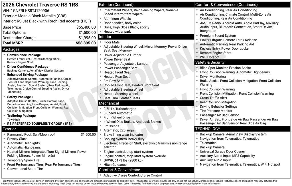 2026 Chevrolet Traverse RS Mosaic Black Metallic RS FWD 8-Speed Automatic 2.5L DOHC 12 Speakers, 3rd row seats: split-bench, 4-Wheel Disc Brakes, 6-Way Power Front Passenger Seat Adjuster, 8-Way Power Driver Seat Adjuster, ABS brakes, Air Conditioning, Alloy wheels, AM/FM radio: SiriusXM with 360L, Apple CarPlay/Android Auto, Auto High-beam Headlights, Auto tilt-away steering wheel, Auto-dimming door mirrors, Automatic temperature control, Bose Premium 12-Speaker Audio System Feature, Brake assist, Bumpers: body-color, Child-Seat-Sensing Airbag, Compass, Delay-off headlights, Driver 4-Way Power Lumbar Seat Adjuster, Driver door bin, Driver vanity mirror, Dual front impact airbags, Dual front side impact airbags, Electronic Stability Control, Emergency communication system: OnStar, Exterior Parking Camera Rear, Four wheel independent suspension, Front anti-roll bar, Front Bucket Seats, Front Center Armrest, Front dual zone A/C, Front Passenger 4-Way Power Lumbar Seat Adjuster, Front reading lights, Fully automatic headlights, Garage door transmitter, Heated door mirrors, Heated Driver and Front Passenger Seats, Heated front seats, Heated rear seats, Heated steering wheel, Illuminated entry, Low tire pressure warning, Memory seat, Navigation System, Occupant sensing airbag, Outside temperature display, Overhead airbag, Overhead console, Panic alarm, Passenger door bin, Passenger vanity mirror, Perforated Leather-Appointed Seat Trim, Power door mirrors, Power driver seat, Power Dual Glass Panoramic Sliding Sunroof, Power Liftgate, Power passenger seat, Power steering, Power windows, Preferred Equipment Group 1RS, Radio data system, Radio: : Audio System w/17.7" Diagonal Display, Rain sensing wipers, Rear air conditioning, Rear anti-roll bar, Rear reading lights, Rear window defroster, Rear window wiper, Remote keyless entry, Security system, SiriusXM with 360L Trial Subscription, Speed control, Speed-sensing steering, Split folding rear seat, Spoiler, Sport steering wheel, Steering wheel memory, Steering wheel mounted audio controls, Tachometer, Telescoping steering wheel, Tilt steering wheel, Traction control, Trip computer, Turn signal indicator mirrors, Variably intermittent wipers, Ventilated Driver and Front Passenger Seats, Ventilated front seats, Voltmeter, Wheels: 22" High Gloss Black Painted Aluminum.