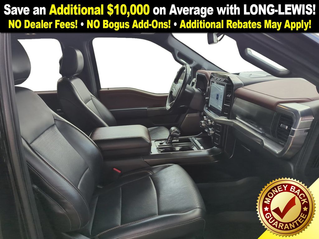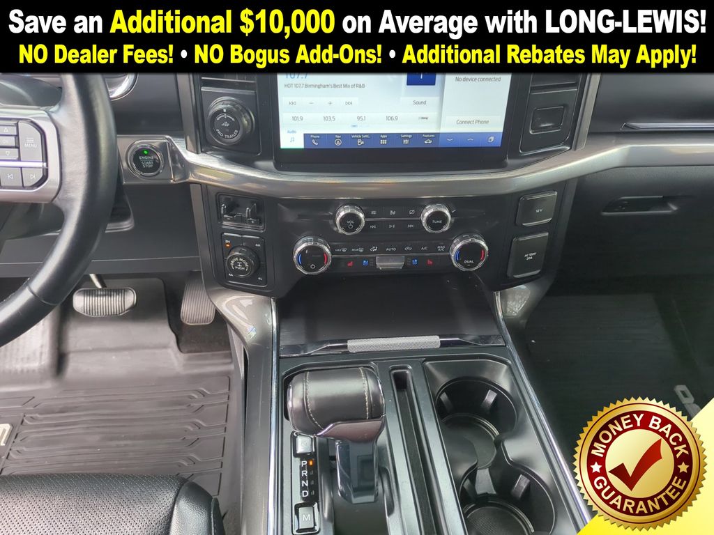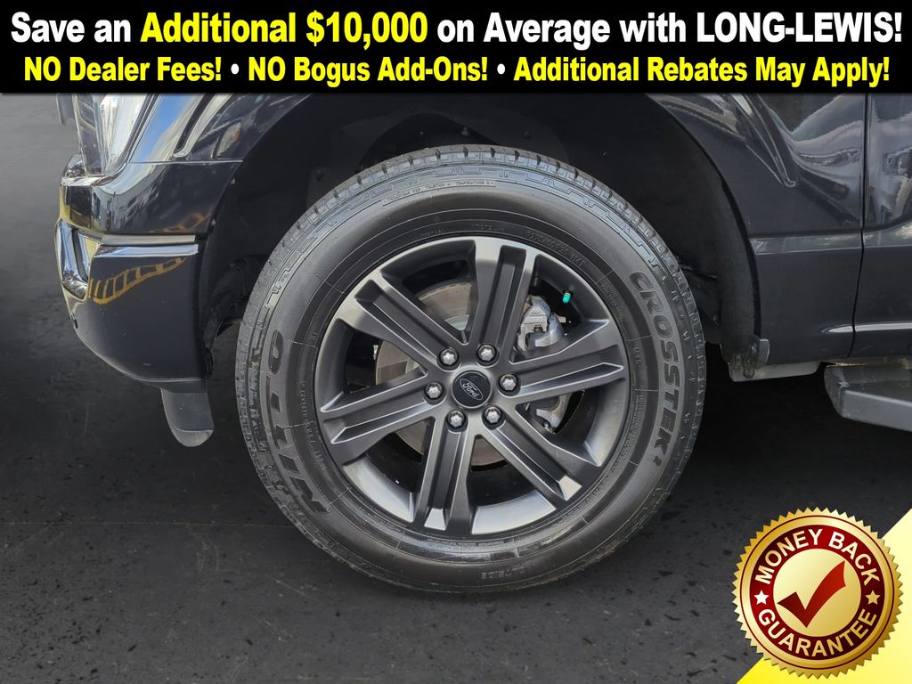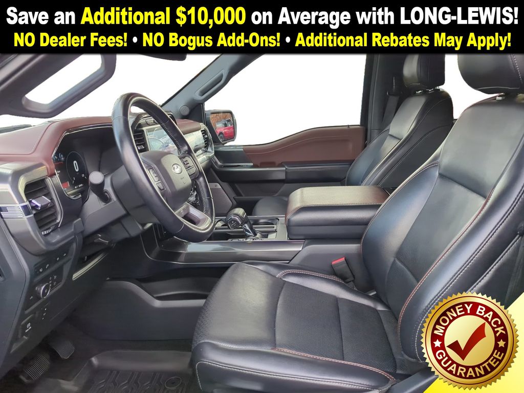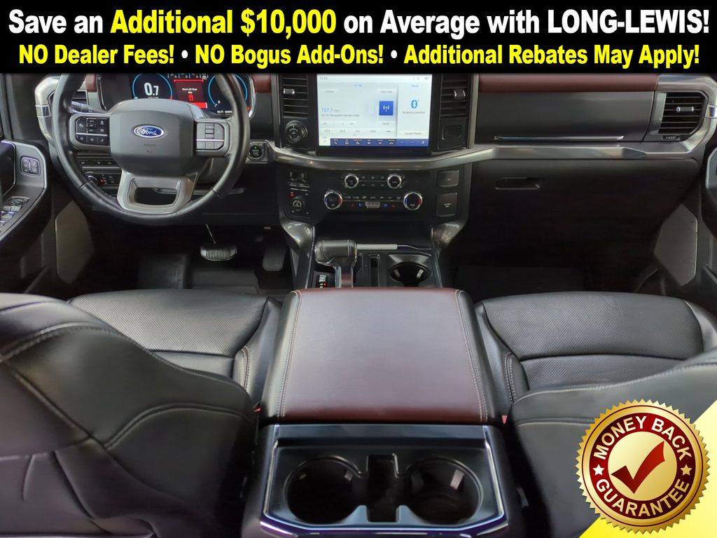 4WD, 18" Machined-Aluminum Wheels, 360 Degree Camera, 4-Wheel Disc Brakes, 7 Speakers, ABS brakes, Accent-Color Angular Step Bars, Adjustable pedals, Air Conditioning, Alloy wheels, AM/FM radio: SiriusXM with 360L, Auto High-beam Headlights, Auto-dimming door mirrors, Auto-dimming Rear-View mirror, Automatic temperature control, Body-Color Front & Rear Bumpers, Box Side Decals, Brake assist, Bumpers: chrome, Chrome Single-Tip Exhaust, Class IV Trailer Hitch Receiver, Compass, Connected Built-In Navigation, Dark 2-Bar & 1 Minor Bar Style Grille, Delay-off headlights, Driver door bin, Driver vanity mirror, Dual front impact airbags, Dual front side impact airbags, Electronic Stability Control, Emergency communication system: SYNC 4 911 Assist, Equipment Group 501A Mid, Evasive Steering Assist, Extended Range 36 Gallon Fuel Tank, Exterior Parking Camera Rear, Ford Co-Pilot360 Assist 2.0, Front anti-roll bar, Front Center Armrest w/Storage, Front dual zone A/C, Front fog lights, Front reading lights, Front wheel independent suspension, Fully automatic headlights, FX4 Off-Road Package, Heated door mirrors, Heated front seats, Illuminated entry, Integrated Trailer Brake Controller, Intelligent Adaptive Cruise Control w/Stop & Go, Intersection Assist, Lariat Sport Appearance Package, Leather-Trimmed 40/20/40 Front Seat, LED Sideview Mirror Spotlights, Low tire pressure warning, Memory seat, Navigation system: Connected Navigation (90-Day Trial), Occupant sensing airbag, Onboard 400W Outlet, Outside temperature display, Overhead airbag, Overhead console, Panic alarm, Passenger door bin, Passenger vanity mirror, Pedal memory, Power door mirrors, Power driver seat, Power passenger seat, Power steering, Power Tailgate, Power windows, Pro Power Onboard - 2KW, Pro Trailer Backup Assist, Radio data system, Radio: AM/FM SiriusXM w/360L, Radio: B&O Sound System by Bang & Olufsen, Rear reading lights, Rear seat center armrest, Rear step bumper, Rear window defroster, Remote keyless entry, Security system, Speed control, Speed Sign Recognition, Speed-sensing steering, Split folding rear seat, Steering wheel mounted audio controls, SYNC 4 w/Enhanced Voice Recognition, Tachometer, Telescoping steering wheel, Tilt steering wheel, Traction control, Trailer Tow Package, Tray Style Floor Liner (47W), Trip computer, Turn signal indicator mirrors, Twin Panel Moonroof, Universal Garage Door Opener, Variably intermittent wipers, Ventilated front seats, Voltmeter, Wheel Well Liner, Wheels: 18" 6-Spoke Machined Aluminum, Wheels: 20" 6-Spoke Dark Alloy Painted Aluminum, 4WD.