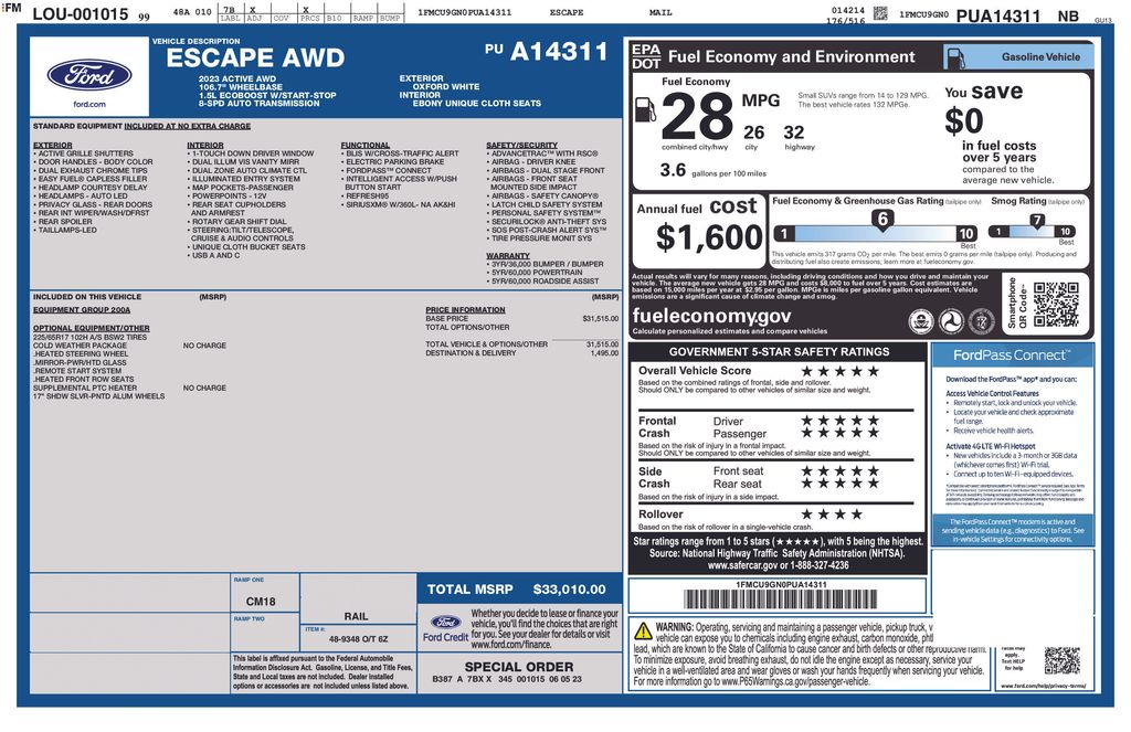 2023 Ford Escape Active AWD 8-Speed Automatic 1.5L EcoBoost Oxford White