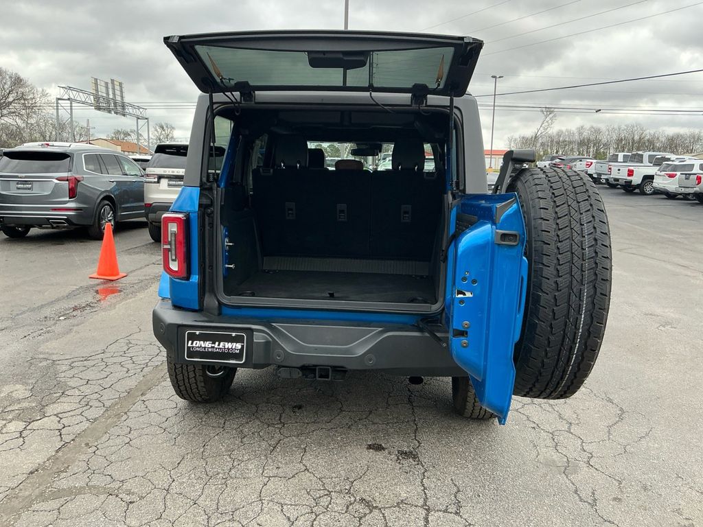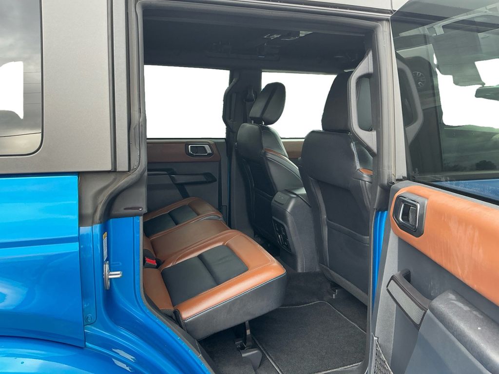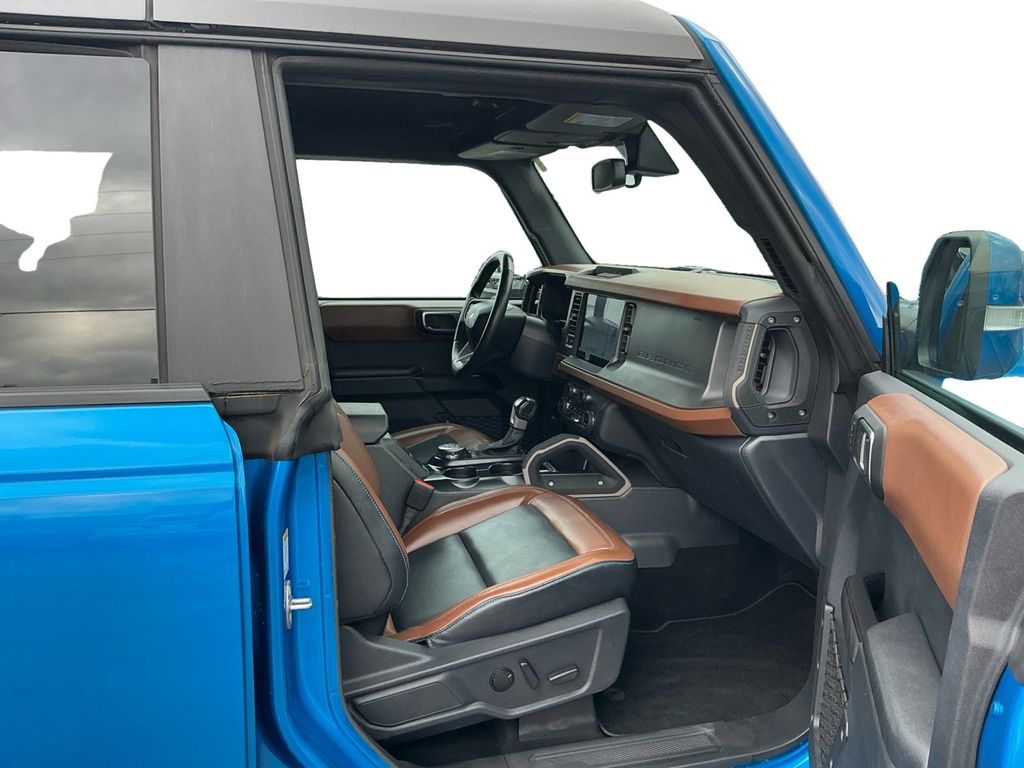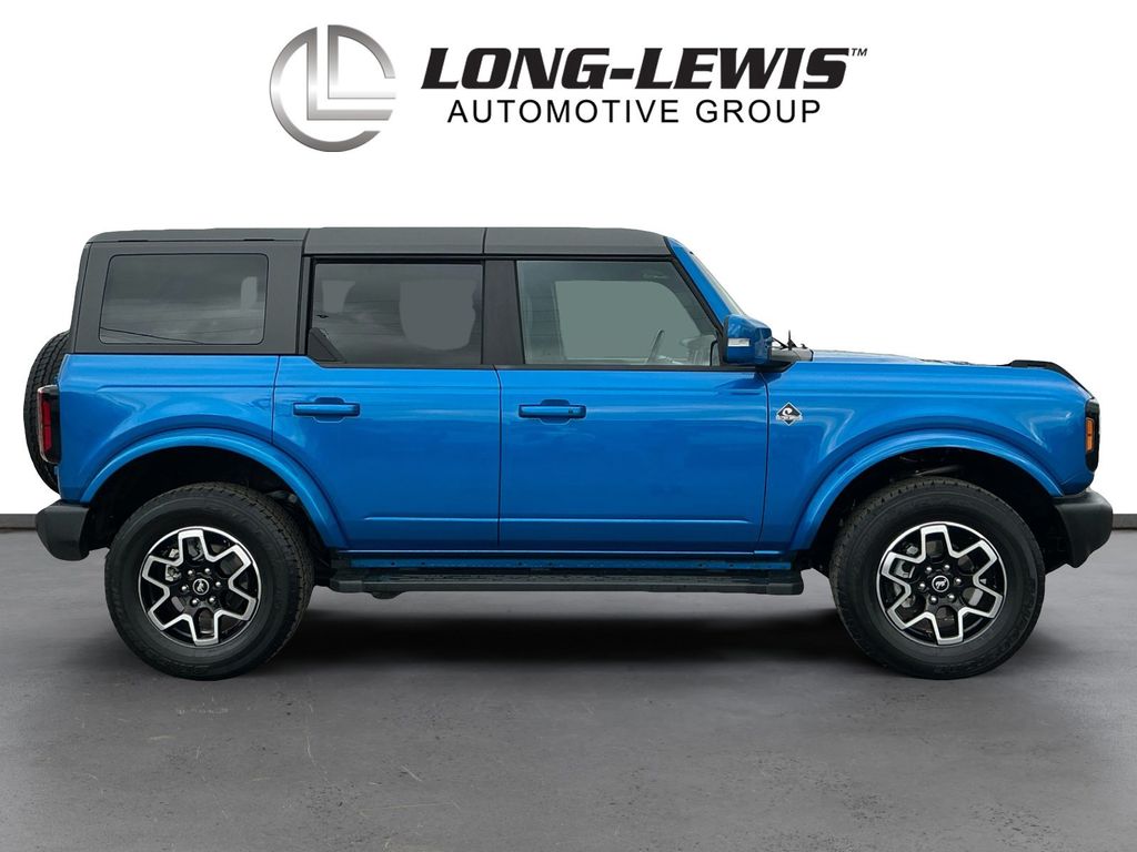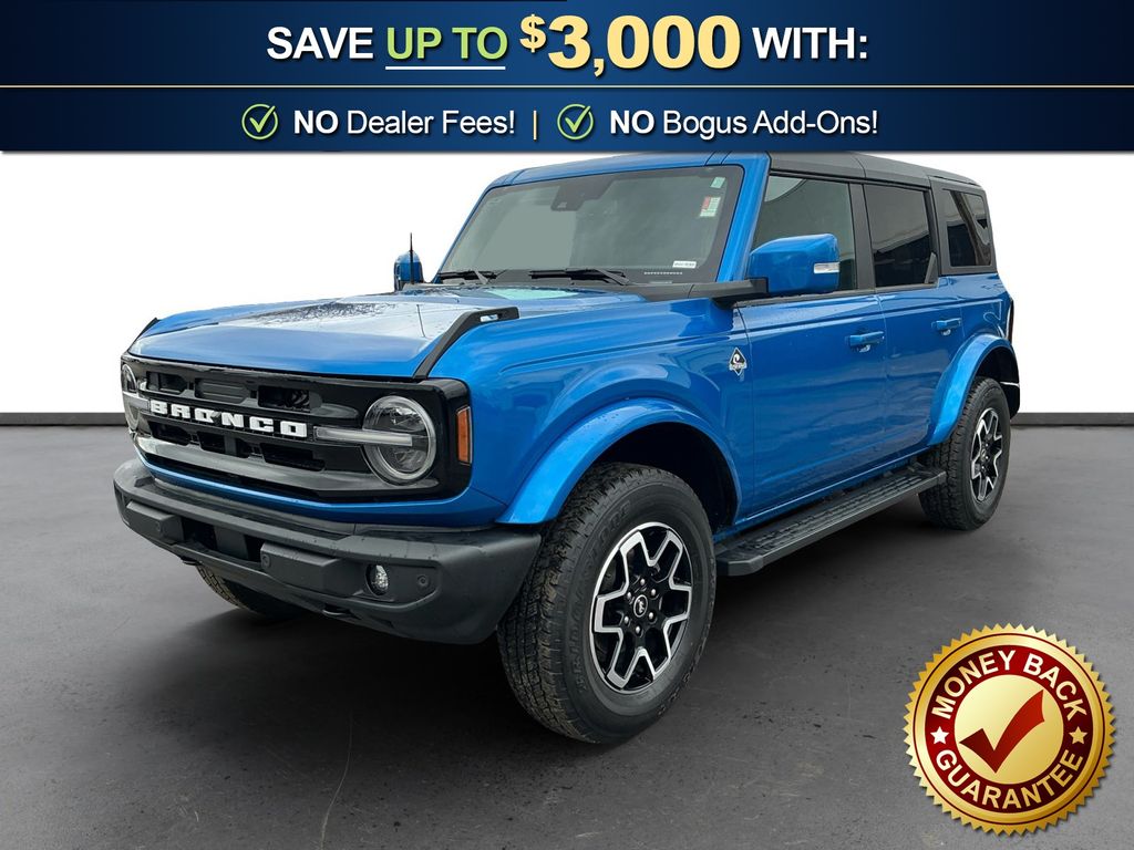 2024 Ford Bronco Outer Banks Velocity Blue Metallic Outer Banks 4WD 10-Speed Automatic 2.3L EcoBoost I-4 10 Speakers w/Subwoofer, 18" Bright Machined Aluminum Wheels, 3.73 Axle Ratio, 360-Degree Camera, 4-Wheel Disc Brakes, 7 Speakers, ABS brakes, Adaptive Cruise Control, Additional Sound Deadening, Air Conditioning, Alloy wheels, AM/FM radio: SiriusXM with 360L, AM/FM Stereo, Auto High-beam Headlights, Auto-dimming Rear-View mirror, Automatic temperature control, Brake assist, Carbonized Gray Molded-In-Color Hard Top, Compass, Connected Navigation, Delay-off headlights, Driver door bin, Driver vanity mirror, Dual front impact airbags, Dual front side impact airbags, Electronic Stability Control, Emergency communication system: 911 Assist, Equipment Group 314A High/Lux Package, Evasive Steering Assist, Exterior Parking Camera Rear, Front anti-roll bar, Front Bucket Seats, Front Center Armrest, Front dual zone A/C, Front fog lights, Front License Plate Bracket, Front Parking Sensors, Front reading lights, Front Row Top Panels Storage Bag, Front wheel independent suspension, Fully automatic headlights, Hard Top Sound Deadening Headliner, Heated door mirrors, Heated front seats, Heated Leather-Trimmed/Vinyl Bucket Seats, Heated Steering Wheel, Illuminated entry, Information on Demand Panel, Integrated roll-over protection, Leather Shift Knob, Low tire pressure warning, Navigation system: Connected Navigation, Occupant sensing airbag, Outside temperature display, Overhead airbag, Overhead console, Panic alarm, Passenger door bin, Passenger vanity mirror, Power door mirrors, Power driver seat, Power passenger seat, Power steering, Power windows, Radio data system, Radio: B&O Sound System by Bang & Olufsen, Rear seat center armrest, Rear-Window Defroster & Washer, Remote keyless entry, Security system, Sideview Mirrors, SiriusXM Radio w/360L, Speed control, Split folding rear seat, Steering wheel mounted audio controls, SYNC 4, Tachometer, Telescoping steering wheel, Tilt steering wheel, Traction control, Trip computer, Universal Garage Door Opener, Variably intermittent wipers, Voltmeter, Wireless Charging Pad.