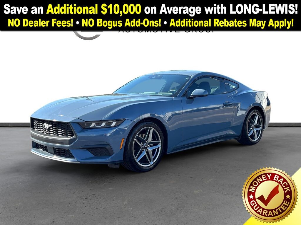 2025 Ford Mustang EcoBoost Vapor Blue EcoBoost RWD 10-Speed Automatic EcoBoost 2.3L I4 GTDi DOHC Turbocharged VCT 4-Wheel Disc Brakes, ABS brakes, Air Conditioning, Alloy wheels, AM/FM Stereo, Auto High-beam Headlights, Automatic temperature control, Brake assist, Bumpers: body-color, Compass, Delay-off headlights, Driver door bin, Driver vanity mirror, Dual front impact airbags, Dual front side impact airbags, Electronic Stability Control, Emergency communication system: 911 Assist, Exterior Parking Camera Rear, Four wheel independent suspension, Front anti-roll bar, Front Bucket Seats, Front Center Armrest, Front dual zone A/C, Front reading lights, Fully automatic headlights, Illuminated entry, Knee airbag, Leather Shift Knob, Low tire pressure warning, Occupant sensing airbag, Outside temperature display, Overhead airbag, Overhead console, Panic alarm, Passenger door bin, Passenger vanity mirror, Power door mirrors, Power steering, Power windows, Radio data system, Rain sensing wipers, Rear anti-roll bar, Rear Parking Sensors, Rear window defroster, Remote keyless entry, Speed control, Speed-sensing steering, Speed-Sensitive Wipers, Split folding rear seat, Sport steering wheel, Steering wheel mounted audio controls, SYNC 4, Tachometer, Telescoping steering wheel, Tilt steering wheel, Traction control, Trip computer, Variably intermittent wipers, Voltmeter, Wheels: 18" x 8" Machined-Face Aluminum, Wheels: 19" x 8.5" Premier Polished Aluminum.