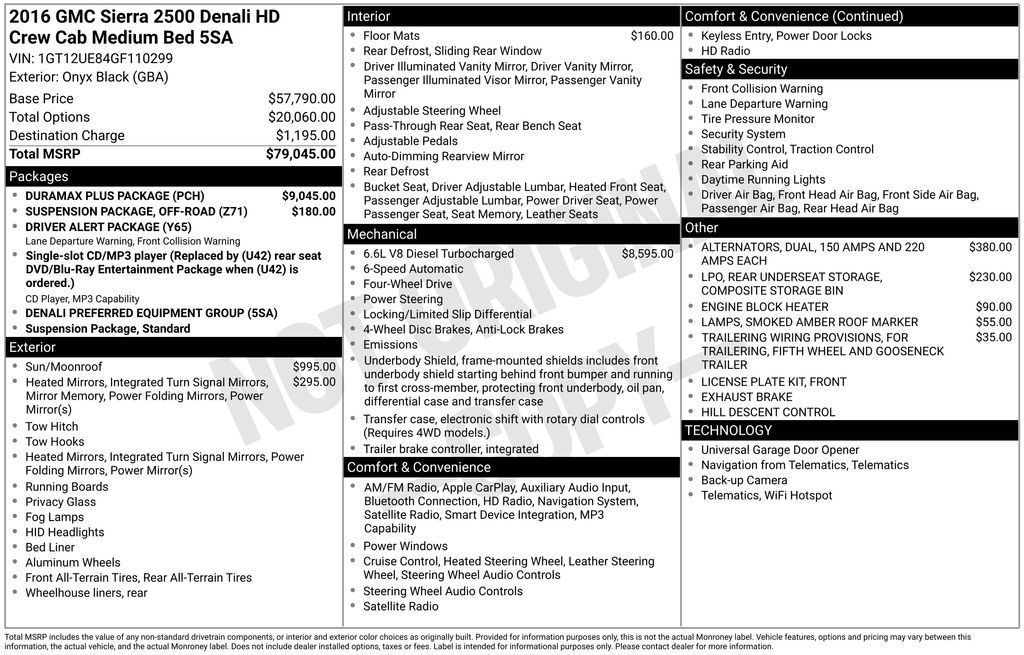 2016 GMC Sierra 2500HD Denali Onyx Black Denali 4WD Allison 1000 6-Speed Automatic Duramax 6.6L V8 Turbodiesel Allison 1000 6-Speed Automatic, 4WD, Jet Black Leather, 110-Volt AC Power Outlet, 150 Amps Alternator, 4-Wheel Disc Brakes, 7 Speakers, 8" Multi-Color Driver Instrument Info Display, ABS brakes, Adjustable pedals, Air Conditioning, Alloy wheels, AM/FM radio: SiriusXM, Apple CarPlay, Auto-dimming door mirrors, Auto-Dimming Inside Rear-View Mirror, Auto-dimming Rear-View mirror, Automatic temperature control, Black Frame-Mounted Front Recovery Hooks, Bluetooth® For Phone, Body-Color Front Bumper, Bodyside moldings, Bose 7 Speaker Sound System, Brake assist, Bumpers: body-color, Camper & 5th Wheel Trailer Wiring Provisions, CD player, Chrome Bodyside Moldings, Chrome Door Handles, Chrome Power-Adjustable Heated Outside Mirrors, Chrome wheels, Color-Keyed Carpeted Floor Mats, Color-Keyed Carpeting Floor Covering, Compass, Deep-Tinted Glass, Delay-off headlights, Denali Decor, Driver & Front Passenger Vanity Mirror Visors, Driver Alert Package, Driver door bin, Driver vanity mirror, Dual 150 Amps & 220 Amps Each Alternator, Dual front impact airbags, Dual front side impact airbags, Dual-Zone Automatic Climate Control, Duramax Plus Package, Electric Rear-Window Defogger, Electronic Shift Transfer Case, Electronic Stability Control, Emergency communication system, Engine Block Heater, Exhaust Brake, Exterior Parking Camera Rear, EZ-Lift & Lower Tailgate, Floor Mounted Console, Forward Collision Alert, Front All-Weather Floor Mats (LPO), Front anti-roll bar, Front Center Armrest, Front dual zone A/C, Front fog lights, Front Full Feature Bucket Seats, Front License Plate Kit, Front reading lights, Front wheel independent suspension, Fully automatic headlights, Garage door transmitter, HD Radio, Heated & Vented Front Bucket Seats, Heated door mirrors, Heated Driver and Front Passenger Seats, Heated front seats, Heated Leather Wrapped Steering Wheel, Heated Power-Adjustable Outside Mirrors, Heated steering wheel, Heavy-Duty Handling/Trailering Suspension Package, High-Intensity Discharge Headlights, Hill Descent Control, Illuminated entry, Lane Departure Warning System, Low tire pressure warning, Manual Tilt-Wheel/Telescoping Steering Column, Memory seat, Navigation System, Occupant sensing airbag, Off-Road Package, OnStar 4G LTE Wi-Fi Hotspot, OnStar 6 Months Guidance Plan, Outside temperature display, Overhead airbag, Overhead console, Panic alarm, Passenger door bin, Passenger vanity mirror, Perforated Leather Appointed Seat Trim, Power door mirrors, Power driver seat, Power passenger seat, Power Sliding Rear Window w/Defogger, Power steering, Power Sunroof, Power windows, Power Windows w/Driver Express Up & Down, Power-Adjustable Pedals For Accelerator & Brake, Premium audio system: IntelliLink, Radio: AM/FM/SiriusXM/HD w/Navigation, Rear 60/40 Folding Bench Seat (Folds Up), Rear Body-Color Bumper w/Bumper CornerSteps, Rear reading lights, Rear seat center armrest, Rear step bumper, Rear Underseat Storage (LPO), Rear Vision Camera w/Dynamic Guide Lines, Rear Wheelhouse Liners, Rear window defroster, Remote Keyless Entry, Remote keyless entry, Remote Locking Tailgate, Remote Vehicle Starter System, Security system, Single Slot CD/MP3 Player, SiriusXM Satellite Radio, Smoked Amber Roof Marker Lamps, Speed control, Speed-sensing steering, Split folding rear seat, Steering Wheel Audio Controls, Steering wheel mounted audio controls, Tachometer, Telescoping steering wheel, Theft Deterrent System (Unauthorized Entry), Tilt steering wheel, Traction control, Trailer Brake Controller, Trailering Equipment, Trip computer, Turn signal indicator mirrors, Ultrasonic Front & Rear Park Assist, Universal Home Remote, Variably intermittent wipers, Ventilated front seats, Voltmeter, Wheels: 20" Chrome Cast Aluminum, Wireless Charging, Z71 Chrome Front Fender Emblems, Allison 1000 6-Speed Automatic, 4WD, Jet Black Leather.