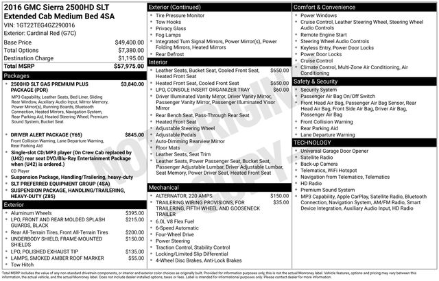 **Here at Long-Lewis we believe in being transparent. We have no Doc fees, or any other hidden fees. We are a one price store and give our best price up front and they are clearly marked on all our inventory.** 4WD 6-Speed Automatic HD Electronic with Overdrive Vortec 6.0L V8 SFI Flex Fuel VVT 6-Speed Automatic HD Electronic with Overdrive, 4WD, Jet Black Leather, 110-Volt AC Power Outlet, 18" Chromed Aluminum Wheels, 220 Amps Alternator, 2500HD SLT Gas Premium Plus Package, 4-Wheel Disc Brakes, 4.10 Rear Axle Ratio, 4.2" Diagonal Color Display Driver Info Center, 6 Speakers, 6" Rectangular Chrome Tubular Assist Steps (LPO), ABS brakes, Adjustable pedals, Air Conditioning, Alloy wheels, AM/FM radio: SiriusXM, Auto-dimming door mirrors, Auto-Dimming Inside Rear-View Mirror, Auto-dimming Rear-View mirror, Automatic temperature control, Bluetooth® For Phone, Bodyside moldings, Bose 6 Speaker Sound System, Brake assist, Bumpers: chrome, Camper & 5th Wheel Trailer Wiring Provisions, CD player, Chrome Bodyside Moldings, Chrome Door Handles, Chrome Mirror Caps, Chrome Power-Adjustable Heated Outside Mirrors, Chrome wheels, Color-Keyed Carpeting Floor Covering, Compass, Console Insert Organizer Tray (LPO), Deep-Tinted Glass, Delay-off headlights, Driver & Front Passenger Vanity Mirror Visors, Driver Alert Package, Driver door bin, Driver vanity mirror, Dual front impact airbags, Dual front side impact airbags, Dual-Zone Automatic Climate Control, Electric Rear-Window Defogger, Electronic Shift Transfer Case, Electronic Stability Control, Emergency communication system, Exterior Parking Camera Rear, EZ-Lift & Lower Tailgate, Floor Mounted Console, Forward Collision Alert, Front & Rear Molded Splash Guards, Front 40/20/40 Split Bench Seat, Front anti-roll bar, Front Center Armrest w/Storage, Front dual zone A/C, Front fog lights, Front Full Feature Bucket Seats, Front Halogen Fog Lamps, Front License Plate Kit, Front reading lights, Front wheel independent suspension, Frontal Passenger-Side Air Bag Deactivation Switch, Fully automatic headlights, Garage door transmitter, HD Radio, Heated & Vented Front Bucket Seats, Heated door mirrors, Heated Driver and Front Passenger Seats, Heated front seats, Heated Leather Wrapped Steering Wheel, Heated Power-Adjustable Outside Mirrors, Heavy-Duty Handling/Trailering Suspension Package, High-Intensity Discharge Headlights, Illuminated entry, Lane Departure Warning System, Leather Appointed Seat Trim, Leather-Wrapped Steering Wheel, LED Cargo Box Lighting, Low tire pressure warning, Manual Tilt-Wheel/Telescoping Steering Column, Memory seat, Occupant sensing airbag, OnStar 4G LTE Wi-Fi Hotspot, OnStar 6 Months Guidance Plan, Outside temperature display, Overhead airbag, Overhead console, Panic alarm, Passenger cancellable airbag, Passenger door bin, Passenger vanity mirror, Polished Exhaust Tip, Power door mirrors, Power driver seat, Power passenger seat, Power Sliding Rear Window w/Defogger, Power steering, Power windows, Power Windows w/Driver Express Up & Down, Power-Adjustable Pedals For Accelerator & Brake, Premium audio system: IntelliLink, Radio: AM/FM/SiriusXM/HD, Radio: AM/FM/SiriusXM/HD w/Navigation, Rear 60/40 Folding Bench Seat (Folds Up), Rear reading lights, Rear step bumper, Rear Vision Camera w/Dynamic Guide Lines, Rear Wheelhouse Liners, Rear window defroster, Remote Keyless Entry, Remote keyless entry, Remote Locking Tailgate, Remote Vehicle Starter System, Security system, Single Slot CD/MP3 Player, SiriusXM Satellite Radio, SLT Decor, Smoked Amber Roof Marker Lamps, Speed control, Split folding rear seat, Spray-On Pickup Box Bed Liner, Steering Wheel Audio Controls, Steering wheel mounted audio controls, Tachometer, Telescoping steering wheel, Theft Deterrent System (Unauthorized Entry), Tilt steering wheel, Traction control, Trailer Brake Controller, Trailering Equipment, Trip computer, Turn signal indicator mirrors, Ultrasonic Front & Rear