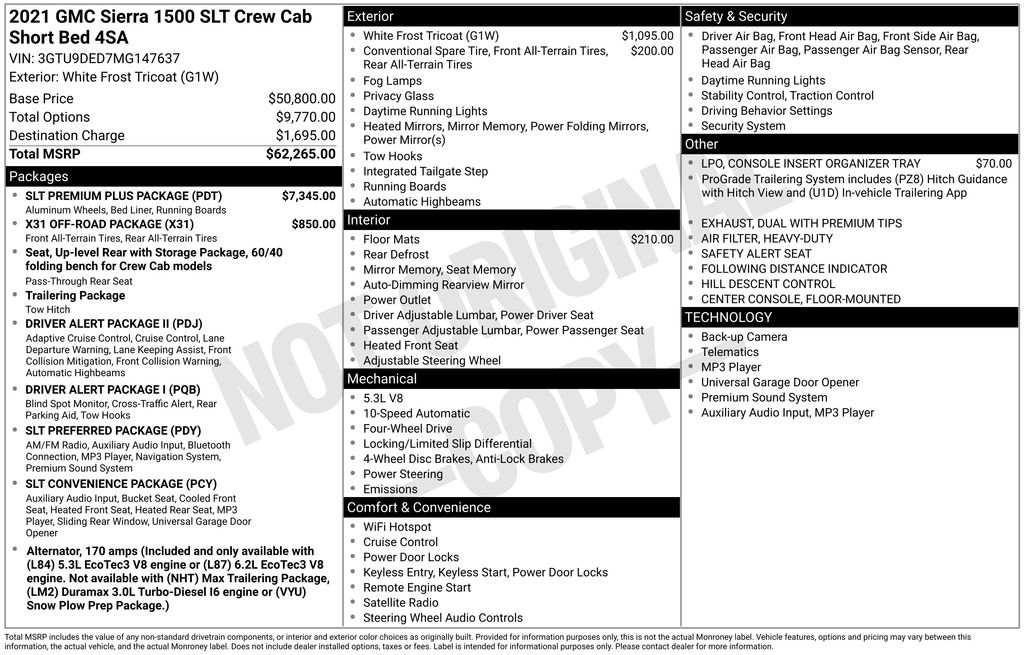 2021 GMC Sierra 1500 SLT White Frost Tricoat SLT 4WD 10-Speed Automatic EcoTec3 5.3L V8 10-Speed Automatic, 4WD, Dark Walnut/Slate Leather, 10-Way Power Driver Seat Adjuster w/Lumbar, 10-Way Power Passenger Seat Adjuster w/Lumbar, 12-Volt Rear Auxiliary Power Outlet, 120-Volt Bed Mounted Power Outlet, 120-Volt Instrument Panel Power Outlet, 170 Amp Alternator, 2 USB Ports, 2 USB Ports (1st Row), 20" x 9" Polished Aluminum Wheels, 3.23 Rear Axle Ratio, 4-Wheel Disc Brakes, 4G LTE Wi-Fi Hotspot Capable, 6 Speakers, 6-Speaker Audio System Feature, ABS brakes, Adaptive Cruise Control, Air Conditioning, All-Weather Floor Liner (LPO), Alloy wheels, AM/FM radio: SiriusXM with 360L, Apple CarPlay/Android Auto, Auto-dimming door mirrors, Auto-dimming Rear-View mirror, Auto-Locking Rear Differential, Automatic Emergency Braking, Automatic temperature control, Auxiliary External Transmission Oil Cooler, Brake assist, Bumpers: chrome, Chrome Grille, Chrome Wheel To Wheel Assist Steps, Color-Keyed Carpeting Floor Covering, Compass, Console Insert Organizer Tray (LPO), Deep-Tinted Glass, Delay-off headlights, Driver Alert Package I, Driver Alert Package II, Driver door bin, Driver Memory, Driver vanity mirror, Dual Exhaust w/Premium Tips, Dual front impact airbags, Dual front side impact airbags, Electric Rear-Window Defogger, Electrical Lock Control Steering Column, Electronic Stability Control, Floor-Mounted Center Console, Following Distance Indicator, Forward Collision Alert, Front 40/20/40 Split-Bench Seat, Front anti-roll bar, Front Bucket Seats, Front Center Armrest w/Storage, Front dual zone A/C, Front fog lights, Front Frame-Mounted Black Recovery Hooks, Front Pedestrian Braking, Front reading lights, Front wheel independent suspension, Fully automatic headlights, GMC Connected Access Capable, Heated 2nd Row Outboard Seats, Heated door mirrors, Heated Driver & Front Outboard Passenger Seating, Heated front seats, Heated steering wheel, Heavy Duty Suspension, Heavy-Duty Air Filter, Hill Descent Control, Hitch Guidance, Hitch Guidance w/Hitch View, Illuminated entry, In-Vehicle Trailering App, Integrated Trailer Brake Controller, IntelliBeam Automatic High Beam On/Off, Keyless Open & Start, Lane Change Alert w/Side Blind Zone Alert, Lane Keep Assist w/Lane Departure Warning, LED Cargo Area Lighting, Low tire pressure warning, Manual Tilt-Wheel & Telescoping Steering Column, Memory seat, Occupant sensing airbag, Off-Road Suspension, OnStar & GMC Connected Services Capable, Outside temperature display, Overhead airbag, Overhead console, Panic alarm, Passenger door bin, Passenger vanity mirror, Perf Leather-Appointed Front Outboard Seat Trim, Perimeter Lighting, Power Door Locks, Power door mirrors, Power driver seat, Power Front Passenger Windows w/Express Up/Down, Power Front Windows w/Driver Express Up/Down, Power passenger seat, Power Rear Windows w/Express Down, Power Sliding Rear Window w/Rear Defogger, Power steering, Power windows, Preferred Equipment Group 4SA, Premium audio system: GMC Infotainment System, Premium Bose 7-Speaker Sound System, ProGrade Trailering System, Radio data system, Radio: Premium GMC Infotainment Sys w/Multi-Touch, Radio: Premium GMC Infotainment Sys w/Navigation, Rear Cross Traffic Alert, Rear Dual USB Charging-Only Ports, Rear reading lights, Rear seat center armrest, Rear step bumper, Rear Wheelhouse Liners, Rear window defroster, Remote keyless entry, Remote Vehicle Starter System, Safety Alert Seat, Security system, SiriusXM w/360L, SLT Convenience Package, SLT Preferred Package, SLT Premium Plus Package, Speed control, Speed-sensing steering, Split folding rear seat, Spray-On Pickup Bed Liner w/GMC Logo, Steering Wheel Audio Controls, Steering wheel mounted audio controls, Tachometer, Telescoping steering wheel, Theft Deterrent System (Unauthorized Entry), Tilt steering wheel, Traction control, Trailering Package, Trip computer, Ultrasonic Front & Rear Park Assist, Universal Home Remote, Variably