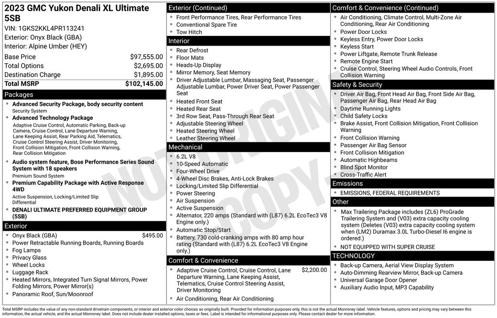 2023 GMC Yukon XL Denali Ultimate Certified. Onyx Black Denali Ultimate 4WD 10-Speed Automatic with Overdrive EcoTec3 6.2L V8 GM Certified, 4WD, 15" Diagonal Multi-Color Head-Up Display, 16-Way Power Seat Adjusters, 18 Speakers, 2 Presets For Outside Rearview Mirrors, 3 Years of GMC Connected Services, 3 Years of OnStar Safety & Security, 3 Years of OnStar Safety & Security (DISC), 3.23 Rear Axle Ratio, 3rd Row 60/40 Power-Folding Split-Bench Seat, 3rd row seats: split-bench, 4-Wheel Disc Brakes, ABS brakes, Adaptive Cruise Control, Adaptive suspension, Advanced Security Package, Advanced Technology Package, Air Conditioning, Air Ride Adaptive Suspension, Alloy wheels, AM/FM radio: SiriusXM with 360L, AM/FM Stereo, Apple CarPlay/Android Auto, Auto High-beam Headlights, Auto-dimming door mirrors, Auto-dimming Rear-View mirror, Auto-leveling suspension, Automatic temperature control, Bodyside moldings, Bose Performance Series Sound System w/18 Speakers, Brake assist, Bright Front & Rear Door Sill Plates, Bumpers: body-color, Chrome Door Handles w/Body-Color Strip, Compass, Delay-off headlights, Driver door bin, Driver vanity mirror, Dual Exhaust System, Dual front impact airbags, Dual front side impact airbags, Dual-Pane Panoramic Power Sunroof, Electronic Limited Slip Differential (eLSD), Electronic Stability Control, Emergency communication system: OnStar and GMC connected services capable, Enhanced Automatic Emergency Braking, Enhanced Automatic Parking Assist, Extra Capacity Cooling System, Floor Console, Four wheel independent suspension, Front anti-roll bar, Front Bucket Seats, Front Center Armrest, Front dual zone A/C, Front fog lights, Front reading lights, Full Grain Leather Seats, Fully automatic headlights, Garage door transmitter, Glass Breakage Sensor, Hands-Free Power Programmable Rear Liftgate, HD Surround Vision, Headphones, Heads-Up Display, Heated & Ventilated Driver & Front Passenger Seats, Heated 2nd Row Outboard Position Seats, Heated door mirrors, Heated Driver & Front Passenger Seats, Heated front seats, Heated rear seats, Heated Steering Wheel, Heated steering wheel, Hill Descent Control, Hitch Guidance w/Hitch View, Illuminated entry, Inside Rearview Auto-Dimming Rear Camera Mirror, Integrated Trailer Brake Controller, Lane Departure Warning System, Lane Keep Assist w/Lane Departure Warning, Leather steering wheel, Leather-Wrapped Steering Wheel, Low tire pressure warning, Magnetic Ride Control Suspension, Max Trailering Package, Memory seat, Navigation System, Not Equipped w/Super Cruise, Not Equipped w/Super Cruise (02O), Occupant sensing airbag, Outside Heated Power-Adjustable Mirrors, Outside temperature display, Overhead airbag, Overhead console, Panic alarm, Passenger door bin, Passenger vanity mirror, Power door mirrors, Power driver seat, Power Liftgate, Power moonroof, Power passenger seat, Power Release 2nd Row Bucket Seats, Power steering, Power Tilt & Telescopic Steering Column, Power windows, Power-Retractable Assist Steps, Preferred Equipment Group 5SB, Premium Capability Package w/Active Response 4WD, Rain sensing wipers, Rear air conditioning, Rear anti-roll bar, Rear audio controls, Rear Camera Mirror Washer, Rear Cross Traffic Alert, Rear Pedestrian Alert, Rear reading lights, Rear Seat Media System, Rear window defroster, Rear window wiper, Remote keyless entry, Reverse Automatic Braking, Roof rack: rails only, Safety Alert Seat, Security system, SiriusXM w/360L, Smart Trailer Integration Indicator, Speed control, Speed-sensing steering, Split folding rear seat, Spoiler, Sport Pedal Cover Kit (LPO), Steering wheel memory, Steering wheel mounted audio controls, Super Cruise, Tachometer, Telescoping steering wheel, Theft-Deterrent Alarm System, Tilt steering wheel, Traction control, Trailer Side Blind Zone Alert, Trip computer, Turn signal indicator mirrors, Universal Home Remote, Vader Bodyside Moldings, Variably intermittent wipers, Vehicle Inclination Sensor, Vehicle Interior Movement