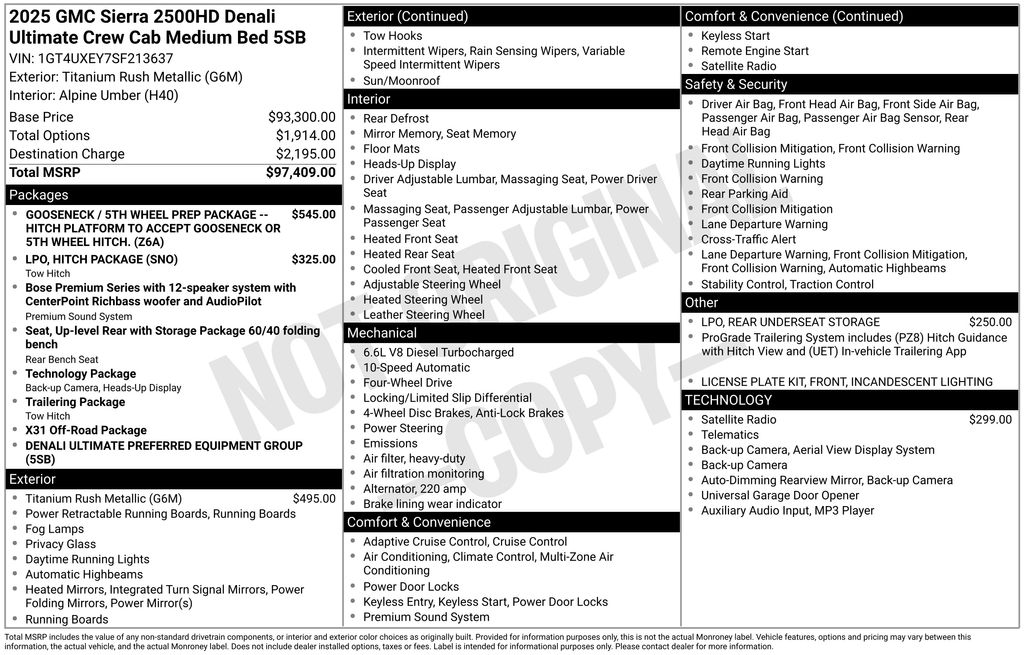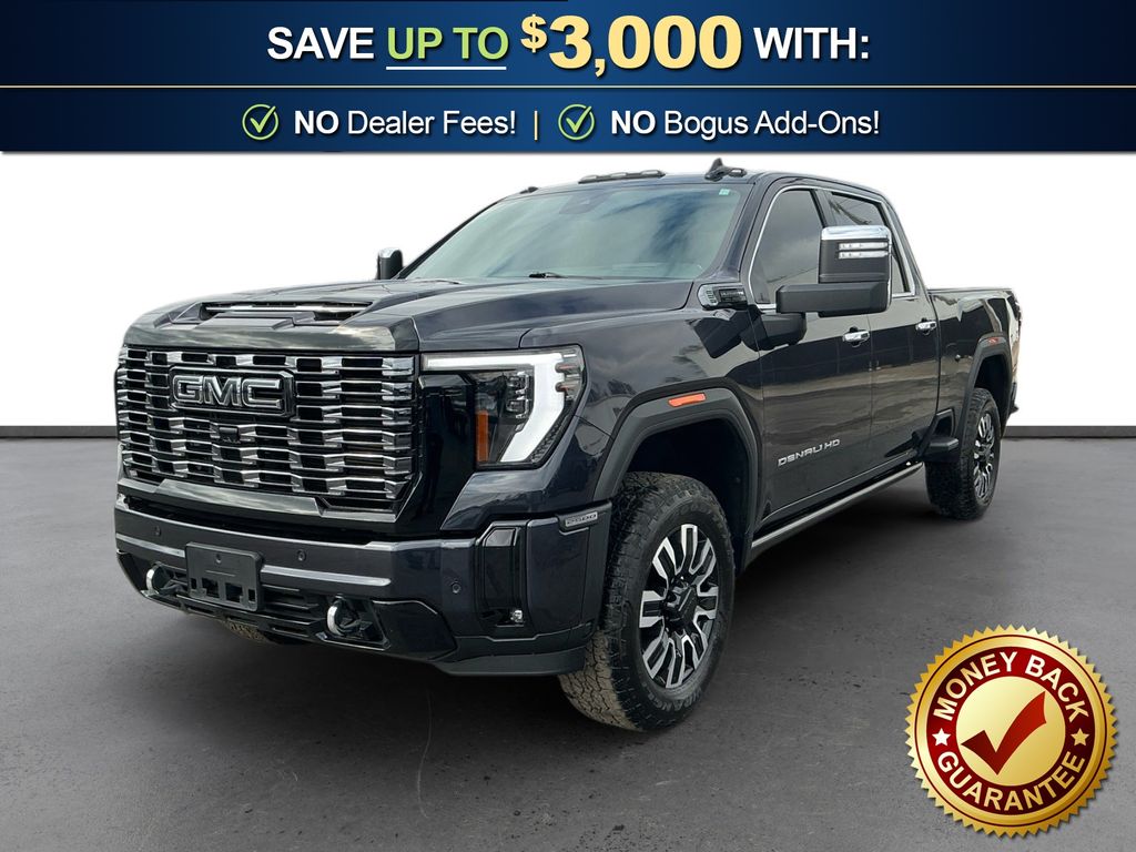 2025 GMC Sierra 2500HD Denali Ultimate Titanium Rush Metallic Denali Ultimate 4WD 10-Speed Automatic Duramax 6.6L V8 Turbodiesel 10-Speed Automatic, 4WD, Alpine Umber Leather, 12 Speakers, 120-Volt Bed Mounted Power Outlet, 120-Volt Instrument Panel Power Outlet, 16-Way Power Driver Seat Adjuster w/Lumbar, 16-Way Power Passenger Seat Adjuster w/Lumbar, 2 Charge-Only Rear USB Ports, 2 Charge/Data USB Ports Inside Center Console, 2 USB Ports, 2-Speed Active Transfer Case, 220-Amp Alternator, 3 Years SiriusXM, 3.42 Axle Ratio, 4-Wheel Disc Brakes, ABS brakes, Air Conditioning, Alloy wheels, AM/FM radio: SiriusXM with 360L, Apple CarPlay/Android Auto, Auto High-beam Headlights, Auto-dimming door mirrors, Auto-dimming Rear-View mirror, Automatic Emergency Braking, Automatic temperature control, Bed View Camera w/2 Trailer Camera Provisions, Block heater, Bose Premium Series 12-Speaker System, Brake assist, Buckle to Drive, Bumpers: body-color, Compass, Deep-Tinted Glass, Delay-off headlights, Driver door bin, Driver Memory, Driver vanity mirror, Dual front impact airbags, Dual front side impact airbags, Dual Heavy-Duty 70 Amp Battery, Electric Rear-Window Defogger, Electronic Stability Control, Emergency communication system: OnStar, Floor-Mounted Center Console, Following Distance Indicator, Forward Collision Alert, Front anti-roll bar, Front Bucket Seats, Front Center Armrest, Front dual zone A/C, Front fog lights, Front License Plate Kit, Front Pedestrian Braking, Front Rain-Sensing Wipers, Front reading lights, Front wheel independent suspension, Full Grain Leather Seat Trim, Fully automatic headlights, Garage door transmitter, Genuine wood dashboard insert, Genuine wood door panel insert, Gooseneck/5th Wheel Prep Package, HD Surround Vision, Heads-Up Display, Heated 2nd Row Outboard Seats, Heated door mirrors, Heated Driver & Front Outboard Passenger Seats, Heated front seats, Heated rear seats, Heated steering wheel, Hill Descent Control, Hitch Guidance w/Hitch View, Hitch Package (LPO), Illuminated entry, In-Vehicle Trailering System App, Inside Rearview Auto-Dimming Rear Camera Mirror, IntelliBeam Automatic High Beam On/Off, Keyless Open & Start, Lane Departure Warning System, Leather steering wheel, LED Cargo Area Lighting, LED Smoked Amber Roof Marker Lamps, Low tire pressure warning, Manual Tilt-Wheel/Telescoping Steering Column, Memory seat, Multicolor 15" Diagonal Head-Up Display, Occupant sensing airbag, Off-Road Suspension, OnStar Services Capable, Outside temperature display, Overhead airbag, Overhead console, Panic alarm, Passenger door bin, Passenger vanity mirror, Pickup Box, Power door mirrors, Power driver seat, Power Front Passenger Windows w/Express Up/Down, Power moonroof, Power passenger seat, Power Sliding Rear Window w/Defogger, Power steering, Power Sunroof, Power windows, Preferred Equipment Group 5SB, Push Button Start, Radio: AM/FM w/Premium GMC Infotainment System, Rain sensing wipers, Rear Cross Traffic Alert, Rear reading lights, Rear seat center armrest, Rear step bumper, Rear Underseat Storage (LPO), Rear Wheelhouse Liners, Rear window defroster, Remote keyless entry, Remote Vehicle Starter System, Safety Alert Seat, Security system, Signature Denali Ultimate Grille in Vadar Chrome, SiriusXM w/360L Trial Subscription, Speed control, Speed-sensing steering, Split folding rear seat, Spray-On Pickup Bedliner w/GMC Logo, Steering Wheel Audio Controls, Steering wheel mounted audio controls, Tachometer, Technology Package, Telescoping steering wheel, Tilt steering wheel, Traction control, Trailer Cam Provisions & Trailer Viewing Software, Trailer Side Blind Zone Alert, Trailer Tire Pressure Monitor Sensors, Trip computer, Turn signal indicator mirrors, Ultrasonic Front & Rear Park Assist, Unauthorized Entry Theft-Deterrent System, Universal Home Remote, Variably intermittent wipers, Ventilated Driver & Front Passenger Seats, Ventilated front seats, Voltmeter, Wheels: 20" Ultra-Bright Machined Aluminum,