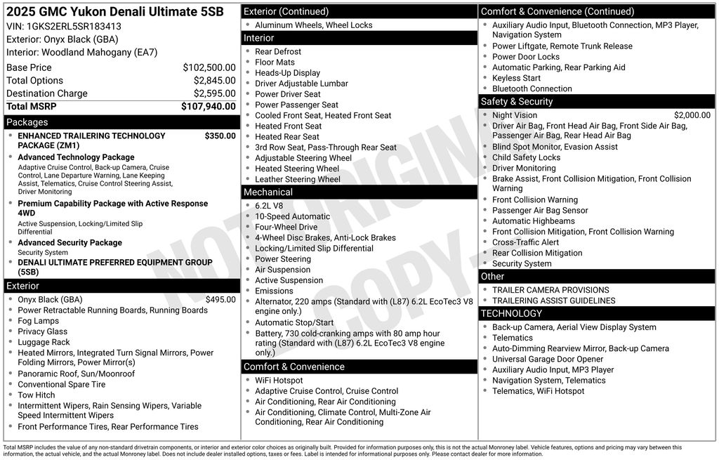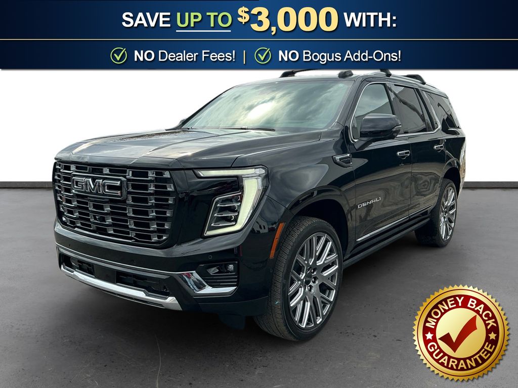 2025 GMC Yukon Denali Ultimate Onyx Black Denali Ultimate 4WD 10-Speed Automatic with Overdrive EcoTec3 6.2L V8 4WD, 15" Diagonal Multi-Color Head-Up Display, 18 Speakers, 3 Years of OnStar Services/Safety Services, 3.23 Rear Axle Ratio, 3rd row seats: split-bench, 4-Spoke Leather-Wrapped Steering Wheel, 4-Way Power Driver Lumbar Seat Adjuster, 4-Way Power Front Passenger Lumbar Seat Adjuster, 4-Wheel Disc Brakes, 8" Diagonal Rear Touchscreen Climate Control, ABS brakes, Adaptive suspension, Advanced Security Package, Advanced Technology Package, Air Conditioning, Air Ride Adaptive Suspension, Alloy wheels, AM/FM radio: SiriusXM with 360L, Apple CarPlay/Android Auto, Audio memory, Auto High-beam Headlights, Auto-dimming door mirrors, Auto-dimming Rear-View mirror, Auto-leveling suspension, Automatic temperature control, AutoSense Hands-Free Power Liftgate, Blind Zone Steering Assist with Trailering, Bodyside moldings, Bose 18-Speaker Surround with Centerpoint, Brake assist, Bright Front and Rear Door Sill Plates, Bumpers: body-color, Compass, Delay-off headlights, Driver 2-Way Power Upper Shoulder, Driver Attention Assist, Driver door bin, Driver Power Massage Seat, Driver vanity mirror, Dual Exhaust System, Dual front impact airbags, Dual front side impact airbags, Dual-Pane Panoramic Power Sunroof, Electronic Limited Slip Differential (ELSD), Electronic Stability Control, Emergency communication system: OnStar and GMC connected services capable, Enhanced Trailering Technology Package, Exterior Parking Camera Rear, Extra Capacity Cooling System, Four wheel independent suspension, Front anti-roll bar, Front Bucket Seats, Front Center Armrest, Front dual zone A/C, Front fog lights, Front Passenger 2-Way Power Upper Shoulder, Front Passenger Power Massage Seat, Front reading lights, Full Grain Leather Seats, Fully automatic headlights, Garage door transmitter, Glass Breakage Sensor, Headphones, Heads-Up Display, Heated door mirrors, Heated Driver and Front Passenger Seats, Heated front seats, Heated rear seats, Heated steering wheel, Hill Descent Control, Hitch View, Illuminated entry, Inside Rearview Auo-Dimming Rear Camera Mirror, Integrated Trailer Brake Controller, Leather steering wheel, Low tire pressure warning, Magnetic Ride Control Suspension, Max Trailering Package, Memory seat, Navigation system: GMC Connected Navigation, Night Vision, Occupant sensing airbag, Outside temperature display, Overhead airbag, Overhead console, Panic alarm, Passenger door bin, Passenger vanity mirror, Perforated Heather and Ventilated Driver and Front Passenger Seats, Power door mirrors, Power driver seat, Power Liftgate, Power moonroof, Power passenger seat, Power Release 2nd Row Bucket Seats, Power steering, Power Tilt and Telescopic Steering Column, Power windows, Power-Retractable Assist Steps, Preferred Equipment Group 5SB, Premium Capability Package with Active Response 4WD, Radio: 16.8" Diagonal Premium GMC Infotainment System, Rain sensing wipers, Rear air conditioning, Rear anti-roll bar, Rear audio controls, Rear reading lights, Rear Seat Media System, Rear window defroster, Rear window wiper, Remote keyless entry, Security system, SiriusXM with 360L, Smart Trailer Integration Indicator, Speed control, Speed-sensing steering, Split folding rear seat, Spoiler, Sport Pedal Cover Kit, Steering wheel memory, Steering wheel mounted audio controls, Super Cruise, Tachometer, Telescoping steering wheel, Theft-Deterrent Alarm System, Tilt steering wheel, Traction control, Trailer Camera Provisions, Trailering Assist Guidelines, Trip computer, Turn signal indicator mirrors, Vader Bodyside Moldings, Variably intermittent wipers, Vehicle Inclination Sensor, Vehicle Interior Movement Sensor, Ventilated front seats, Voltmeter, Wheel Locks (set of 4), Wheels: 24" x 9.5" Selective Machined and Painted, Wired Auxiliary Trailer Camera, 4WD.