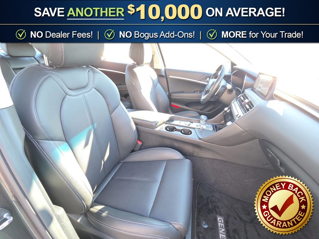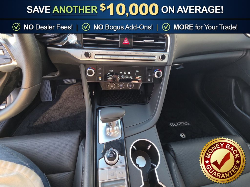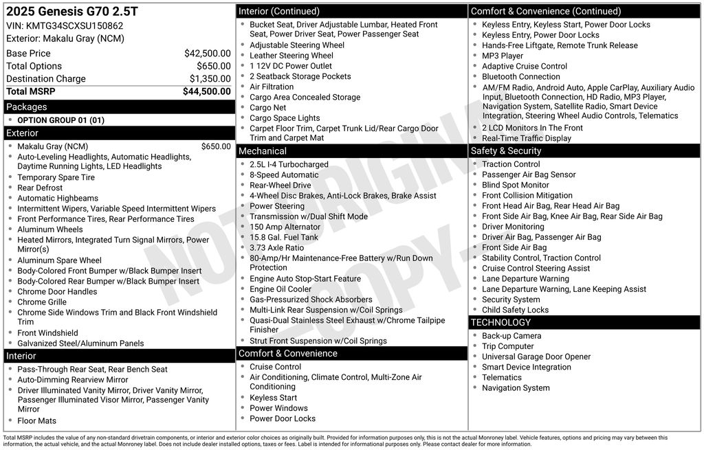 4-Wheel Disc Brakes, 6 Speakers, ABS brakes, Air Conditioning, Alloy wheels, AM/FM radio: SiriusXM, Android Auto & Apple CarPlay, Anti-whiplash front head restraints, Auto High-beam Headlights, Auto-dimming Rear-View mirror, Automatic temperature control, Brake assist, Bumpers: body-color, Delay-off headlights, Driver door bin, Driver vanity mirror, Dual front impact airbags, Dual front side impact airbags, Electronic Stability Control, Emergency communication system: Genesis Connected Services, Exterior Parking Camera Rear, Four wheel independent suspension, Front anti-roll bar, Front Bucket Seats, Front Center Armrest, Front dual zone A/C, Front reading lights, Fully automatic headlights, Garage door transmitter: HomeLink, Heated door mirrors, Heated front seats, Heated Multi-Adjustable Front Bucket Seats, Illuminated entry, Knee airbag, Leather steering wheel, Leatherette Seating Surfaces, Low tire pressure warning, Navigation System, Occupant sensing airbag, Option Group 01, Outside temperature display, Overhead airbag, Overhead console, Panic alarm, Passenger door bin, Passenger vanity mirror, Power door mirrors, Power driver seat, Power passenger seat, Power steering, Power windows, Radio: AM/FM/SiriusXM/HD Audio System, Rear anti-roll bar, Rear reading lights, Rear seat center armrest, Rear side impact airbag, Rear window defroster, Remote keyless entry, Security system, Speed control, Speed-Sensitive Wipers, Split folding rear seat, Steering wheel mounted audio controls, Tachometer, Telescoping steering wheel, Traction control, Trip computer, Turn signal indicator mirrors, Variably intermittent wipers, Wheels: 19" x 8.0J Fr & 19" x 8.5J Rr Alloy. 2025 Genesis G70 2.5T