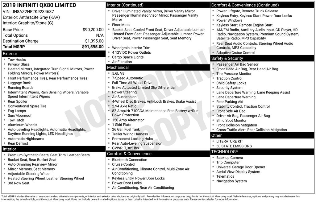 2019 INFINITI QX80 Limited Anthracite Gray Limited 4WD 7-Speed Automatic 5.6L V8 15 Speakers, 2.94 Axle Ratio, 3rd row seats: split-bench, 4-Wheel Disc Brakes, A/V remote, ABS brakes, Air Conditioning, Alloy wheels, AM/FM radio: SiriusXM, Anti-whiplash front head restraints, Auto High-beam Headlights, Auto tilt-away steering wheel, Auto-dimming door mirrors, Auto-dimming Rear-View mirror, Auto-leveling suspension, Automatic temperature control, Brake assist, Bumpers: body-color, CD player, Delay-off headlights, Driver door bin, Driver vanity mirror, Dual front impact airbags, Dual front side impact airbags, DVD-Audio, Electronic Stability Control, Emergency communication system: INFINITI Connection, Four wheel independent suspension, Front anti-roll bar, Front Bucket Seats, Front Center Armrest, Front dual zone A/C, Front fog lights, Front reading lights, Fully automatic headlights, Garage door transmitter: HomeLink, Genuine wood console insert, Genuine wood dashboard insert, Genuine wood door panel insert, Headlight cleaning, Headphones, Heated door mirrors, Heated front seats, Heated steering wheel, Heated/Cooled Front Bucket Seats, Illuminated entry, Leather Shift Knob, Leather steering wheel, Literature Kit, Low tire pressure warning, Memory seat, Navigation system: INFINITI InTouch Navigation, Occupant sensing airbag, Outside temperature display, Overhead airbag, Overhead console, Panic alarm, Passenger door bin, Passenger vanity mirror, Perforated Semi-Aniline Premium Leather Seats, Power door mirrors, Power driver seat, Power Liftgate, Power moonroof, Power passenger seat, Power steering, Power windows, Radio data system, Radio: AM/FM/HD w/Single In-Dash CD/DVD Player & MP3, Rain sensing wipers, Rear air conditioning, Rear anti-roll bar, Rear audio controls, Rear reading lights, Rear seat center armrest, Rear window defroster, Rear window wiper, Reclining 3rd row seat, Remote keyless entry, Roof rack, Security system, Speed control, Speed-sensing steering, Split folding rear seat, Spoiler, Steering wheel memory, Steering wheel mounted audio controls, Tachometer, Telescoping steering wheel, Tilt steering wheel, Traction control, Trip computer, Turn signal indicator mirrors, Variably intermittent wipers, Ventilated front seats, Voltmeter, Wheels: 22" x 8.0" 14-Spoke Forged Aluminum-Alloy.