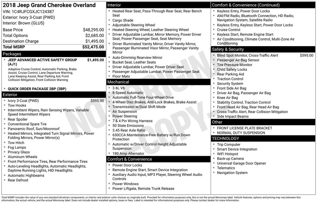2018 Jeep Grand Cherokee Overland 4WD 8-Speed Automatic 3.6L V6 24V VVT Ivory 3-Coat