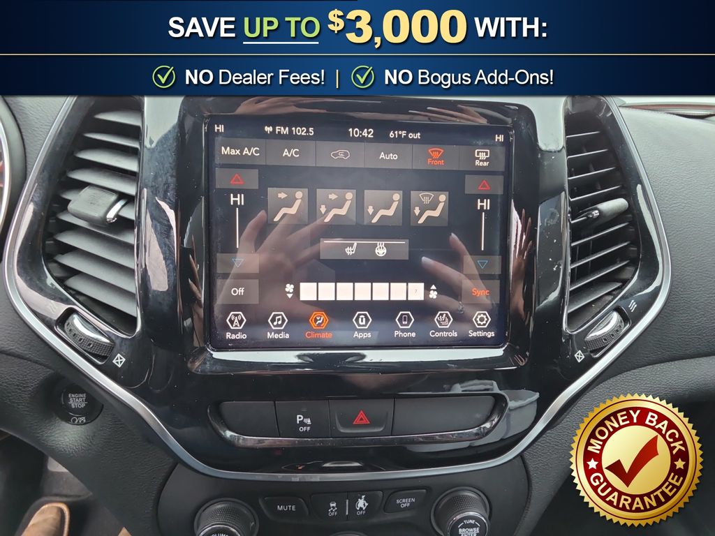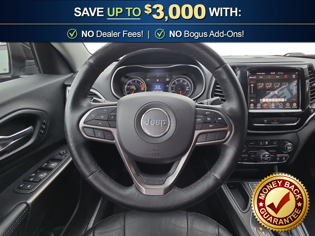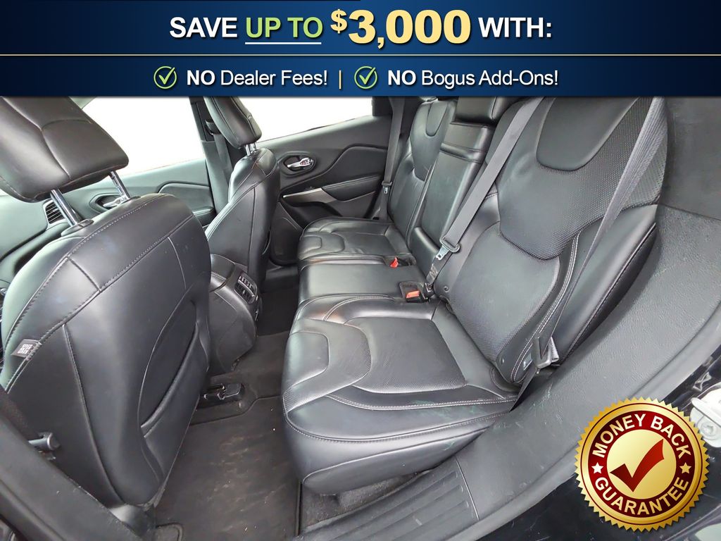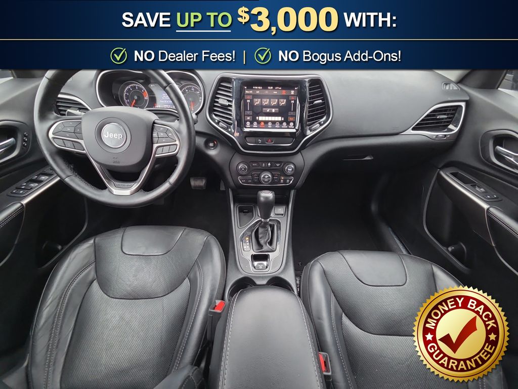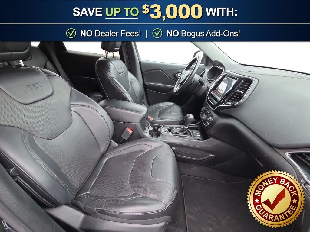 10 Speakers, 3.734 Axle Ratio, 4-Wheel Disc Brakes, 8.4" Touchscreen Display, ABS brakes, Air Conditioning, Alloy wheels, AM/FM radio: SiriusXM, Anti-whiplash front head restraints, Apple CarPlay, Apple CarPlay/Android Auto, Audio memory, Auto-dimming Rear-View mirror, Automatic temperature control, Auxiliary Transmission Oil Cooler, Brake assist, Bumpers: body-color, Compass, Delay-off headlights, Driver door bin, Driver vanity mirror, Dual front impact airbags, Dual front side impact airbags, Electronic Stability Control, Exterior Mirrors Courtesy Lamps, Exterior Mirrors w/Supplemental Signals, Four wheel independent suspension, Front anti-roll bar, Front Bucket Seats, Front Center Armrest, Front dual zone A/C, Front fog lights, Front reading lights, Fully automatic headlights, Garage door transmitter, Google Android Auto, GPS Antenna Input, Heated door mirrors, Heated front seats, Heated steering wheel, Illuminated entry, Integrated Voice Command w/Bluetooth, Knee airbag, Leather Shift Knob, Low tire pressure warning, Memory seat, Normal Duty Suspension, Occupant sensing airbag, Outside temperature display, Overhead airbag, Overhead console, Panic alarm, ParkView Rear Back-Up Camera, Passenger door bin, Passenger vanity mirror, Power door mirrors, Power driver seat, Power Liftgate, Power passenger seat, Power steering, Power windows, Premium Leather Trimmed Bucket Seats, Quick Order Package 2BG, Radio data system, Radio: Uconnect 4 w/8.4" Display, Rear anti-roll bar, Rear reading lights, Rear seat center armrest, Rear side impact airbag, Rear window defroster, Rear window wiper, Remote keyless entry, Roof rack: rails only, Security system, SiriusXM Satellite Radio, Speed control, Speed-sensing steering, Split folding rear seat, Spoiler, Steering wheel mounted audio controls, Stop-Start Multiple VSM System, Tachometer, Telescoping steering wheel, Tilt steering wheel, Traction control, Trip computer, Turn signal indicator mirrors, USB Host Flip, Variably intermittent wipers, Voltmeter, Wheels: 18" x 7" Polished/Painted Aluminum. 2019 Jeep Cherokee Limited
