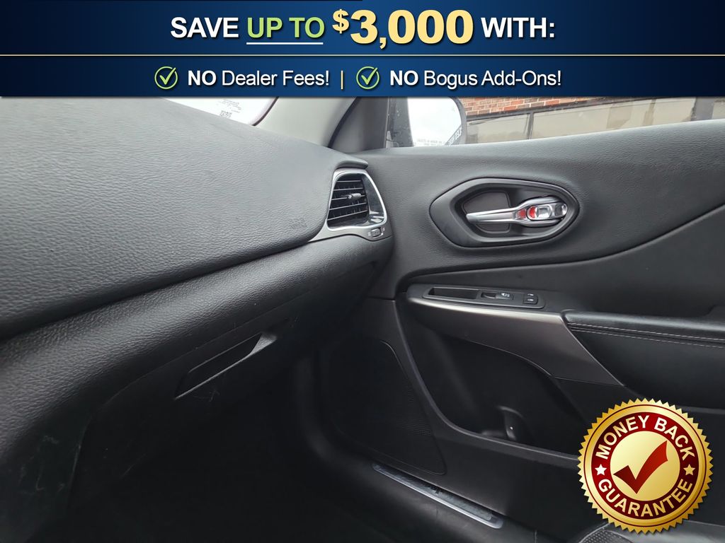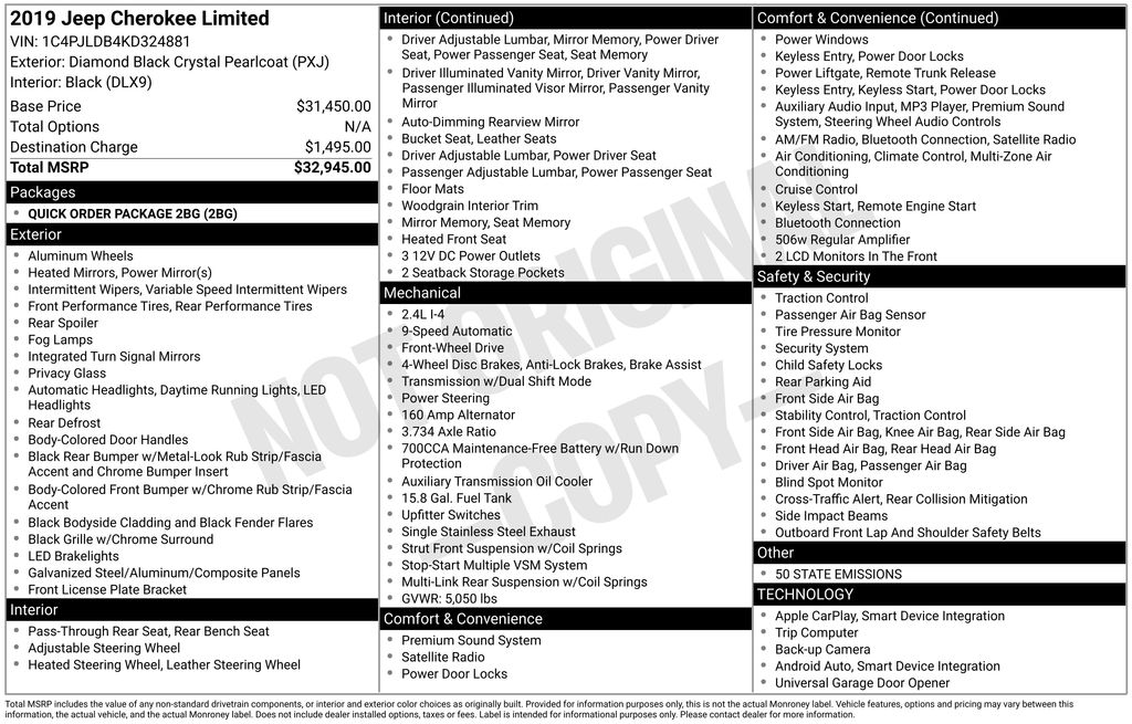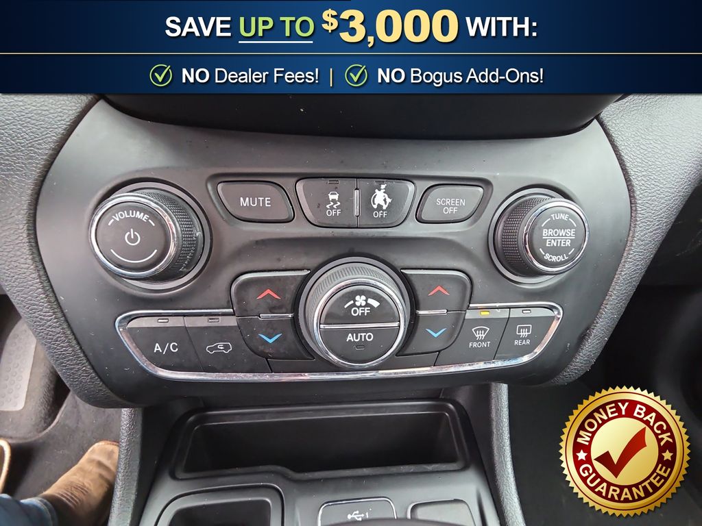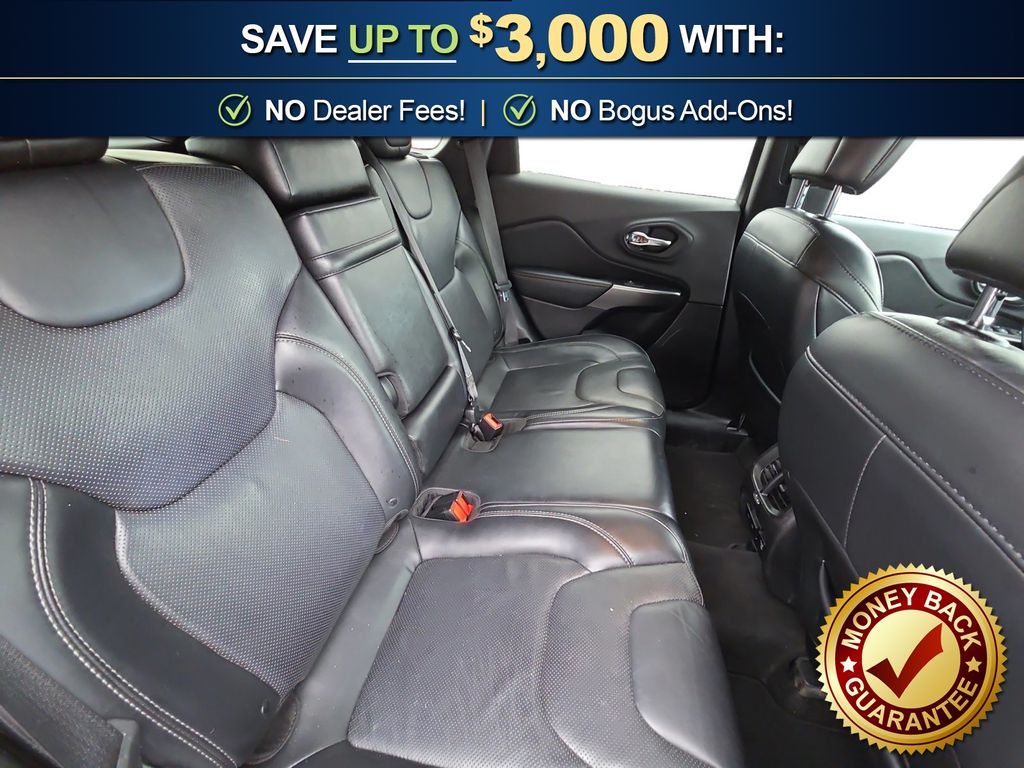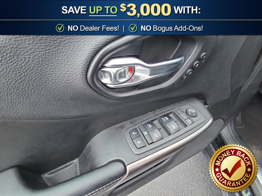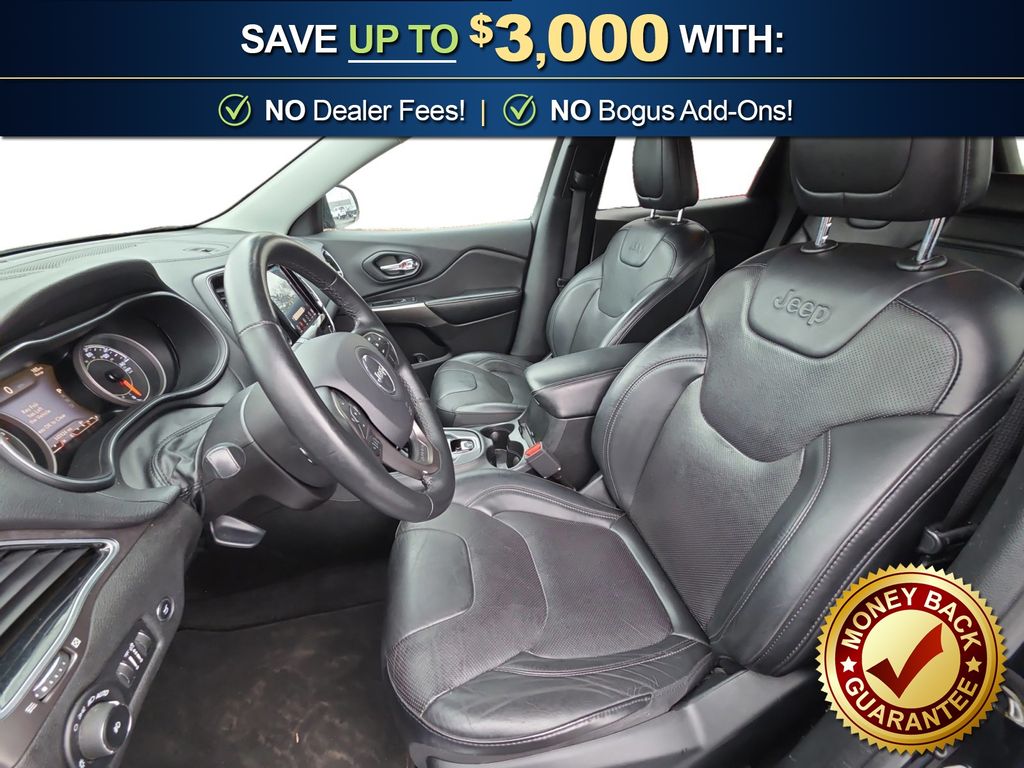 10 Speakers, 3.734 Axle Ratio, 4-Wheel Disc Brakes, 8.4" Touchscreen Display, ABS brakes, Air Conditioning, Alloy wheels, AM/FM radio: SiriusXM, Anti-whiplash front head restraints, Apple CarPlay, Apple CarPlay/Android Auto, Audio memory, Auto-dimming Rear-View mirror, Automatic temperature control, Auxiliary Transmission Oil Cooler, Brake assist, Bumpers: body-color, Compass, Delay-off headlights, Driver door bin, Driver vanity mirror, Dual front impact airbags, Dual front side impact airbags, Electronic Stability Control, Exterior Mirrors Courtesy Lamps, Exterior Mirrors w/Supplemental Signals, Four wheel independent suspension, Front anti-roll bar, Front Bucket Seats, Front Center Armrest, Front dual zone A/C, Front fog lights, Front reading lights, Fully automatic headlights, Garage door transmitter, Google Android Auto, GPS Antenna Input, Heated door mirrors, Heated front seats, Heated steering wheel, Illuminated entry, Integrated Voice Command w/Bluetooth, Knee airbag, Leather Shift Knob, Low tire pressure warning, Memory seat, Normal Duty Suspension, Occupant sensing airbag, Outside temperature display, Overhead airbag, Overhead console, Panic alarm, ParkView Rear Back-Up Camera, Passenger door bin, Passenger vanity mirror, Power door mirrors, Power driver seat, Power Liftgate, Power passenger seat, Power steering, Power windows, Premium Leather Trimmed Bucket Seats, Quick Order Package 2BG, Radio data system, Radio: Uconnect 4 w/8.4" Display, Rear anti-roll bar, Rear reading lights, Rear seat center armrest, Rear side impact airbag, Rear window defroster, Rear window wiper, Remote keyless entry, Roof rack: rails only, Security system, SiriusXM Satellite Radio, Speed control, Speed-sensing steering, Split folding rear seat, Spoiler, Steering wheel mounted audio controls, Stop-Start Multiple VSM System, Tachometer, Telescoping steering wheel, Tilt steering wheel, Traction control, Trip computer, Turn signal indicator mirrors, USB Host Flip, Variably intermittent wipers, Voltmeter, Wheels: 18" x 7" Polished/Painted Aluminum. 2019 Jeep Cherokee Limited