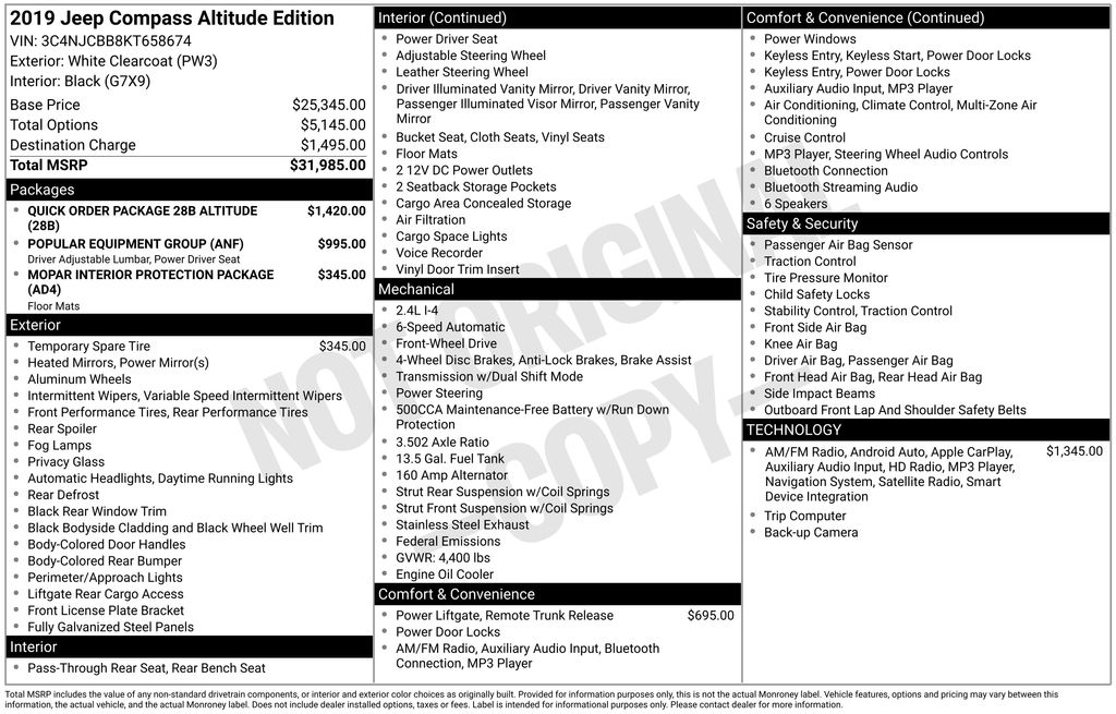 2019 Jeep Compass Altitude Certified. White Clearcoat Altitude FWD 6-Speed Aisin Automatic 2.4L I4 Jeep Certified, 1-Year SiriusXM Guardian Trial, 3.502 Axle Ratio, 4-Way Power Lumbar Adjust, 4-Wheel Disc Brakes, 6 Speakers, 8.4" Touch Screen Display, ABS brakes, Air Conditioning, Alloy wheels, Altitude Special Edition, AM/FM radio, Anti-whiplash front head restraints, Apple CarPlay, Automatic temperature control, Black Day Light Opening Moldings, Black Grille w/Black Rings, Black Roof, Bluetooth Integrated Voice Command, Bluetooth® Streaming Audio, Brake assist, Bright Exhaust Tip, Bumpers: body-color, Cluster 7.0" Color Driver Info Display, Compass, Delay-off headlights, Driver door bin, Driver vanity mirror, Dual front impact airbags, Dual front side impact airbags, Electronic Stability Control, Four wheel independent suspension, Front anti-roll bar, Front Bucket Seats, Front Center Armrest w/Storage, Front dual zone A/C, Front fog lights, Front reading lights, Fully automatic headlights, Gloss Black Compass Badge, Gloss Black Fog Lamp Bezels, Gloss Black Jeep Badge, Gloss Black Lower Rear Fascia Valance, Google Android Auto, GPS Antenna Input, GPS Navigation, HD Radio, Heated door mirrors, Illuminated entry, Knee airbag, Leather Shift Knob, Low tire pressure warning, Media Hub (USB, AUX), MOPAR All-Weather Floor Mats, MOPAR Interior Protection Package, MOPAR Molded Cargo Tray, Occupant sensing airbag, Outside temperature display, Overhead airbag, Overhead console, Panic alarm, ParkView Rear Back-Up Camera, Passenger door bin, Passenger vanity mirror, Piano Black Interior Accents, Popular Equipment Group, Power 8-Way Driver/Manual 6-Way Passenger Seats, Power door mirrors, Power Liftgate, Power steering, Power windows, Premium Cloth/Vinyl Bucket Seats, Quick Order Package 28B Altitude, Radio: Uconnect 4 w/7" Display, Radio: Uconnect 4C Nav w/8.4" Display, Rear anti-roll bar, Rear seat center armrest, Rear window defroster, Rear window wiper, Remote keyless entry, Roof rack: rails only, SiriusXM Traffic Plus, SiriusXM Travel Link, Speed control, Split folding rear seat, Spoiler, Steering wheel mounted audio controls, Tachometer, Telescoping steering wheel, Tilt steering wheel, Traction control, Trip computer, USB Host Flip, Variably intermittent wipers, Wheels: 17" x 7.0" Silver Painted Aluminum, Wheels: 18" x 7.0" Black Aluminum.