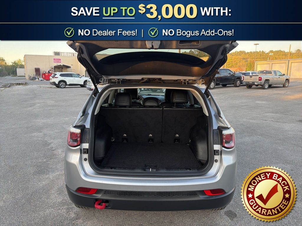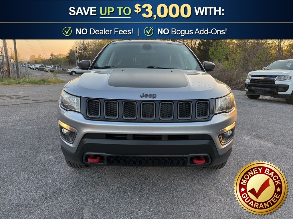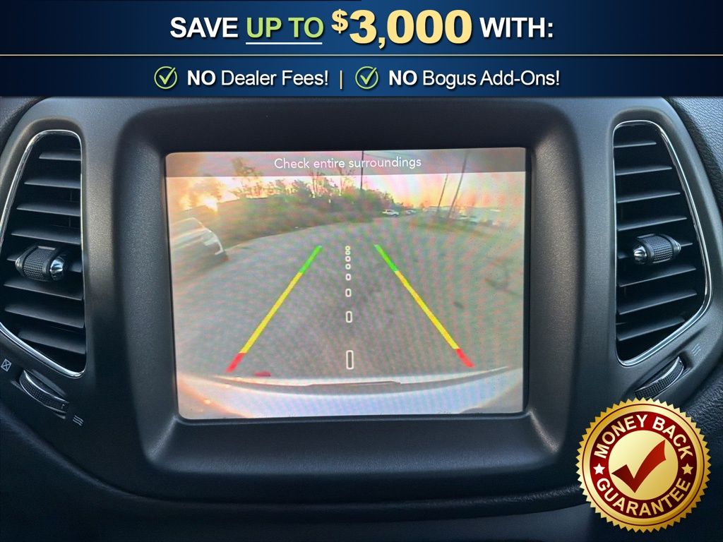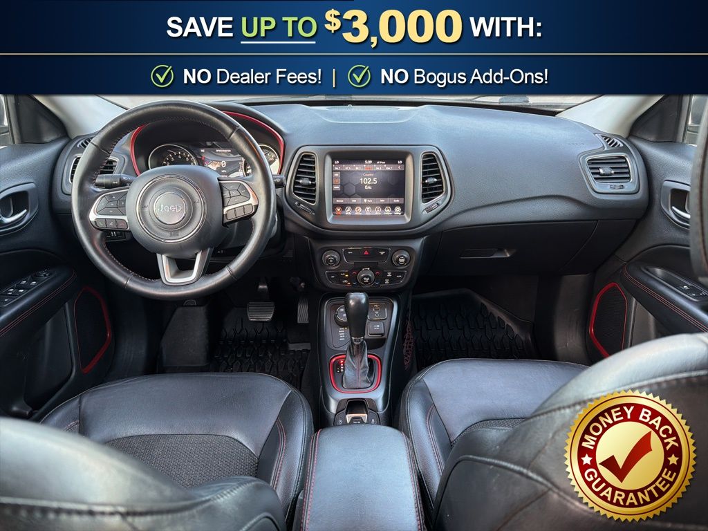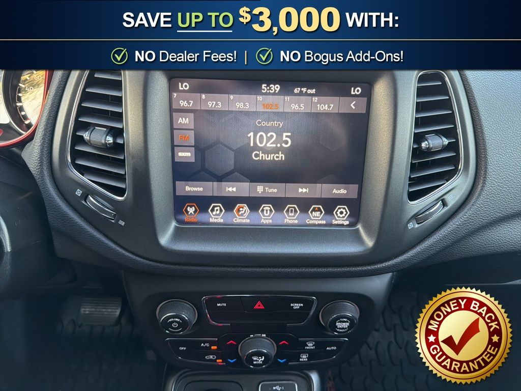 4WD, 4-Wheel Disc Brakes, 4.334 Axle Ratio, 6 Speakers, ABS brakes, Air Conditioning, Alloy wheels, AM/FM radio: SiriusXM, Anti-whiplash front head restraints, Apple CarPlay/Android Auto, Automatic temperature control, Brake assist, Bumpers: body-color, Compass, Delay-off headlights, Driver door bin, Driver vanity mirror, Dual front impact airbags, Dual front side impact airbags, Electronic Stability Control, Four wheel independent suspension, Front anti-roll bar, Front Bucket Seats, Front Center Armrest w/Storage, Front dual zone A/C, Front fog lights, Front reading lights, Fully automatic headlights, Google Android Auto, GPS Antenna Input, Heated door mirrors, Illuminated entry, Knee airbag, Leather Shift Knob, Low tire pressure warning, Manufacturer's Statement of Origin, Occupant sensing airbag, Outside temperature display, Overhead airbag, Overhead console, Panic alarm, ParkView Rear Back-Up Camera, Passenger door bin, Passenger vanity mirror, Power door mirrors, Power steering, Power windows, Premium Cloth/Leather Trim Bucket Seats, Quick Order Package 27E (DISC), Radio: Uconnect 4 w/8.4" Display, Rear anti-roll bar, Rear seat center armrest, Rear window defroster, Rear window wiper, Remote keyless entry, Roof rack: rails only, Speed control, Split folding rear seat, Spoiler, Steering wheel mounted audio controls, Tachometer, Telescoping steering wheel, Tilt steering wheel, Traction control, Trip computer, Turn signal indicator mirrors, USB Host Flip, Variably intermittent wipers, Wheels: 17" x 6.5" Painted/Bright Aluminum, 4WD. 2019 Jeep Compass Trailhawk
