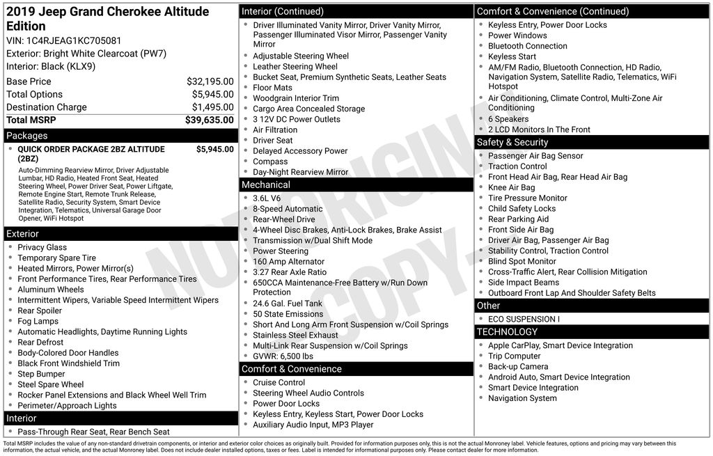 1-Year SiriusXM Radio Service, 1-Yr SiriusXM Guardian Trial, 115V Auxiliary Power Outlet, 3.27 Rear Axle Ratio, 4-Wheel Disc Brakes, 4G LTE Wi-Fi Hot Spot, 5-Year SiriusXM Traffic Service, 5-Year SiriusXM Travel Link Service, 6 Speakers, 8.4" Touchscreen Display, ABS brakes, Air Conditioning, Alloy wheels, Altitude Grille, Altitude IV Package, AM/FM radio, Anti-whiplash front head restraints, Apple CarPlay, Apple CarPlay/Android Auto, Auto-Dimming Rear-View Mirror, Automatic temperature control, Black Suede Seats w/Black Stitching, Body Color Claddings, Body Color Fascia, Body Color Shark Fin Antenna, Brake assist, Bumpers: body-color, Cargo Compartment Cover, Cloth Bucket Seats, Compass, Dark Day Light Opening Moldings, Dark Headlamp Bezel Finish, Dark Lens Taillamps, Delay-off headlights, Driver door bin, Driver vanity mirror, Dual front impact airbags, Dual front side impact airbags, Eco Suspension I, Electronic Stability Control, Four wheel independent suspension, Front Accent/Body Color Fascia, Front anti-roll bar, Front Bucket Seats, Front Center Armrest w/Storage, Front dual zone A/C, Front fog lights, Front reading lights, Fully automatic headlights, Gloss Black Rear Fascia Applique, Google Android Auto, GPS Antenna Input, GPS Navigation, HD Radio, Heated door mirrors, Heated Front Seats, Heated Steering Wheel, Illuminated entry, Integrated Center Stack Radio, Integrated Voice Command w/Bluetooth, Jeep Black Gloss Badging, Knee airbag, Leather Shift Knob, Low tire pressure warning, Occupant sensing airbag, Outside temperature display, Overhead airbag, Overhead console, Panic alarm, ParkView Rear Back-Up Camera, Passenger door bin, Passenger vanity mirror, Power 4-Way Driver Lumbar Adjust, Power 8-Way Driver/Manual Passenger Seat, Power door mirrors, Power Liftgate, Power steering, Power windows, Quick Order Package 2BZ Altitude, Radio data system, Radio: Uconnect 4 w/7" Display, Radio: Uconnect 4C Nav w/8.4" Display, Rear Accent/Body Color Fascia, Rear anti-roll bar, Rear Fascia Black MIC Step Pad, Rear reading lights, Rear seat center armrest, Rear window defroster, Rear window wiper, Remote keyless entry, Security & Convenience Group, Security Alarm, Single Exhaust w/Bright Tip, SiriusXM Satellite Radio, SiriusXM Traffic Plus, SiriusXM Travel Link, Speed control, Speed-sensing steering, Speed-Sensitive Wipers, Split folding rear seat, Spoiler, Steering Wheel Mounted Audio Controls, Steering wheel mounted audio controls, Tachometer, Telescoping steering wheel, Tilt steering wheel, Traction control, Trip computer, Universal Garage Door Opener, USB Host Flip, Variably intermittent wipers, Wheels: 17" x 8.0" Silver Aluminum, Wheels: 20" x 8.0" Gloss Black Aluminum. 2019 Jeep Grand Cherokee Altitude