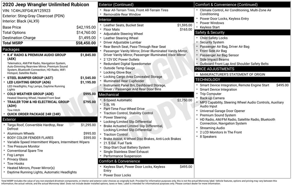 2020 Jeep Wrangler Unlimited Rubicon Sting-Gray Clearcoat Unlimited Rubicon 4WD 8-Speed Automatic 3.6L V6 24V VVT 1-Year SiriusXM Guardian Trial, 240 Amp Alternator, 4-Wheel Disc Brakes, 4.10 Rear Axle Ratio, 4G LTE Wi-Fi Hot Spot, 5-Year SiriusXM Traffic Service, 5-Year SiriusXM Travel Link Service, 7 & 4 Pin Wiring Harness, 700 Amp Maintenance Free Battery, 8 Speakers, 8.4" Radio & Premium Audio Group, 8.4" Touchscreen Display, ABS brakes, Air Conditioning, Alloy wheels, Alpine Premium Audio System, AM/FM radio: SiriusXM, Apple CarPlay/Android Auto, Auto-Dimming Rear-View Mirror, Automatic temperature control, Aux Battery, Auxiliary Switches, BF Goodrich Brand Tires, Black 3-Piece Hard Top, Body Color Fender Flares, Brake assist, Class II Receiver Hitch, Cold Weather Group, Compass, Daytime Running Lamps LED Accents, Delay-off headlights, Driver door bin, Driver vanity mirror, Dual front impact airbags, Dual front side impact airbags, Electronic Stability Control, Emergency/Assistance Call, For Details, Visit DriveUconnect.com, Freedom Panel Storage Bag, Front anti-roll bar, Front Bucket Seats, Front Center Armrest w/Storage, Front dual zone A/C, Front fog lights, Front LED Fog Lamps, Front reading lights, Fully automatic headlights, Garage door transmitter, GPS Navigation, HD Radio, Heated door mirrors, Heated Front Seats, Heated Steering Wheel, Illuminated entry, Integrated roll-over protection, Leather steering wheel, LED Lighting Group, LED Reflector Headlamps, LED Taillamps, Low tire pressure warning, Manufacturer's Statement of Origin, MOPAR All-Weather Floor Mats (DISC), No Soft Top, Non-Lock Fuel Cap w/o Discriminator, Occupant sensing airbag, Outside temperature display, Panic alarm, ParkView Rear Back-Up Camera, Passenger door bin, Passenger vanity mirror, Performance Suspension, Power door mirrors, Power steering, Power windows, Premium Cloth Low-Back Bucket Seats, Quick Order Package 24R, Radio data system, Radio: Uconnect 4 w/7" Display, Radio: Uconnect 4C Nav w/8.4" Display, Rear anti-roll bar, Rear reading lights, Rear Window Defroster, Rear Window Wiper/Washer, Remote keyless entry, Remote Proximity Keyless Entry, Remote Start System, Security system, SiriusXM Traffic Plus, SiriusXM Travel Link, Speed control, Split folding rear seat, Steel Bumper Group, Steel Front Bumper, Steel Rear Bumper, Steering wheel mounted audio controls, Stop-Start Dual Battery System, Tachometer, Telescoping steering wheel, Tilt steering wheel, Traction control, Trailer Tow & HD Electrical Group, Trip computer, Variably intermittent wipers, Voltmeter, Wheels: 17" x 7.5" Black w/Machined Lip, Wheels: 17" x 7.5" Machined w/Black Pockets.