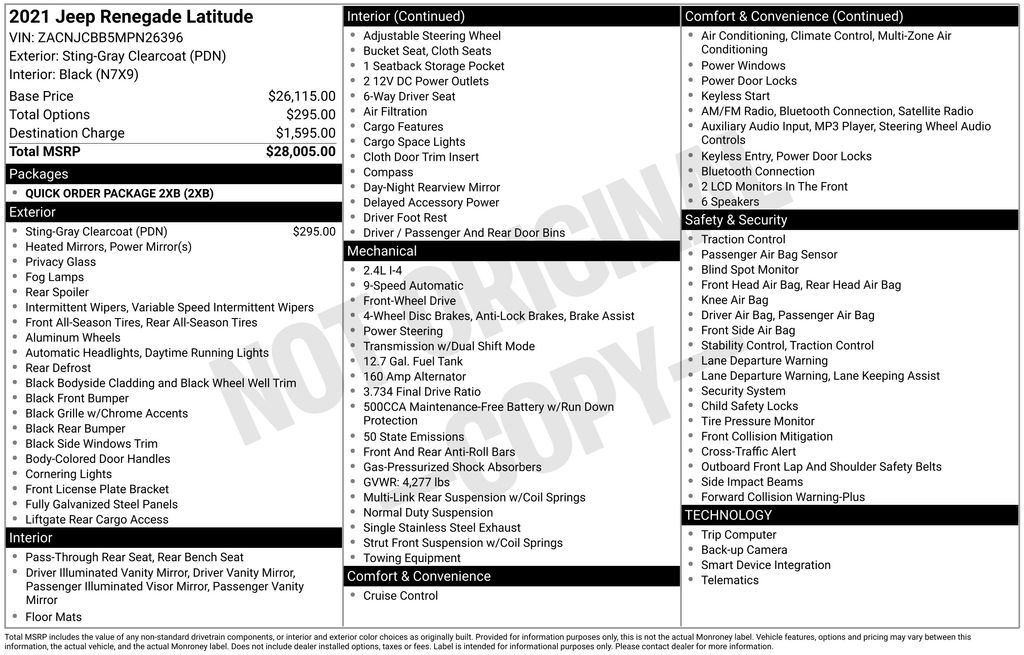 2021 Jeep Renegade Latitude Sting-Gray Clearcoat Latitude FWD 9-Speed 948TE Automatic 2.4L I4 17" x 7.0" Aluminum Wheels, 3.734 Final Drive Ratio, 4-Wheel Disc Brakes, 6 Speakers, ABS brakes, Air Conditioning, Alloy wheels, AM/FM radio: SiriusXM, Anti-whiplash front head restraints, Apple CarPlay/Android Auto, Automatic temperature control, Brake assist, Compass, Delay-off headlights, Driver door bin, Driver vanity mirror, Dual front impact airbags, Dual front side impact airbags, Electronic Stability Control, Emergency communication system: SiriusXM Guardian, Four wheel independent suspension, Front anti-roll bar, Front Bucket Seats, Front Center Armrest, Front dual zone A/C, Front fog lights, Front reading lights, Fully automatic headlights, Heated door mirrors, Illuminated entry, Knee airbag, Low tire pressure warning, Manual Adjust 4-Way Front Passenger Seat, Normal Duty Suspension, Occupant sensing airbag, Outside temperature display, Overhead airbag, Panic alarm, ParkView Rear Back-Up Camera, Passenger door bin, Passenger vanity mirror, Power door mirrors, Power steering, Power windows, Premium Cloth Bucket Seats, Quick Order Package 2XB, Radio data system, Radio: Uconnect 4 w/7" Display, Rear anti-roll bar, Rear window defroster, Rear window wiper, Remote keyless entry, Roof rack: rails only, Security system, Speed control, Split folding rear seat, Spoiler, Steering wheel mounted audio controls, Tachometer, Telescoping steering wheel, Tilt steering wheel, Traction control, Trip computer, Variably intermittent wipers, Voltmeter.