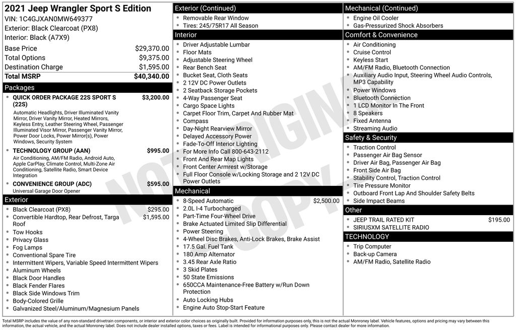 2021 Jeep Wrangler Sport S Black Clearcoat Sport S 4WD 8-Speed Automatic 2.0L I4 DOHC 110 mph Vehicle Max Speed Calibration, 3.45 Rear Axle Ratio, 4-Wheel Disc Brakes, 7.0" Touchscreen Display, 8 Speakers, ABS brakes, Air Conditioning, Air Conditioning w/Auto Temperature Control, Air Filtering, AM/FM radio, Apple CarPlay, Automatic Headlamps, Black 3-Piece Hard Top, Brake assist, Cloth Low-Back Bucket Seats, Cluster 7.0" TFT Color Display, Compass, Convenience Group, Deep Tint Sunscreen Windows, Delay-off headlights, Driver door bin, Driver vanity mirror, Dual front impact airbags, Dual front side impact airbags, Electronic Stability Control, For More Info Call 800-643-2112, Freedom Panel Storage Bag, Front 1-Touch Down Power Windows, Front anti-roll bar, Front Bucket Seats, Front Center Armrest w/Storage, Front fog lights, Front reading lights, Google Android Auto, GPS Antenna Input, Integrated Center Stack Radio, Integrated roll-over protection, Jeep Trail Rated Kit, Leather Wrapped Steering Wheel, Low tire pressure warning, No Soft Top, Normal Duty Suspension, Occupant sensing airbag, Outside temperature display, ParkView Rear Back-Up Camera, Passenger door bin, Passenger vanity mirror, Power Heated Mirrors, Power steering, Quick Order Package 22S Sport S, R1234YF A/C Refrigerant, Radio data system, Radio: Uconnect 3 w/5" Display, Radio: Uconnect 4 w/7" Display, Rear anti-roll bar, Rear reading lights, Rear Window Defroster, Rear Window Wiper/Washer, Remote Keyless Entry, Security Alarm, SiriusXM Radio Service, SiriusXM Satellite Radio, Speed control, Speed Sensitive Power Locks, Sport S, Steering wheel mounted audio controls, Sun Visors w/Illuminated Vanity Mirrors, Tachometer, Technology Group, Telescoping steering wheel, Tilt steering wheel, Traction control, Trip computer, Universal Garage Door Opener, USB Host Flip, Variably intermittent wipers, Wheels: 17" x 7.5" Black Steel Styled, Wheels: 17" x 7.5" Tech Silver Aluminum.