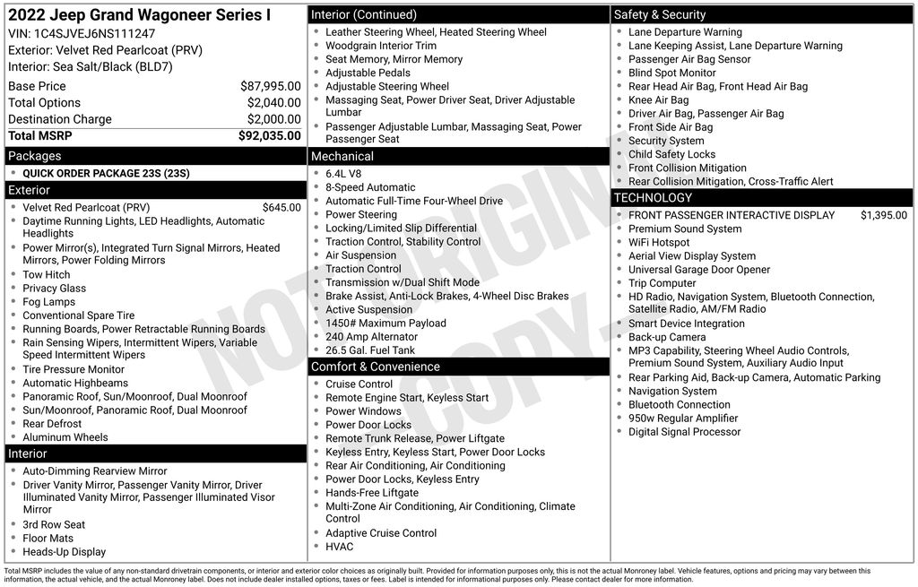 Recent Arrival! 19 Speakers, 3.92 Rear Axle Ratio, 3rd row seats: bench, 4-Wheel Disc Brakes, ABS brakes, Adjustable pedals, Air Conditioning, Alloy wheels, AM/FM radio: SiriusXM with 360L, Anti-whiplash front head restraints, Audio memory, Auto High-beam Headlights, Auto-dimming door mirrors, Auto-dimming Rear-View mirror, Auto-leveling suspension, Automatic temperature control, Body Color Roof, Brake assist, Bumpers: body-color, Compass, Delay-off headlights, Driver door bin, Driver vanity mirror, Driver's Seat Mounted Armrest, Dual front impact airbags, Dual front side impact airbags, Electronic Stability Control, Four wheel independent suspension, Front anti-roll bar, Front Bucket Seats, Front Center Armrest w/Storage, Front dual zone A/C, Front fog lights, Front Passenger Interactive Display, Front reading lights, Fully automatic headlights, Garage door transmitter, Genuine wood console insert, Genuine wood dashboard insert, Genuine wood door panel insert, Heads-Up Display, Heated door mirrors, Heated front seats, Heated rear seats, Heated steering wheel, Illuminated entry, Knee airbag, Leather steering wheel, Leather Trimmed Bucket Seats, Low tire pressure warning, Memory seat, Navigation System, Normal Duty Suspension, Occupant sensing airbag, Outside temperature display, Overhead airbag, Overhead console, Panic alarm, Passenger door bin, Passenger seat mounted armrest, Passenger vanity mirror, Pedal memory, Power adjustable front head restraints, Power door mirrors, Power driver seat, Power Liftgate, Power moonroof, Power passenger seat, Power steering, Power windows, Quick Order Package 23S, Radio data system, Radio: Uconnect 5 Nav w/12.0" Display, Rain sensing wipers, Rear air conditioning, Rear anti-roll bar, Rear dual zone A/C, Rear reading lights, Rear seat center armrest, Rear window defroster, Rear window wiper, Reclining 3rd row seat, Remote keyless entry, Security system, Speed control, Speed-sensing steering, Speed-Sensitive Wipers, Split folding rear seat, Steering wheel memory, Steering wheel mounted audio controls, Tachometer, Telescoping steering wheel, Tilt steering wheel, Traction control, Trip computer, Turn signal indicator mirrors, Two Tone Paint Group, Variably intermittent wipers, Ventilated front seats, Voltmeter, Wheels: 20" x 9.0" Premium 3 Aluminum.