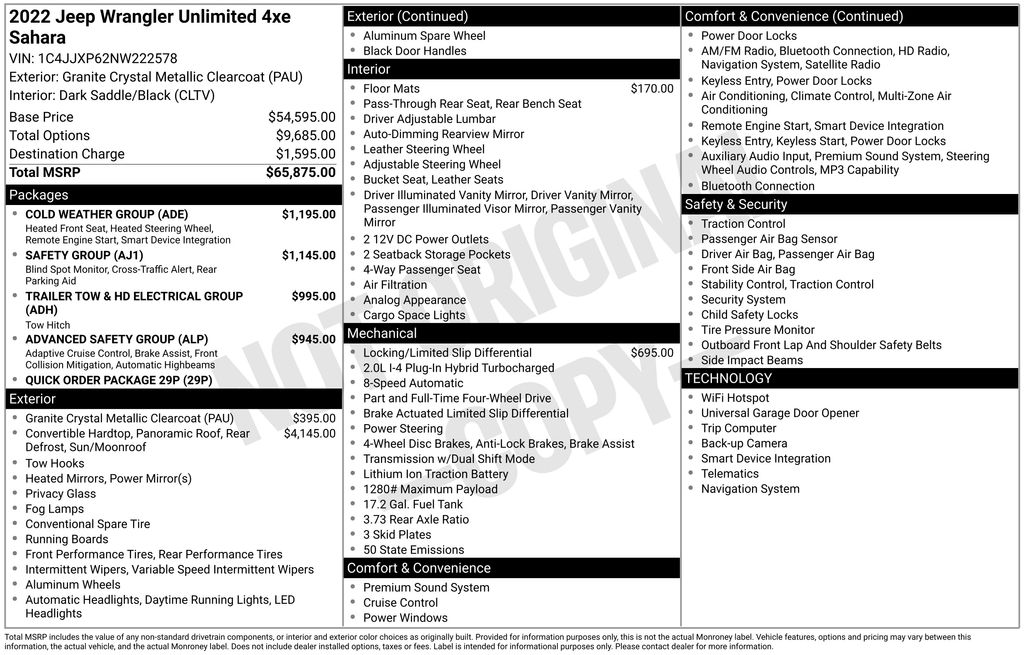 Recent Arrival! 2.0L I4 DOHC, 3.73 Rear Axle Ratio, 4-Wheel Disc Brakes, 7 & 4 Pin Wiring Harness, 700 Amp Maintenance Free Battery, 9 Speakers, ABS brakes, Adaptive Cruise Control w/Stop, Advanced Brake Assist, Advanced Safety Group, Air Conditioning, Alloy wheels, AM/FM radio, Anti-Spin Differential Rear Axle, Apple CarPlay/Android Auto, Auto High Beam Headlamp Control, Auto-dimming Rear-View mirror, Automatic temperature control, Auxiliary Switches, Blind Spot & Cross Path Detection, Brake assist, Class II Receiver Hitch, Cold Weather Group, Compass, Delay-off headlights, Driver door bin, Driver vanity mirror, Dual front impact airbags, Dual front side impact airbags, Electronic Stability Control, Emergency communication system: SiriusXM Guardian, Front anti-roll bar, Front Bucket Seats, Front Center Armrest w/Storage, Front dual zone A/C, Front fog lights, Front reading lights, Full Speed Forward Collision Warning Plus, Fully automatic headlights, Garage door transmitter, Heated door mirrors, Heated Front Seats, Heated Steering Wheel, Illuminated entry, Integrated roll-over protection, Leather Shift Knob, Leather steering wheel, Low tire pressure warning, MOPAR All-Weather Floor Mats, Navigation System, Occupant sensing airbag, Outside temperature display, Panic alarm, ParkSense Rear Park Assist System, ParkView Rear Back-Up Camera, Passenger door bin, Passenger vanity mirror, Power door mirrors, Power steering, Power Top Quarter Window Storage Bag, Power windows, Premium McKinley Trimmed Seats, Quick Order Package 29P, Radio data system, Radio: Uconnect 4C Nav w/8.4" Display, Rear anti-roll bar, Rear reading lights, Rear seat center armrest, Remote keyless entry, Remote Start System, Removable Rear Quarter Windows, Safety Group, Security system, Sky 1-Touch Power Top, Speed control, Split folding rear seat, Sport Suspension, Steering wheel mounted audio controls, Tachometer, Telescoping steering wheel, Tilt steering wheel, Traction control, Trailer Tow & HD Electrical Group, Trip computer, Variably intermittent wipers, Voltmeter, Wheels: 20" x 8" Fully Painted Aluminum, 2.0L I4 DOHC.