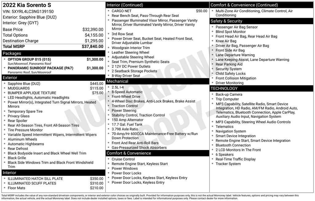 2022 Kia Sorento S Sapphire Blue S FWD 8-Speed Automatic 2.5L I4 DGI DOHC 16V LEV3-ULEV70 191hp 3.798 Axle Ratio, 3rd row seats: split-bench, 4-Wheel Disc Brakes, 6 Speakers, ABS brakes, Air Conditioning, Alloy wheels, AM/FM radio: SiriusXM, Apple CarPlay & Android Auto, Auto High-beam Headlights, Automatic temperature control, Brake assist, Bumper Applique Texture, Bumpers: body-color, Cargo Net, Carpeted Floor Mats, Delay-off headlights, Driver door bin, Driver vanity mirror, Dual front impact airbags, Dual front side impact airbags, Electronic Stability Control, Emergency communication system: UVO Link, Exterior Parking Camera Rear, Four wheel independent suspension, Front anti-roll bar, Front Bucket Seats, Front Center Armrest, Front dual zone A/C, Front reading lights, Fully automatic headlights, Heated door mirrors, Heated Front Bucket Seats, Heated front seats, Illuminated entry, Illuminated Hatch Sill Plate, Illuminated Scuff Plates, Knee airbag, Leather Shift Knob, Leather steering wheel, LED Interior Lighting, Low tire pressure warning, Mudguards, Navigation System, Occupant sensing airbag, Outside temperature display, Overhead airbag, Overhead console, Panic alarm, Panoramic Sunroof Package, Passenger door bin, Passenger vanity mirror, Power door mirrors, Power driver seat, Power steering, Power Sunroof w/Power Sunshade, Power windows, Radio data system, Radio: AM/FM Audio System, Rear air conditioning, Rear anti-roll bar, Rear reading lights, Rear seat center armrest, Rear window defroster, Rear window wiper, Remote keyless entry, Roof rack: rails only, Security system, Smart Key w/ Push Button and Remote Start, Speed control, Speed-sensing steering, Split folding rear seat, Spoiler, Steering wheel mounted audio controls, SynTex Artificial Leather Seat Trim, Tachometer, Telescoping steering wheel, Tilt steering wheel, Traction control, Trip computer, Turn signal indicator mirrors, Variably intermittent wipers, Wheels: 7.5J x 18" Machine-Finished Alloy.