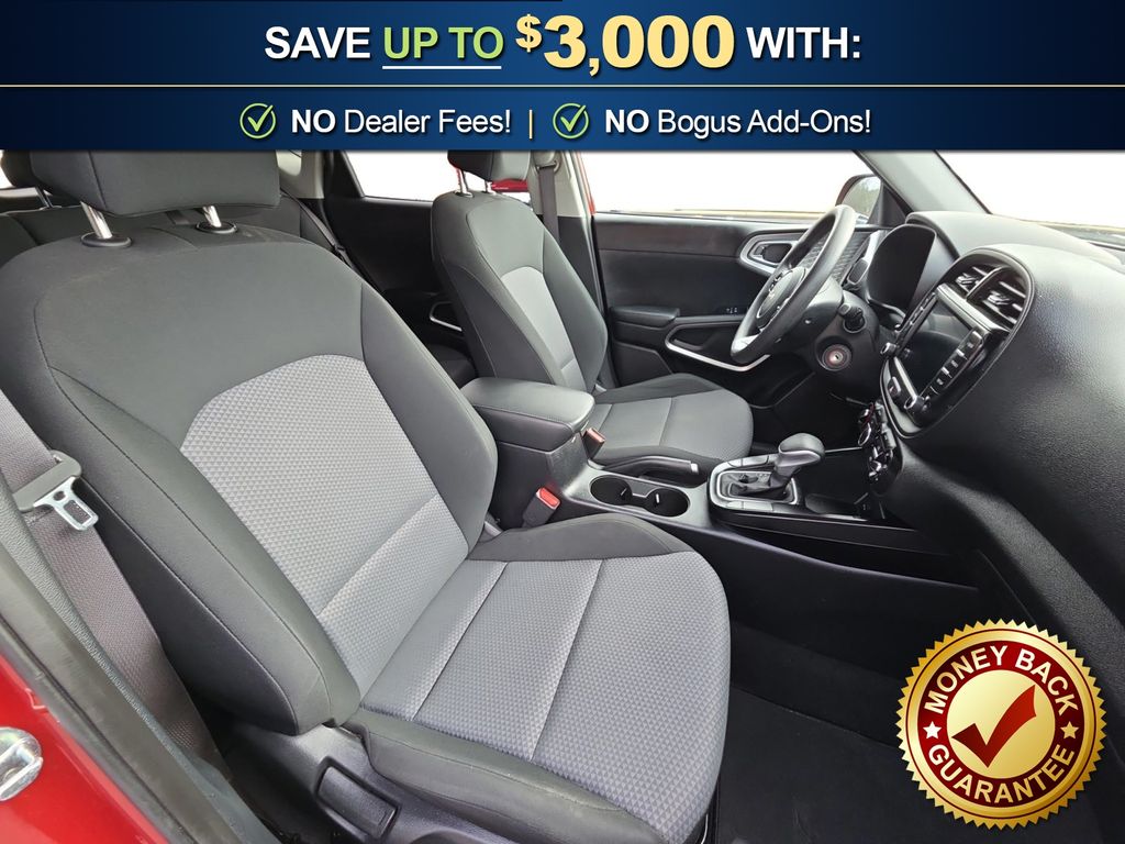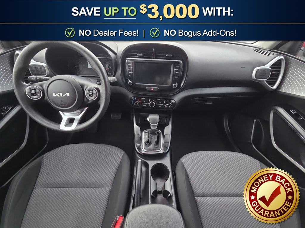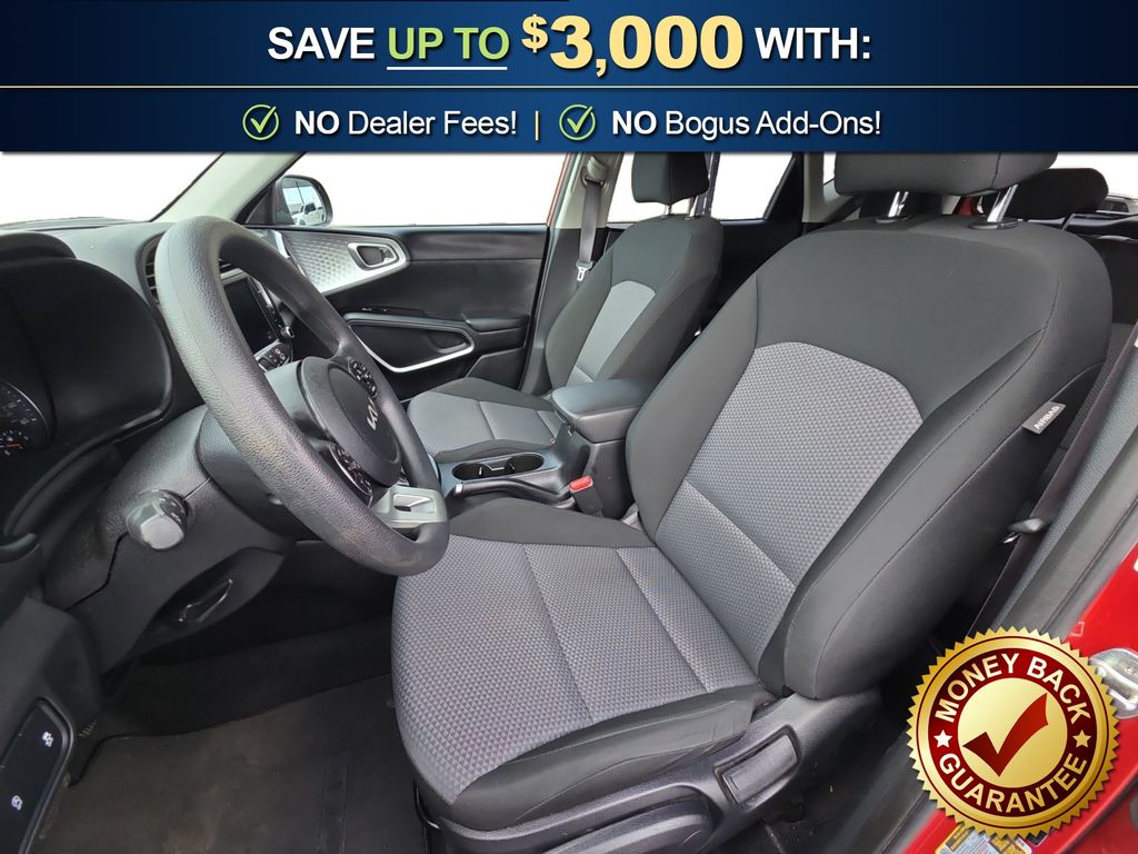 16" x 6.5" Alloy Wheels, 16" x 6.5" Steel Wheels, 4-Wheel Disc Brakes, 6 Speakers, ABS brakes, Air Conditioning, AM/FM radio, Apple CarPlay & Android Auto, Brake assist, Bumpers: body-color, Carpeted Floor Mats, Delay-off headlights, Driver door bin, Driver vanity mirror, Dual front impact airbags, Dual front side impact airbags, Electronic Stability Control, Exterior Parking Camera Rear, Front anti-roll bar, Front Bucket Seats, Front Center Armrest, Front reading lights, Front wheel independent suspension, Fully automatic headlights, Illuminated entry, Low tire pressure warning, Occupant sensing airbag, Outside temperature display, Overhead airbag, Overhead console, Panic alarm, Passenger door bin, Passenger vanity mirror, Power door mirrors, Power steering, Power windows, Radio: AM/FM/MP3 Audio System, Rear window defroster, Rear window wiper, Remote keyless entry, Speed control, Speed-sensing steering, Split folding rear seat, Steering wheel mounted audio controls, Tachometer, Telescoping steering wheel, Tilt steering wheel, Traction control, Trip computer, Variably intermittent wipers, Woven & Tricot Cloth Seat Trim. 2022 Kia Soul LX