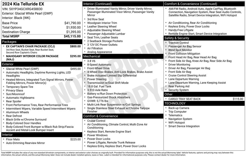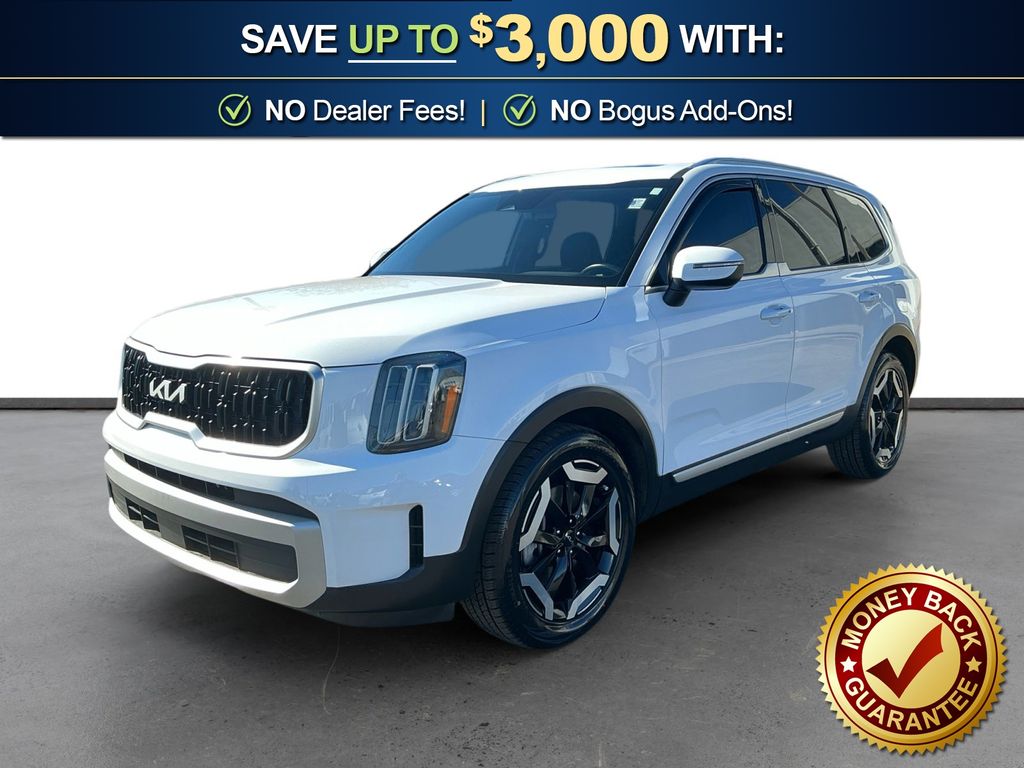 2024 Kia Telluride EX Glacial White Pearl EX FWD 8-Speed Automatic 3.8L V6 DOHC 2nd Row Captain Chairs, 3.510 Axle Ratio, 3rd row seats: split-bench, 4-Wheel Disc Brakes, 6 Speakers, ABS brakes, Air Conditioning, Alloy wheels, AM/FM radio: SiriusXM, Apple CarPlay & Android Auto, Auto High-beam Headlights, Auto-dimming Rear-View mirror, Automatic temperature control, Brake assist, Bumpers: body-color, Cargo Tray Seat Back, Carpet Floor Mats, Compass, Delay-off headlights, Driver door bin, Driver vanity mirror, Dual front impact airbags, Dual front side impact airbags, Electronic Stability Control, Emergency communication system: 911 Connect, EX Captain's Chair Package, Exterior Parking Camera Rear, Four wheel independent suspension, Front anti-roll bar, Front Bucket Seats, Front Center Armrest, Front dual zone A/C, Front reading lights, Fully automatic headlights, Heated & Ventilated Front Bucket Seats, Heated door mirrors, Heated front seats, Illuminated entry, Knee airbag, Leather Seat Trim, Leather Shift Knob, Leather steering wheel, Low tire pressure warning, Mahogany Interior Color Package, Navigation System, Occupant sensing airbag, Outside temperature display, Overhead airbag, Overhead console, Panic alarm, Passenger door bin, Passenger vanity mirror, Power door mirrors, Power driver seat, Power Liftgate, Power moonroof, Power passenger seat, Power steering, Power windows, Radio data system, Radio: AM/FM Display Audio System, Rear air conditioning, Rear anti-roll bar, Rear audio controls, Rear reading lights, Rear seat center armrest, Rear side impact airbag, Rear window defroster, Rear window wiper, Reclining 3rd row seat, Remote keyless entry, Roof rack: rails only, Security system, Smart Key w/ Push Button and Remote Start, Speed control, Speed-sensing steering, Split folding rear seat, Spoiler, Steering wheel mounted audio controls, Tachometer, Telescoping steering wheel, Tilt steering wheel, Traction control, Trip computer, Turn signal indicator mirrors, Variably intermittent wipers, Ventilated front seats, Wheels: 20" x 7.5" Black Finish.