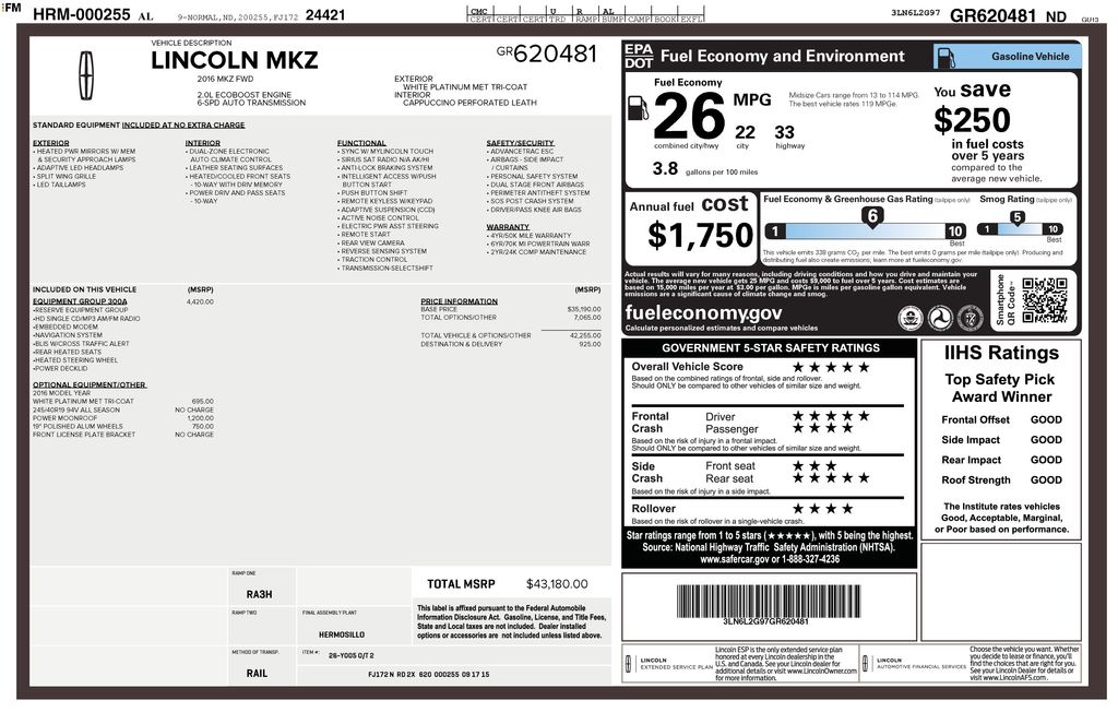 2016 Lincoln MKZ Base Certified. White Platinum Metallic Tri-Coat FWD 6-Speed Automatic with Select-Shift EcoBoost 2.0L I4 GTDi DOHC Turbocharged VCT Lincoln Certified, 11 Speakers, 18" Premium Painted Aluminum Wheels, 4-Wheel Disc Brakes, ABS brakes, Adaptive suspension, Air Conditioning, Alloy wheels, AM/FM radio: SiriusXM, Auto-dimming door mirrors, Auto-dimming Rear-View mirror, Automatic temperature control, Brake assist, Bumpers: body-color, CD player, Compass, Delay-off headlights, Driver door bin, Driver vanity mirror, Dual front impact airbags, Dual front side impact airbags, Electronic Stability Control, Emergency communication system: 911 Assist, Exterior Parking Camera Rear, Four wheel independent suspension, Front anti-roll bar, Front Bucket Seats, Front Center Armrest, Front dual zone A/C, Front reading lights, Fully automatic headlights, Garage door transmitter, Genuine wood dashboard insert, Genuine wood door panel insert, Heated door mirrors, Heated front seats, Illuminated entry, Knee airbag, Leather steering wheel, Lincoln Luxury Soft Touch Leatherette Seats, Low tire pressure warning, Memory seat, Occupant sensing airbag, Outside temperature display, Overhead airbag, Overhead console, Panic alarm, Passenger door bin, Passenger vanity mirror, Power door mirrors, Power driver seat, Power passenger seat, Power steering, Power windows, Radio data system, Radio: Lincoln Premium Sound System w/SingleCD/MP3, Rear anti-roll bar, Rear Parking Sensors, Rear reading lights, Rear seat center armrest, Rear window defroster, Remote keyless entry, Security system, Speed control, Speed-sensing steering, Speed-Sensitive Wipers, Split folding rear seat, Steering wheel mounted audio controls, SYNC w/MyLincoln Touch, Tachometer, Telescoping steering wheel, Tilt steering wheel, Traction control, Trip computer, Turn signal indicator mirrors, Variably intermittent wipers.