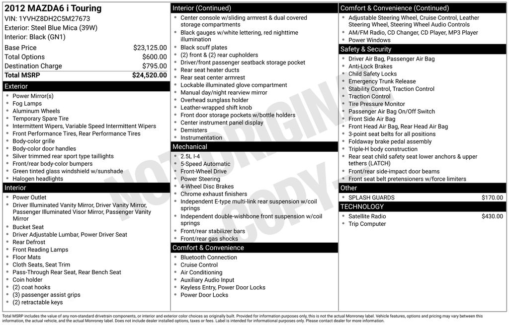 2012 Mazda Mazda6 i Touring Steel Blue Mica i Touring FWD 5-Speed Automatic with Manual Mode 2.5L 4-Cylinder DOHC 16V 17" x 7" JJ Alloy Wheels, 4-Wheel Disc Brakes, 6 Speakers, ABS brakes, Air Conditioning, Alloy wheels, AM/FM radio, Anti-whiplash front head restraints, Brake assist, Bumpers: body-color, CD player, Cloth Seat Trim, Delay-off headlights, Driver door bin, Driver vanity mirror, Dual front impact airbags, Dual front side impact airbags, Electronic Stability Control, Four wheel independent suspension, Front anti-roll bar, Front Bucket Seats, Front Center Armrest, Front fog lights, Front reading lights, Illuminated entry, Leather Shift Knob, Low tire pressure warning, Occupant sensing airbag, Outside temperature display, Overhead airbag, Overhead console, Panic alarm, Passenger door bin, Passenger vanity mirror, Power door mirrors, Power driver seat, Power steering, Power windows, Radio: AM/FM/6-Disc CD/MP3 Compatible, Rear anti-roll bar, Rear seat center armrest, Rear window defroster, Reclining Front Bucket Seats, Remote keyless entry, SIRIUS Satellite Radio, Speed control, Speed-sensing steering, Splash Guards, Split folding rear seat, Steering wheel mounted audio controls, Tachometer, Telescoping steering wheel, Tilt steering wheel, Traction control, Trip computer, Variably intermittent wipers.