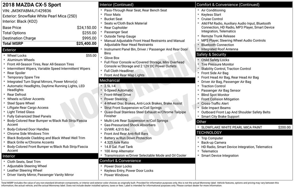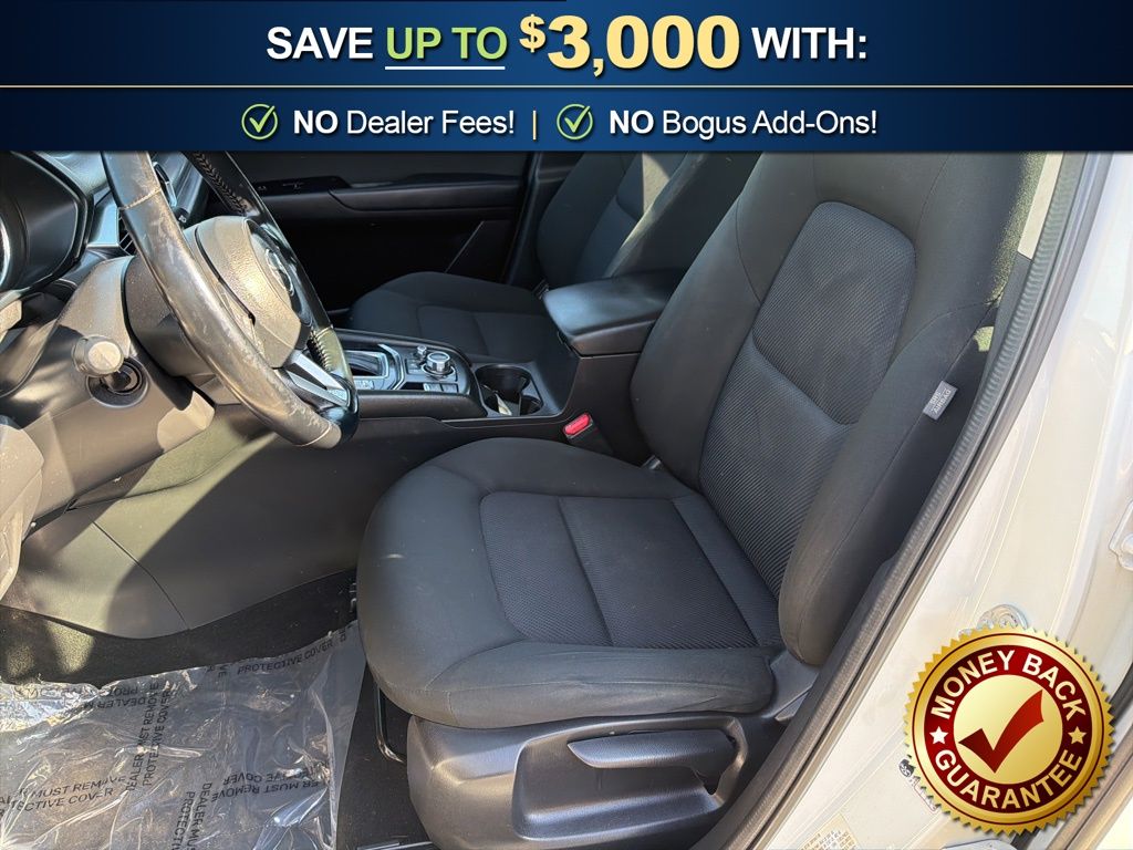 17 x 7J Aluminum Alloy Wheels, 4 Speakers, 4-Wheel Disc Brakes, 4.325 Axle Ratio, ABS brakes, Air Conditioning, Alloy wheels, AM/FM radio, Brake assist, Bumpers: body-color, Cloth Seat Trim, Delay-off headlights, Driver door bin, Driver vanity mirror, Dual front impact airbags, Dual front side impact airbags, Electronic Stability Control, Emergency communication system, Exterior Parking Camera Rear, Four wheel independent suspension, Front anti-roll bar, Front Bucket Seats, Front Center Armrest, Front reading lights, Illuminated entry, Leather Shift Knob, Low tire pressure warning, Occupant sensing airbag, Outside temperature display, Overhead airbag, Overhead console, Panic alarm, Passenger door bin, Passenger vanity mirror, Power door mirrors, Power steering, Power windows, Radio data system, Radio: AM/FM/HD Audio System, Rear anti-roll bar, Rear reading lights, Rear window defroster, Rear window wiper, Remote keyless entry, Slowflake White Pearl Mica Paint, Speed control, Speed-sensing steering, Split folding rear seat, Spoiler, Sport Shape Front Seats, Steering wheel mounted audio controls, Tachometer, Telescoping steering wheel, Tilt steering wheel, Traction control, Trip computer, Turn signal indicator mirrors, Variably intermittent wipers, Wheel Locks. 2018 Mazda CX-5 Sport