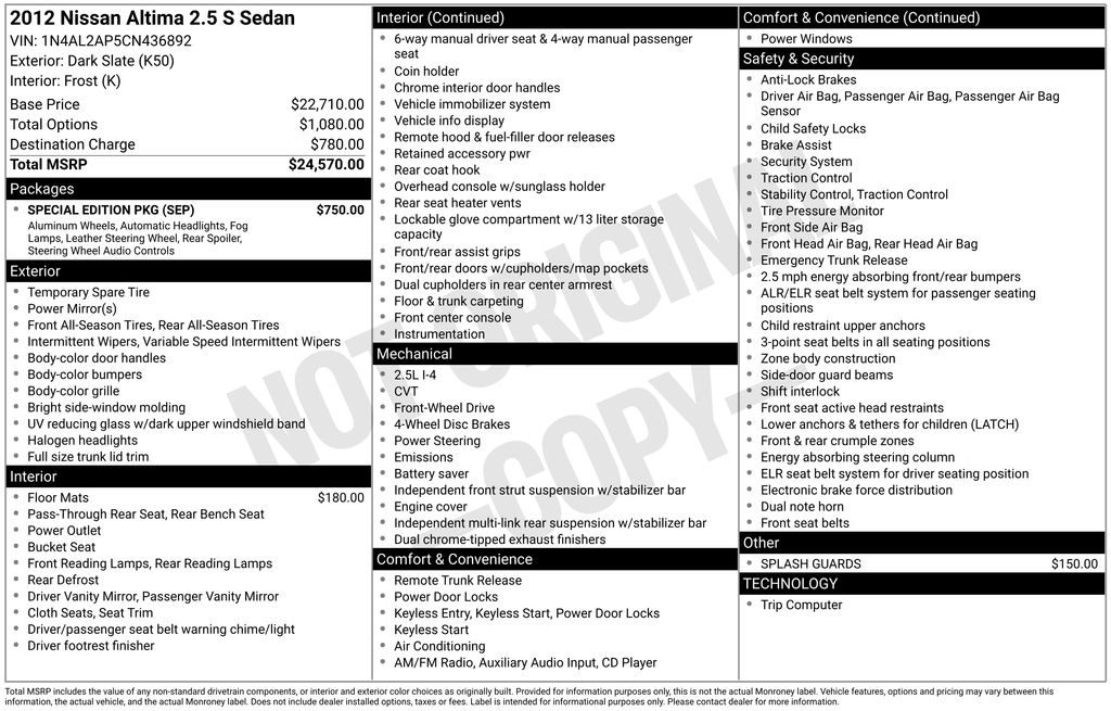 2012 Nissan Altima 2.5 S Dark Slate Metallic 2.5 S FWD CVT with Xtronic 2.5L I4 DOHC 16V CVT with Xtronic, 16" Alloy Wheels, 16" Wheels w/Full-Wheel Bolt-On Covers, 2.5 SL Badging, 4-Wheel Disc Brakes, 6 Speakers, ABS brakes, Air Conditioning, AM/FM radio, AM/FM/CD Radio, Anti-whiplash front head restraints, Auto On/Off Headlights, Bodyside moldings, Brake assist, Bumpers: body-color, Carpeted Floor & Trunk Mats (5 Piece), CD player, Delay-off headlights, Driver door bin, Driver vanity mirror, Dual front impact airbags, Dual front side impact airbags, Electronic Stability Control, Fog Lights, Four wheel independent suspension, Front anti-roll bar, Front Bucket Seats, Front Center Armrest w/Storage, Front reading lights, Illuminated entry, Leather-Wrapped Steering Wheel, Low tire pressure warning, Multi-Adjustable Reclining Front Bucket Seats, Occupant sensing airbag, Outside temperature display, Overhead airbag, Overhead console, Panic alarm, Passenger door bin, Passenger vanity mirror, Power door mirrors, Power steering, Power windows, Rear anti-roll bar, Rear reading lights, Rear seat center armrest, Rear Spoiler, Rear window defroster, Remote keyless entry, Security system, Special Edition Package (DISC), Speed control, Speed-sensing steering, Speed-Sensitive Wipers, Splash Guards, Split folding rear seat, Steering Wheel Audio Controls, Tachometer, Telescoping steering wheel, Tilt steering wheel, Traction control, Trip computer, Variably intermittent wipers, Velour Seat Trim, CVT with Xtronic.
