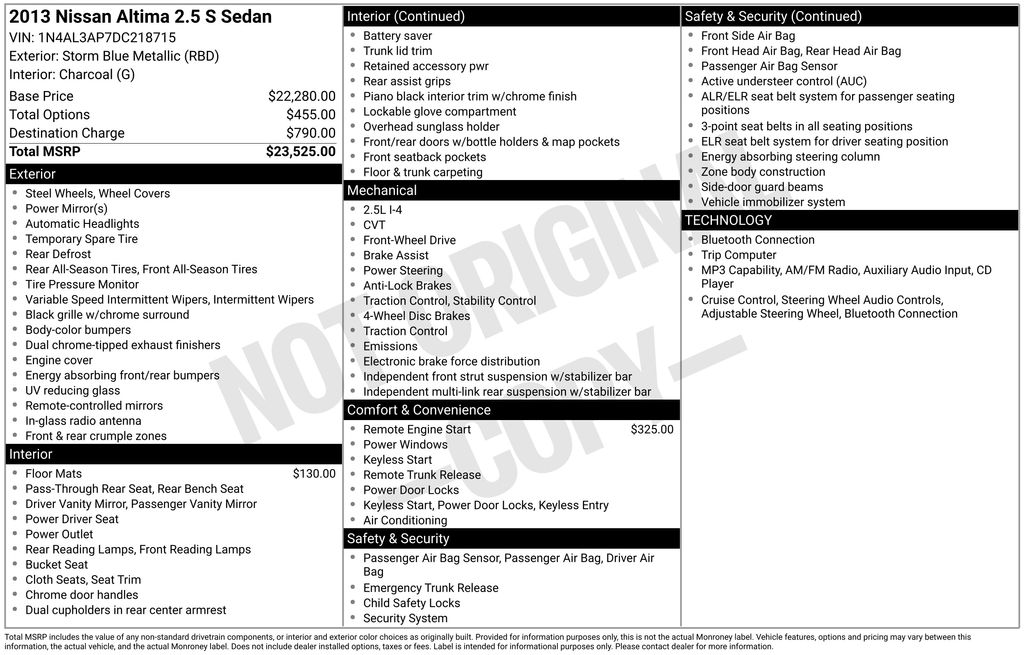 CVT with Xtronic, 16" x 7.0" Steel w/Full Covers Wheels, 4-Wheel Disc Brakes, 6 Speakers, ABS brakes, Air Conditioning, AM/FM radio, AM/FM/CD/MP3 Audio System, Brake assist, Bumpers: body-color, CD player, Cloth Seat Trim, Delay-off headlights, Driver door bin, Driver vanity mirror, Dual front impact airbags, Dual front side impact airbags, Electronic Stability Control, Four wheel independent suspension, Front anti-roll bar, Front Bucket Seats, Front Center Armrest w/Storage, Front reading lights, Fully automatic headlights, Illuminated entry, Low tire pressure warning, Occupant sensing airbag, Outside temperature display, Overhead airbag, Overhead console, Panic alarm, Passenger door bin, Passenger vanity mirror, Power door mirrors, Power driver seat, Power steering, Power windows, Radio data system, Rear anti-roll bar, Rear reading lights, Rear seat center armrest, Rear window defroster, Remote keyless entry, Security system, Speed control, Speed-sensing steering, Speed-Sensitive Wipers, Split folding rear seat, Steering wheel mounted audio controls, Tachometer, Telescoping steering wheel, Tilt steering wheel, Traction control, Trip computer, Variably intermittent wipers, CVT with Xtronic. 2013 Nissan Altima 2.5 S