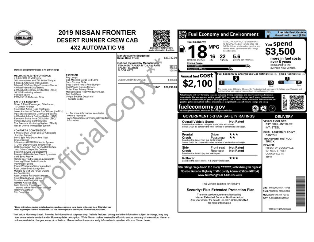 2019 Nissan Frontier Desert Runner Brilliant Silver Metallic Desert Runner RWD 5-Speed Automatic with Overdrive 4.0L V6 DOHC 16" Off-Road Design Alloy Wheels, 3.133 Axle Ratio, 4-Wheel Disc Brakes, 6 Speakers, ABS brakes, Air Conditioning, Alloy wheels, AM/FM radio, Anti-whiplash front head restraints, Bed Liner, Bed Liner/Trailer Hitch Package, Bumpers: body-color, Driver door bin, Driver vanity mirror, Dual front impact airbags, Dual front side impact airbags, Electronic Stability Control, Exterior Parking Camera Rear, Floor Mats, Front anti-roll bar, Front Bucket Seats, Front Center Armrest, Front fog lights, Front reading lights, Front wheel independent suspension, Illuminated entry, Low tire pressure warning, Occupant sensing airbag, Overhead airbag, Overhead console, Panic alarm, Passenger door bin, Passenger vanity mirror, Power door mirrors, Power steering, Power windows, Radio data system, Radio: AM/FM w/Auxiliary, Rear step bumper, Remote keyless entry, Speed control, Speed-sensing steering, Splash Guards, Split folding rear seat, Steering wheel mounted audio controls, Tachometer, Tilt steering wheel, Traction control, Trailer Hitch (PIO), Trip computer, Unique Cloth Seat Trim, Variably intermittent wipers, Voltmeter.