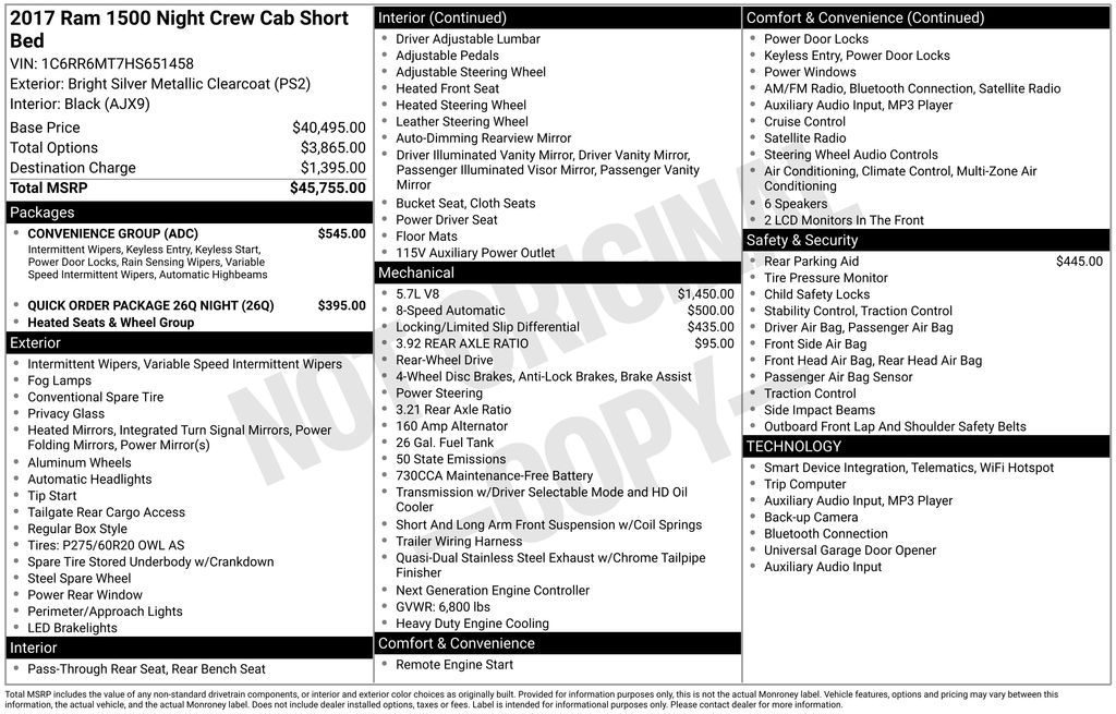 2017 Ram 1500 Night RWD 8-Speed Automatic HEMI 5.7L V8 Multi Displacement VVT Bright Silver Metallic Clearcoat
